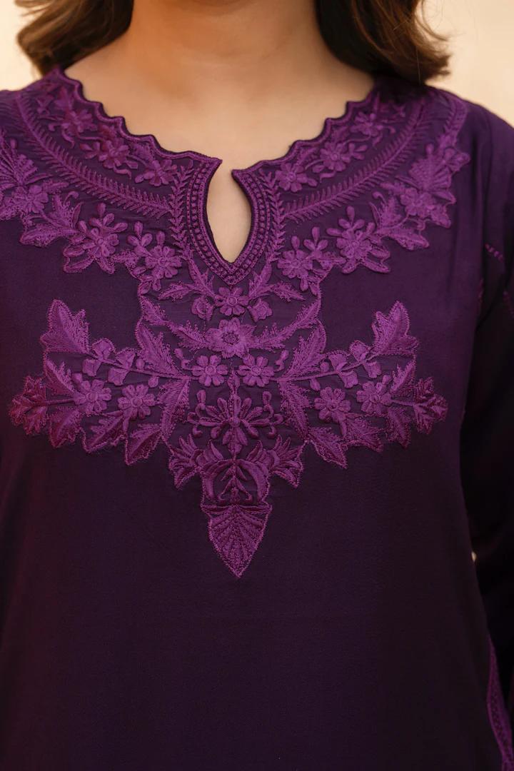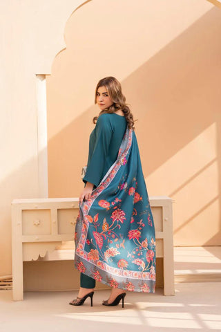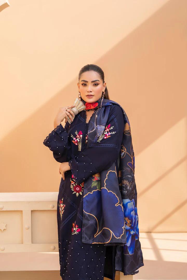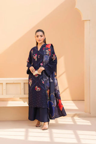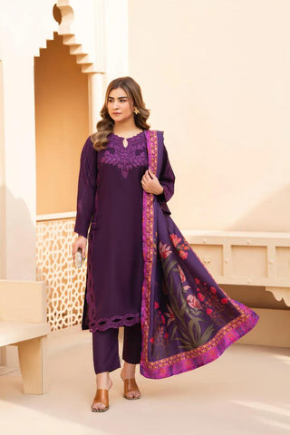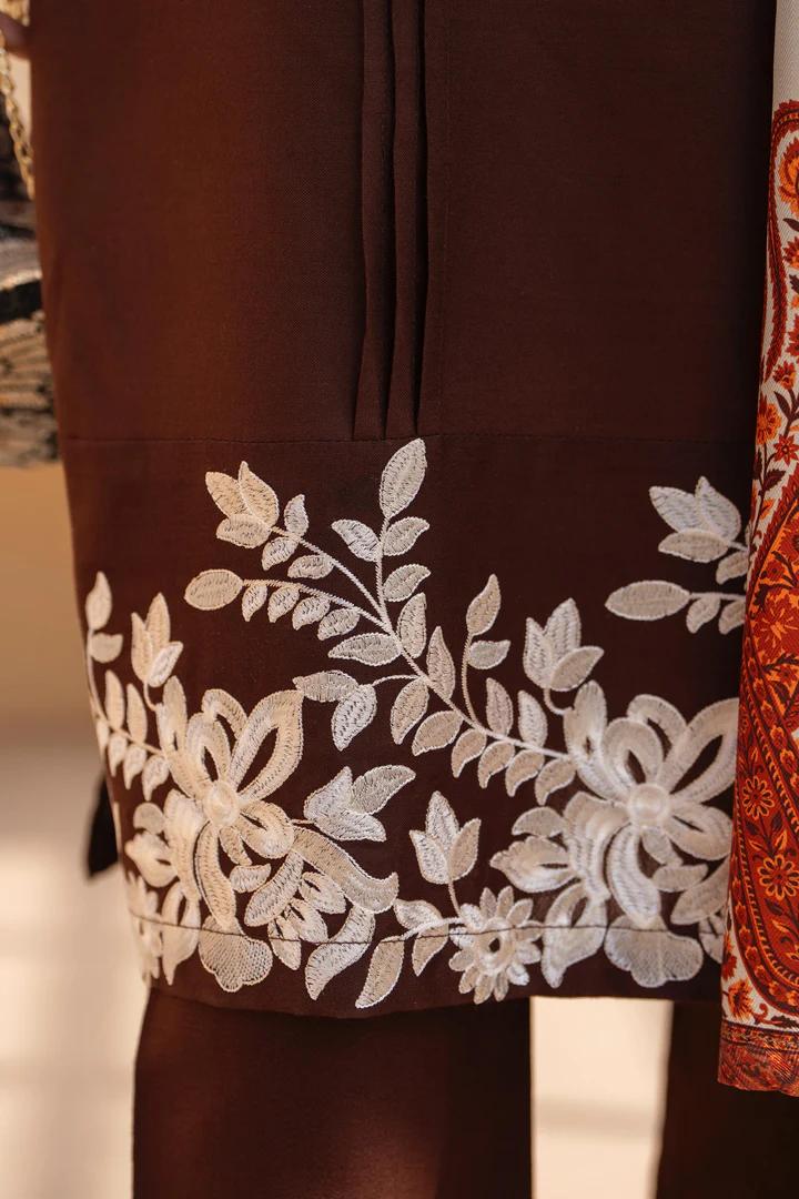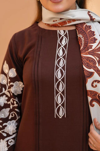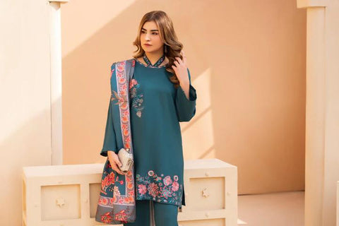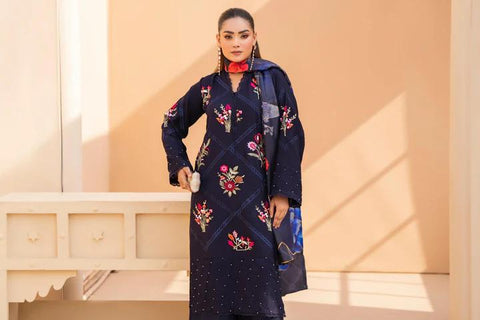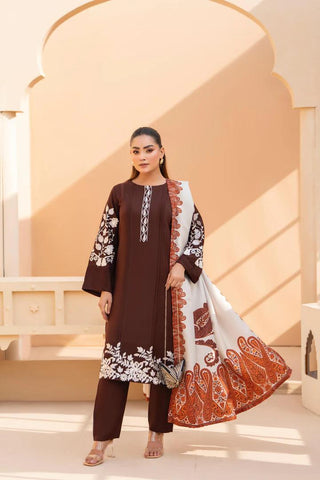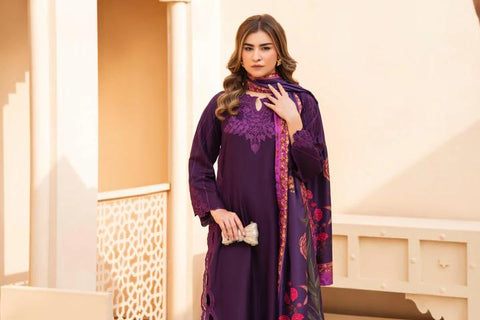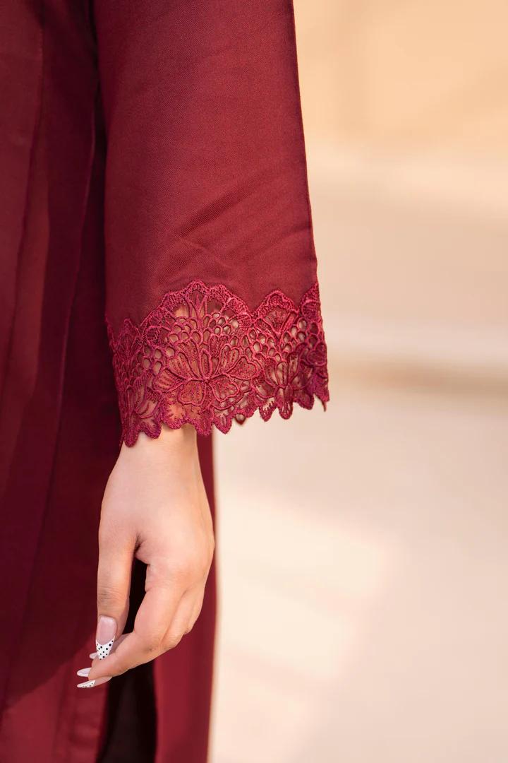 Crafted from premium slub linen, this deep colour collection ensemble radiates timeless sophistication. The straight-cut kameez features intricate tonal embroidery across the neckline and hem, complemented by delicate lace detailing on the sleeves. Paired with matching trousers and a beautifully woven dupatta, it's a perfect blend of elegance and comfort - ideal for both festive gatherings and elegant evenings.