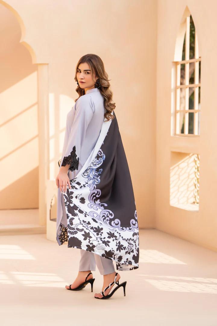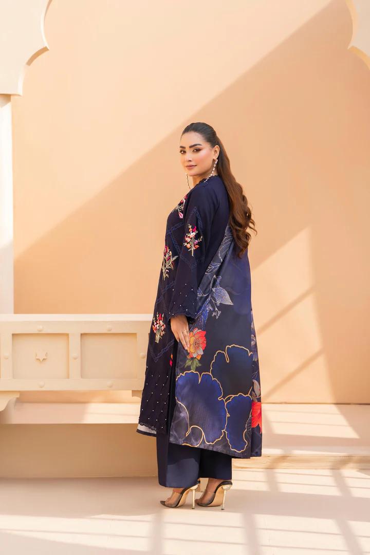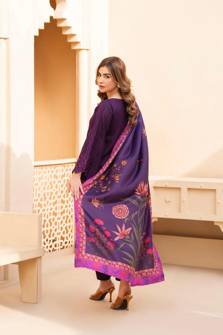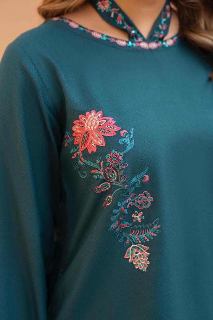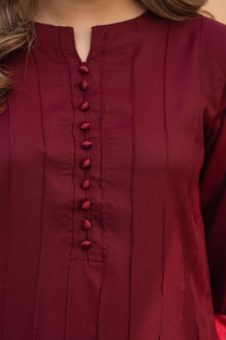 Crafted from premium slub linen, this deep colour collection ensemble radiates timeless sophistication. The straight-cut kameez features intricate tonal embroidery across the neckline and hem, complemented by delicate lace detailing on the sleeves. Paired with matching trousers and a beautifully woven dupatta, it's a perfect blend of elegance and comfort - ideal for both festive gatherings and elegant evenings.