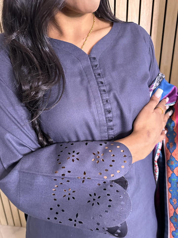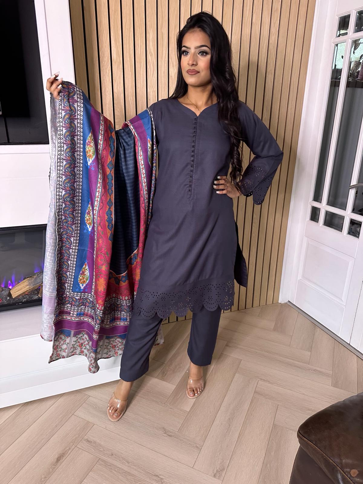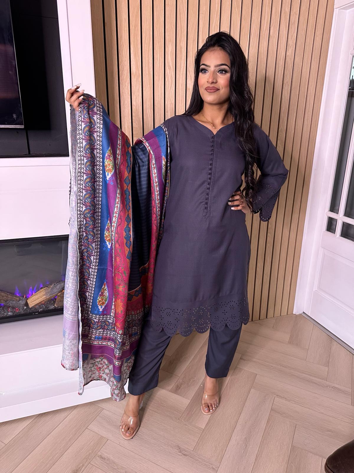 Product Description: A beautiful 3 piece suit by designer brand Raniya. This suit is sure to make a statement with the trendy Dhanak Laserkari design on the sleeves and kameez hem. It is accompanied with a cosy Pashmina Shawl - perfect for the Autumn/Winter season.