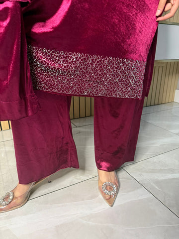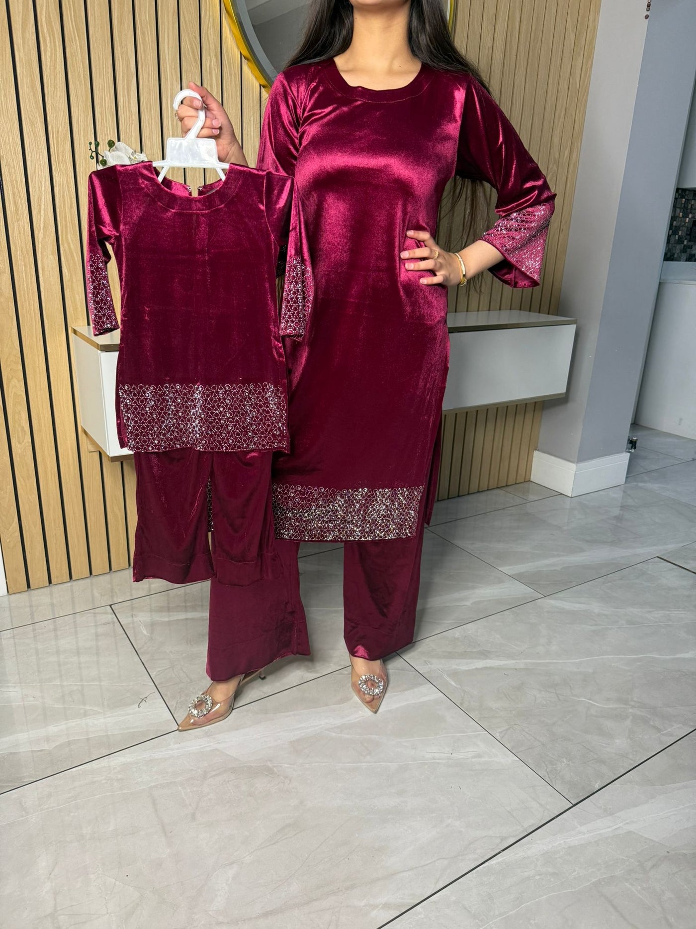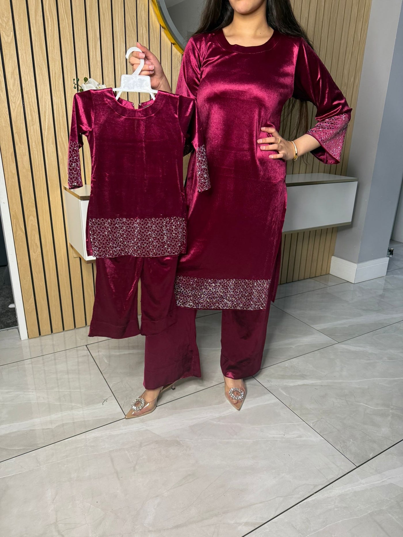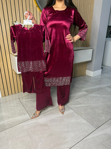 Aliyah 2pc Diamond Velvet Mother & Daughter Suits U3-B4 - Maroon / Small