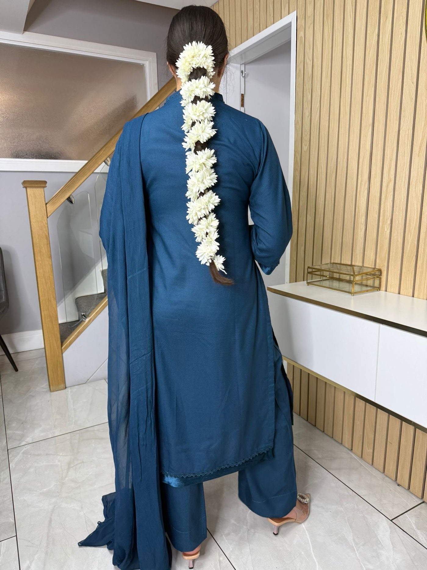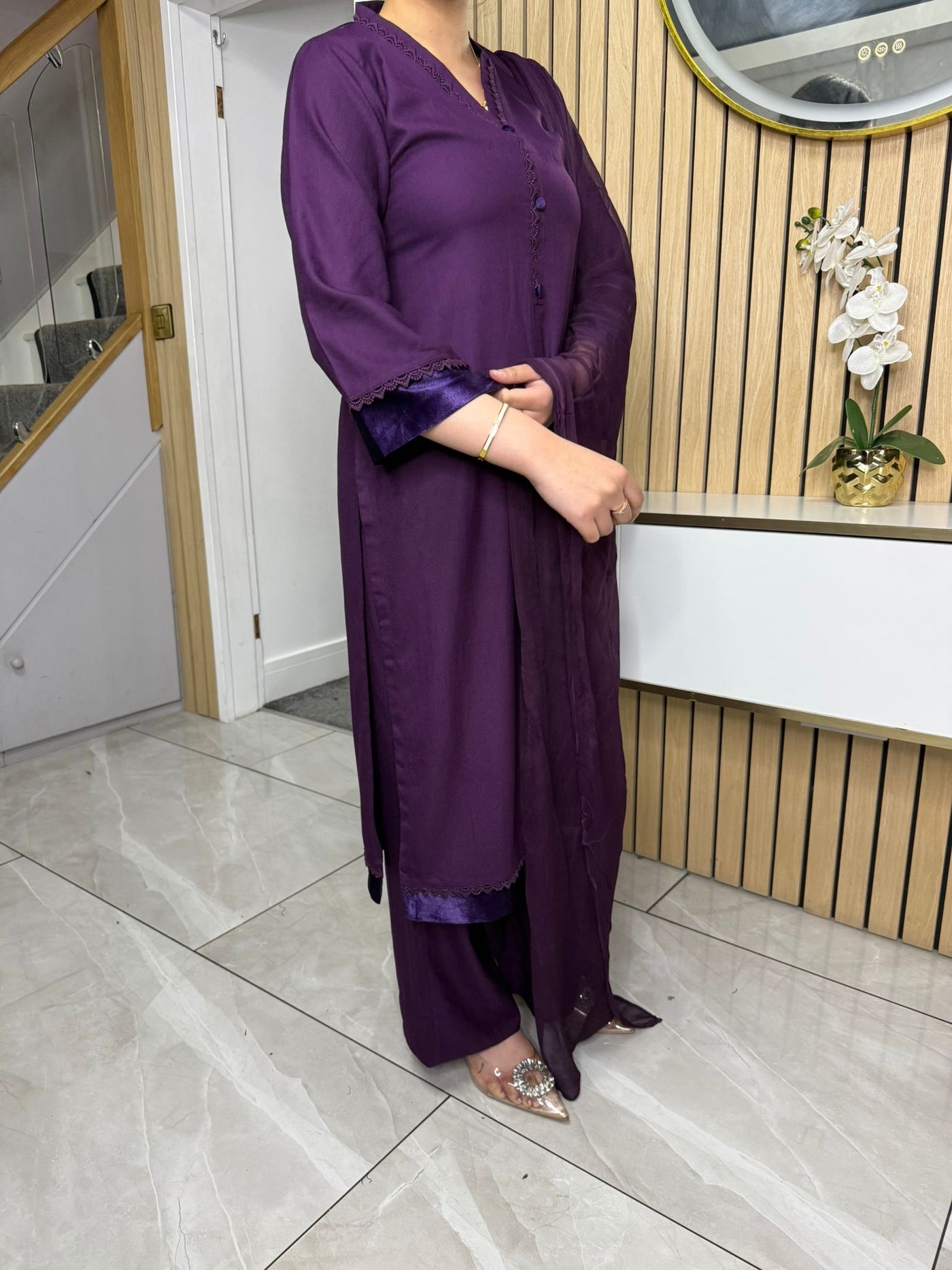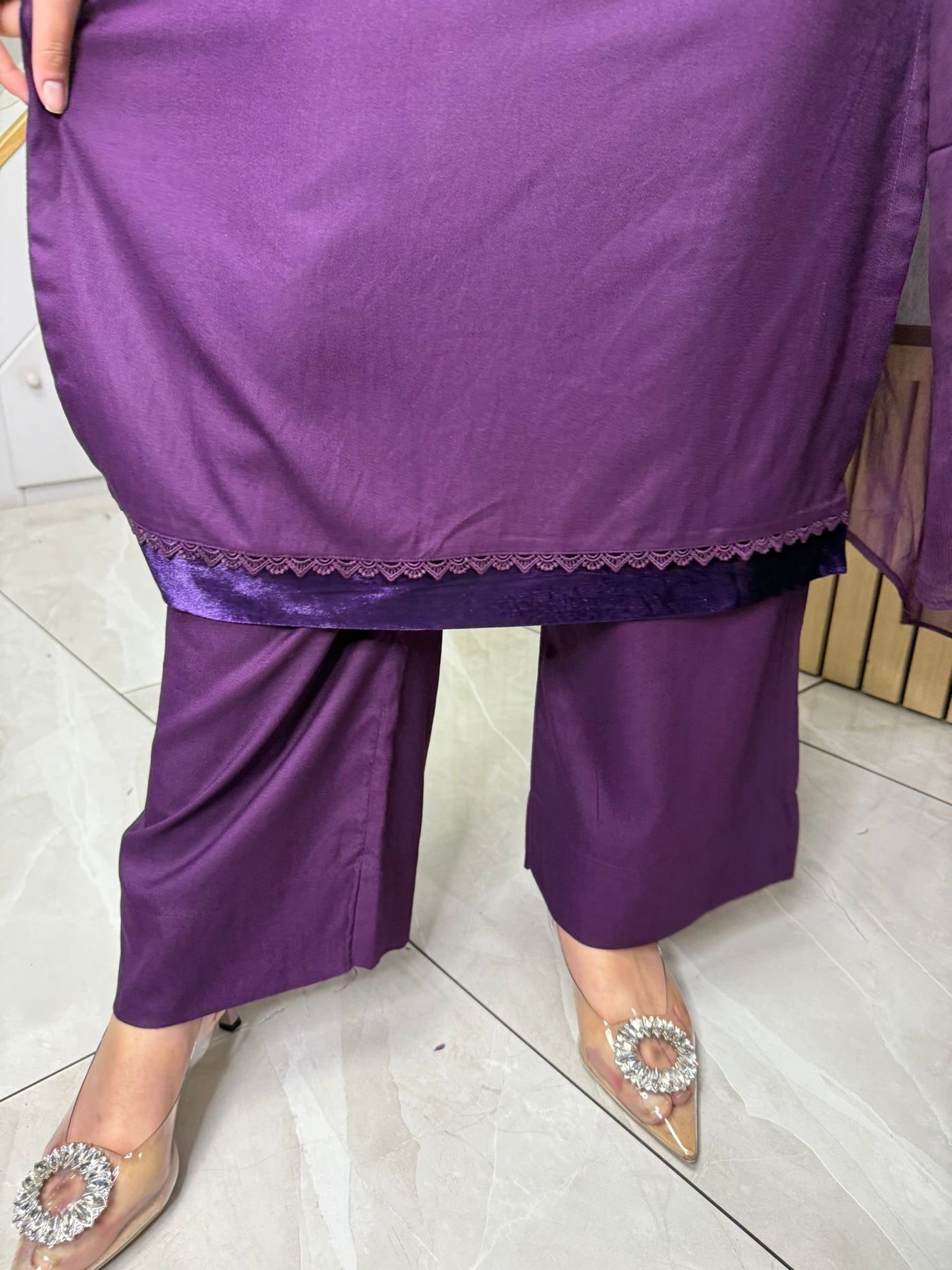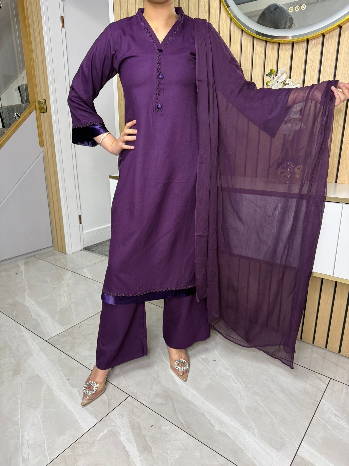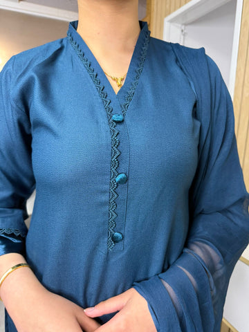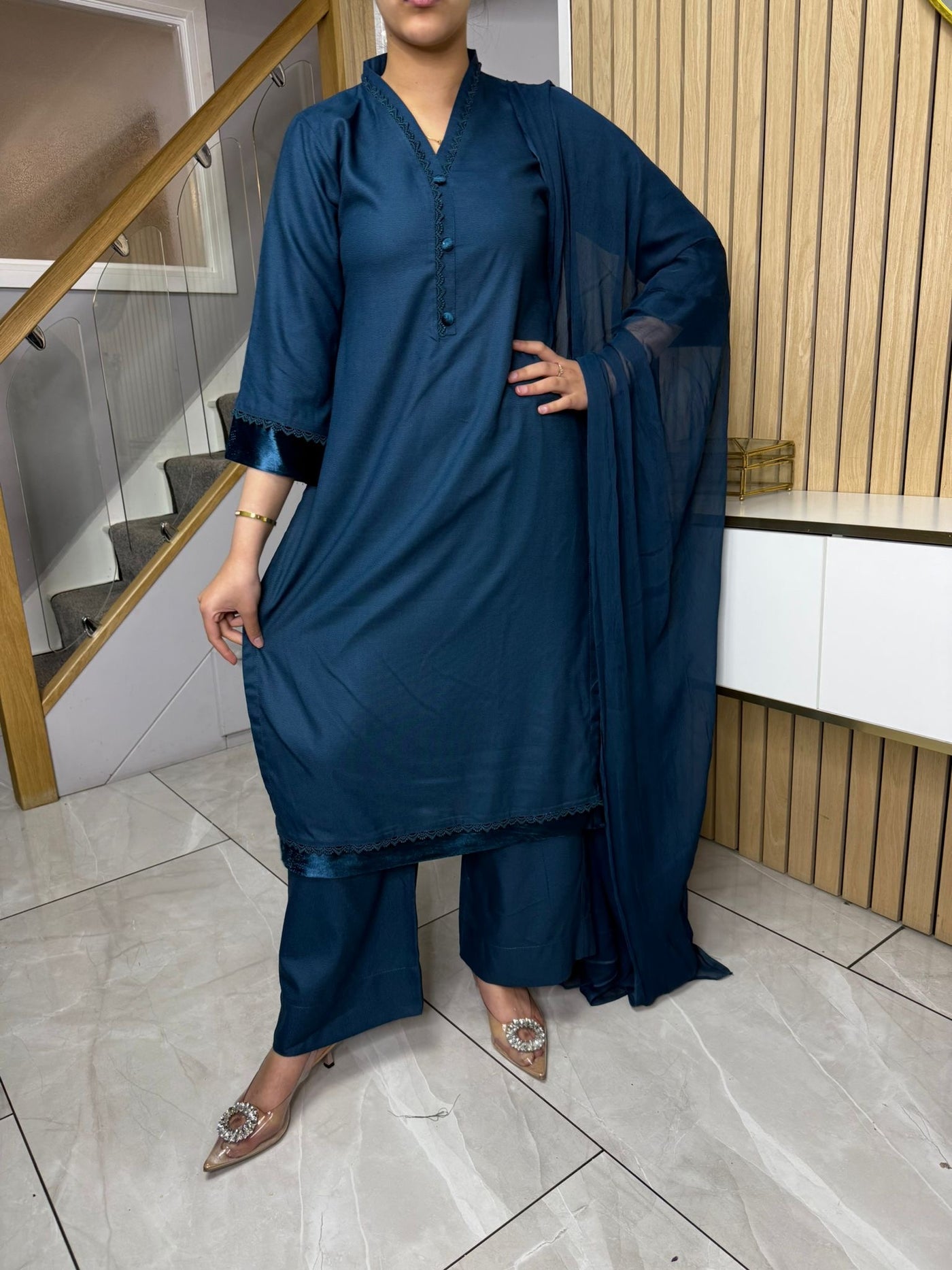 Product Description: This elegant 3-piece Marina suit features a beautifully detailed neckline with lace and buttons, complemented by suede detailing on the kameez and sleeves, offering a touch of sophistication. The set includes comfortable palazzo trousers and a flowing chiffon dupatta, creating a complete and stylish look, available in either blue or purple.