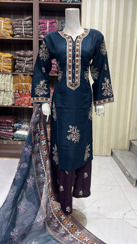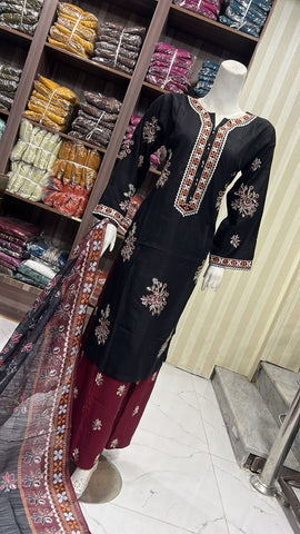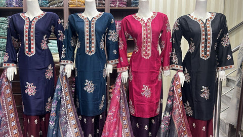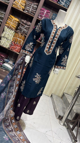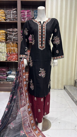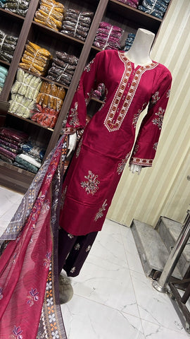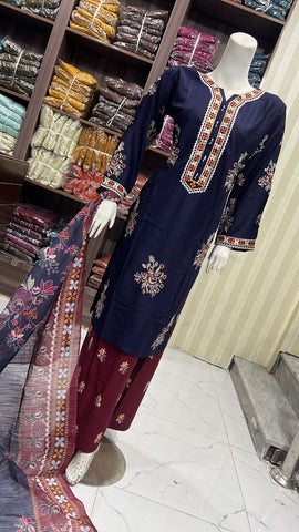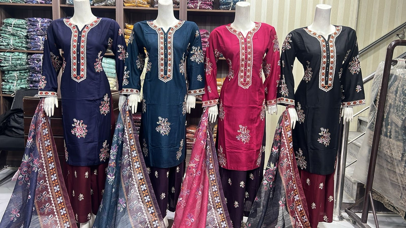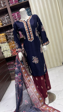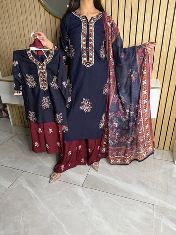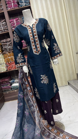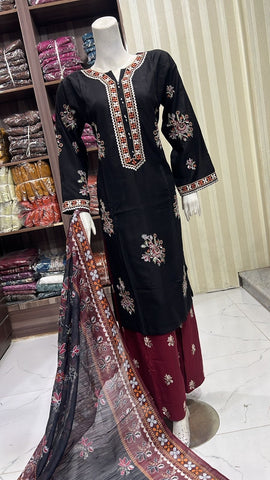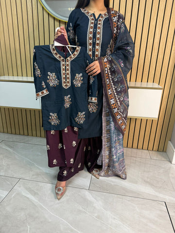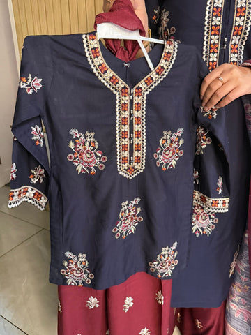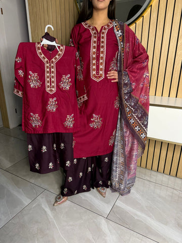 Product description: Celebrate Eid in style with our exquisite 3-piece linen collection, perfect for mothers and daughters. This elegant set features a kameez and contrasting Plazzo trousers, crafted from luxurious linen fabric for a graceful drape and comfortable feel. The kameez is adorned with delicate gold neckline detailing and matching detail on the shalwar. The outfit is completed with a chiffon dupatta, providing a touch of ethereal beauty. This collection is designed to offer a stunning contrast in colours, where the kameez stands out.
