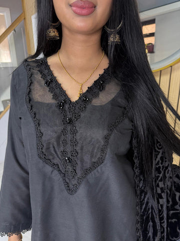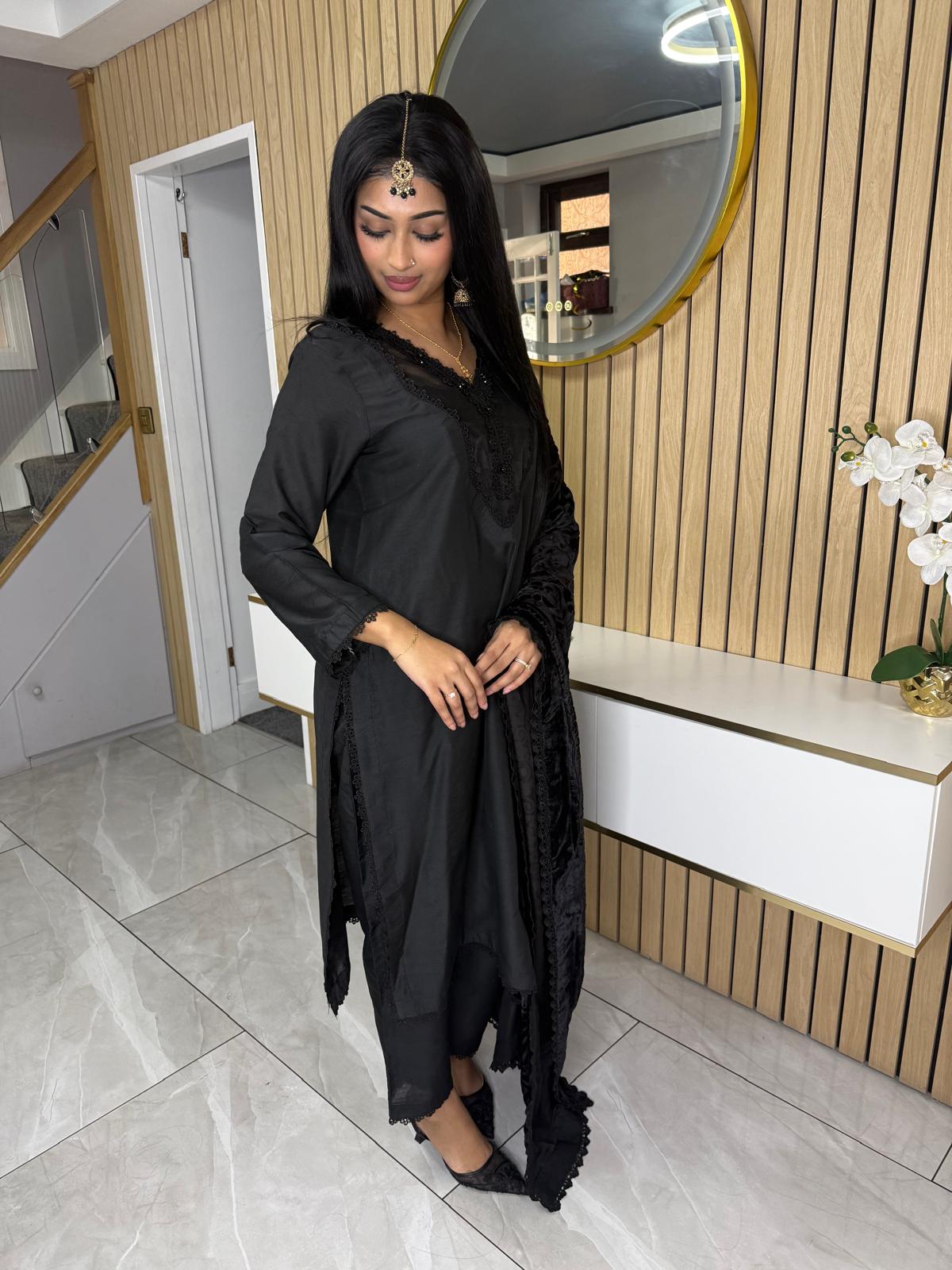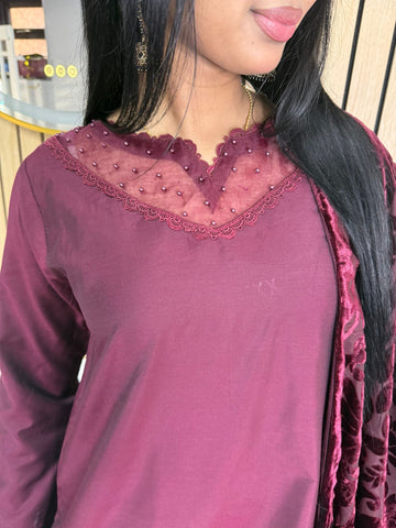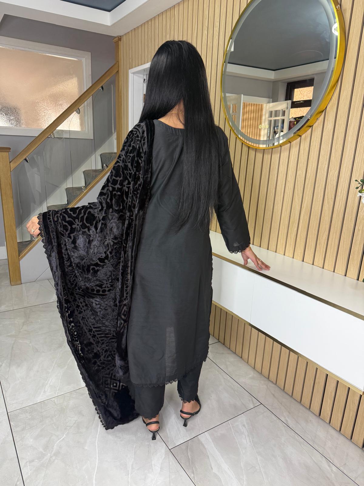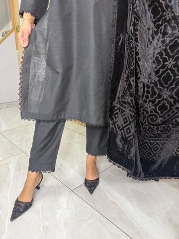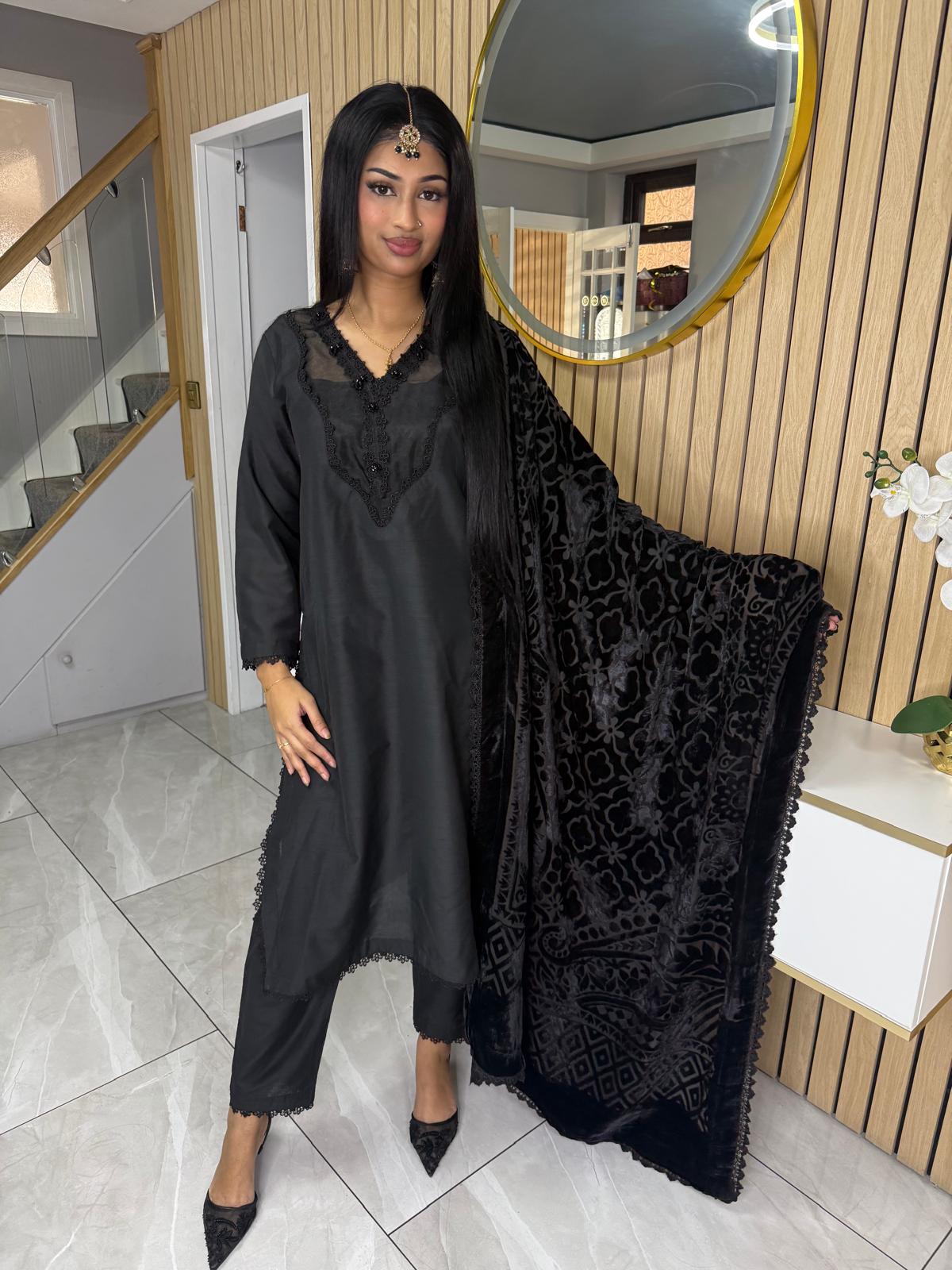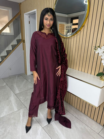 Product Description:Elevate your Eid wardrobe with our exquisite three-piece Raw Silk suit. This elegant ensemble features intricate net detailing on the neckline and delicate lace detailing along the borders, adding a touch of sophistication. The set is beautifully completed with a luxurious palachi shawl, providing warmth and a touch of glamour. Available in two timeless colours: Maroon and Black. This suit is designed to make you feel confident and elegant during your celebrations.