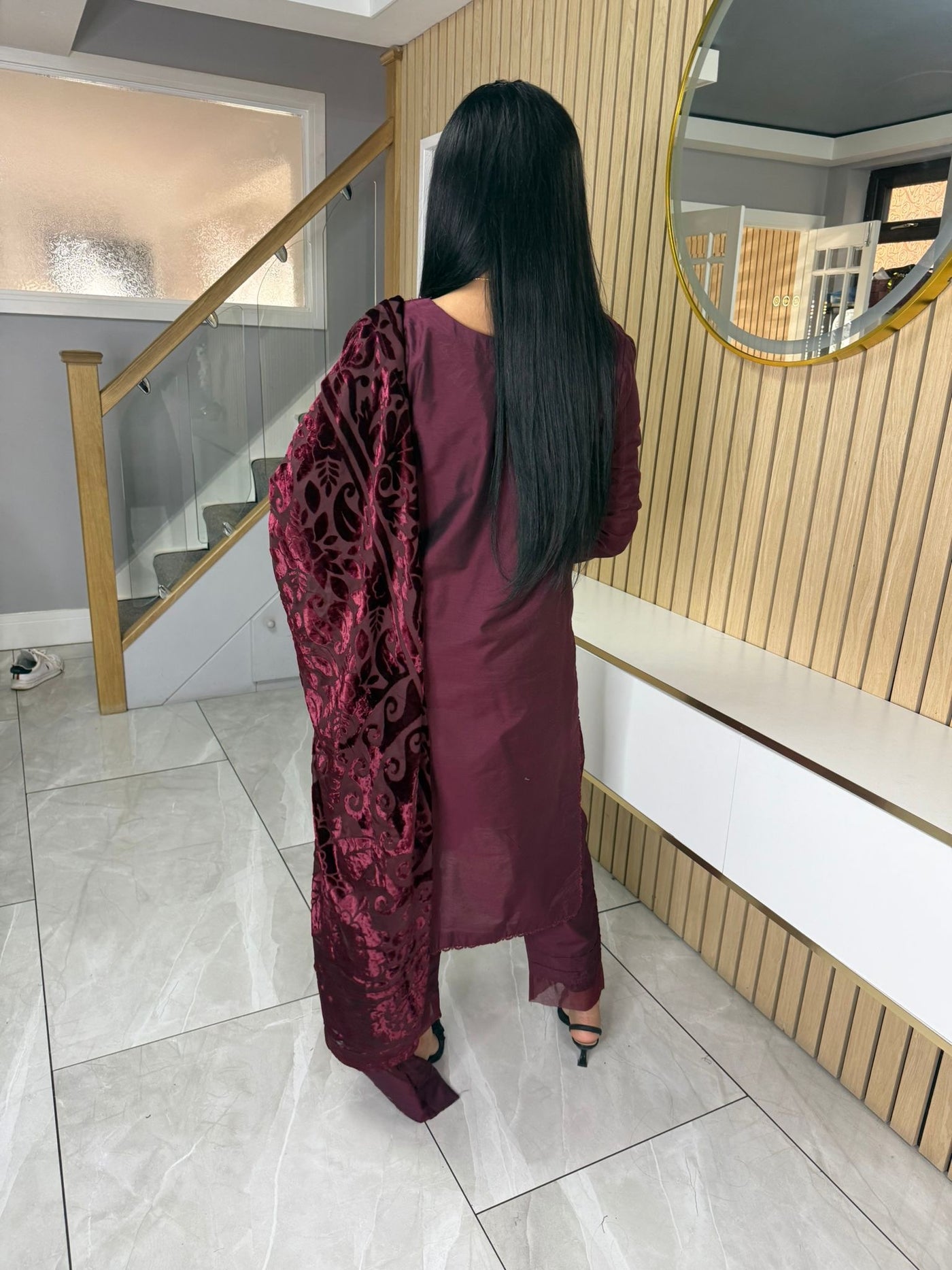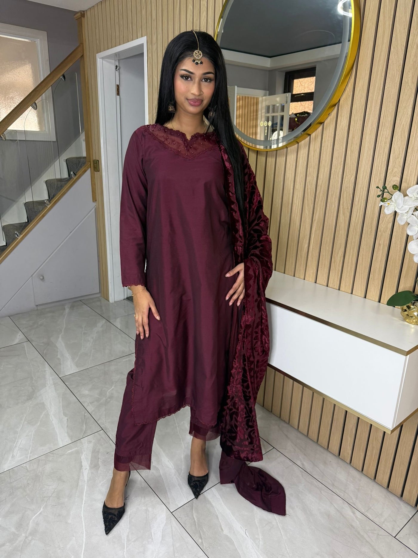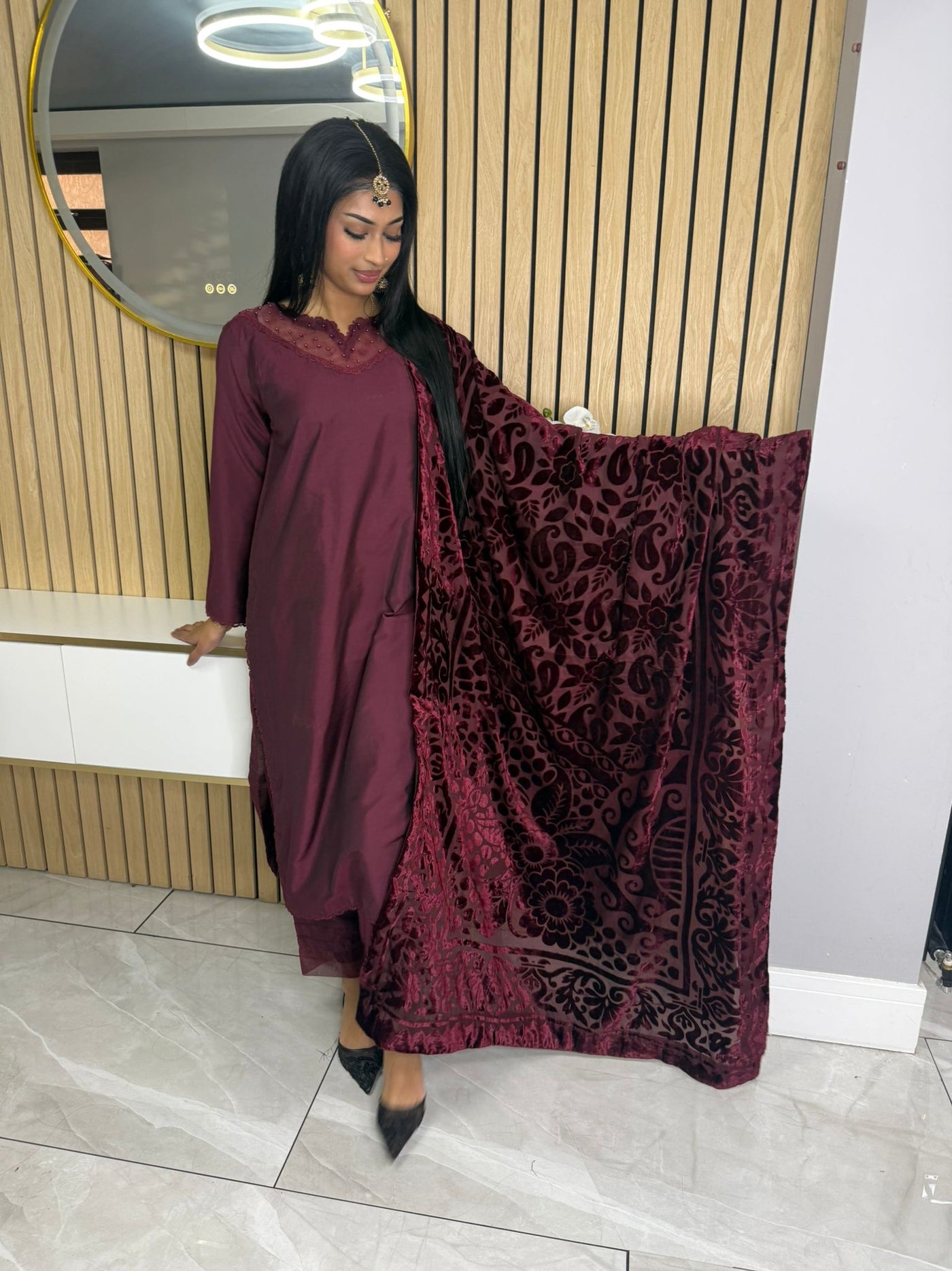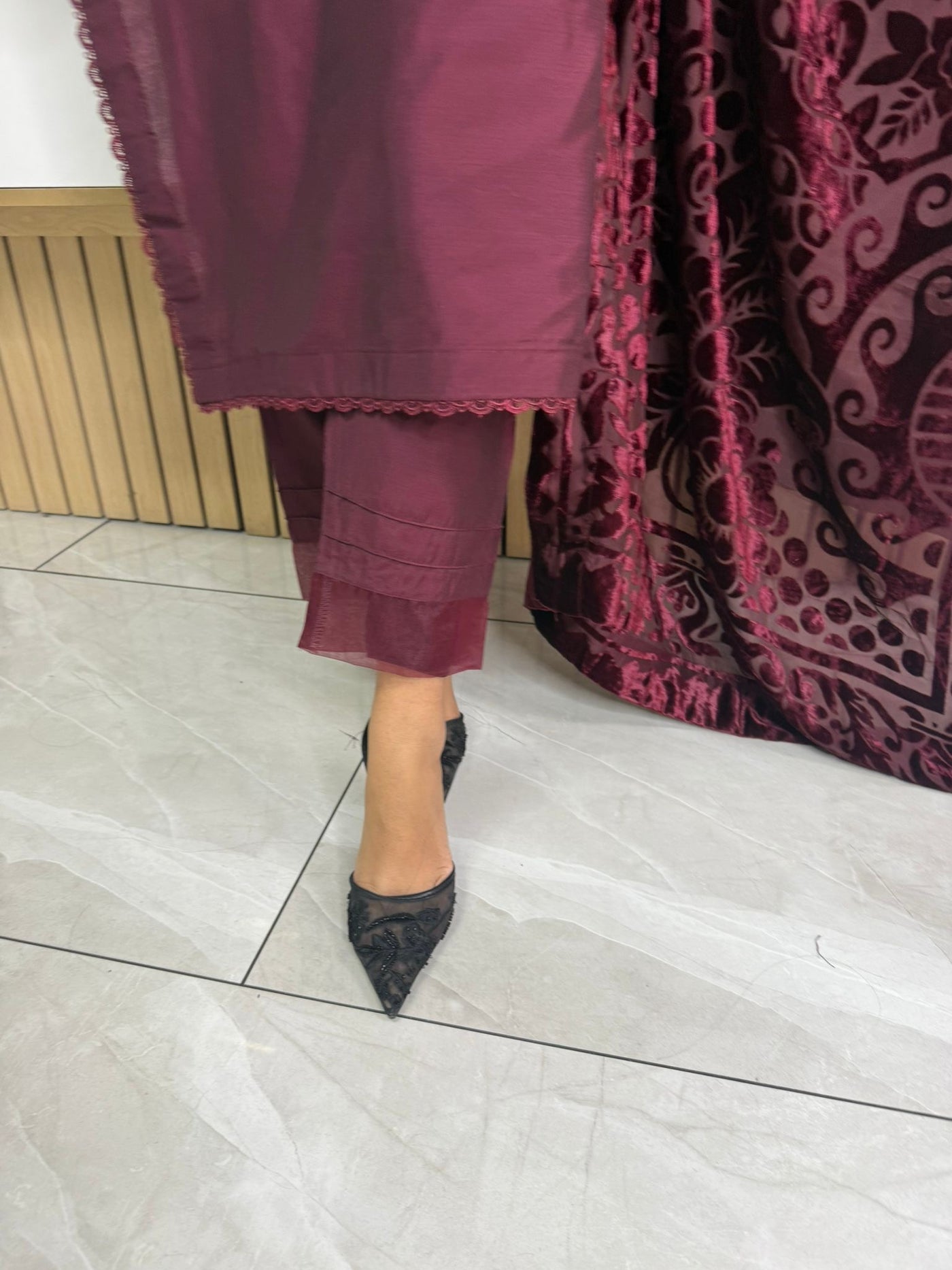 Product Description:Elevate your Eid wardrobe with our exquisite three-piece Raw Silk suit. This elegant ensemble features intricate net detailing on the neckline and delicate lace detailing along the borders, adding a touch of sophistication. The set is beautifully completed with a luxurious palachi shawl, providing warmth and a touch of glamour. Available in two timeless colours: Maroon and Black. This suit is designed to make you feel confident and elegant during your celebrations.