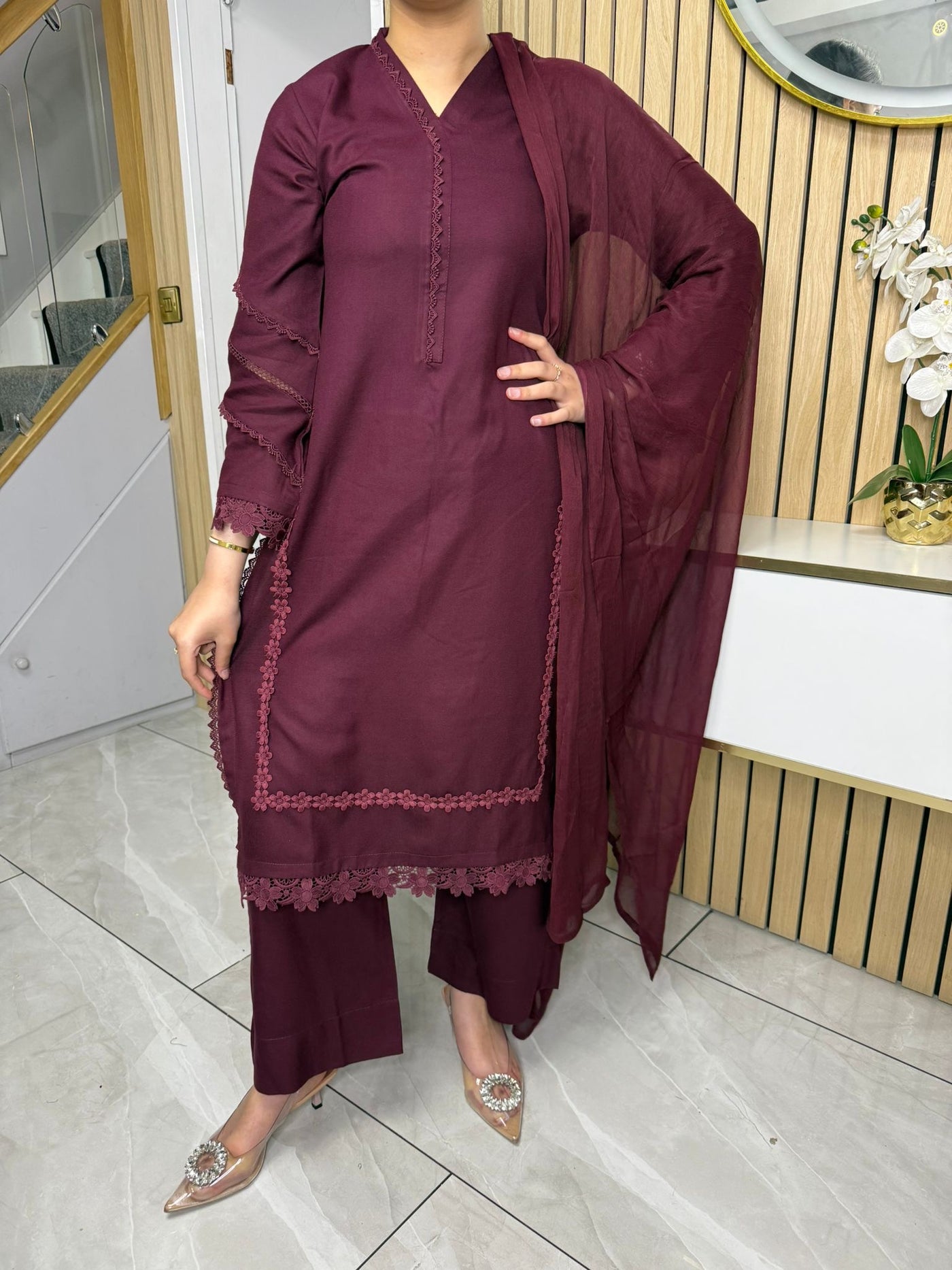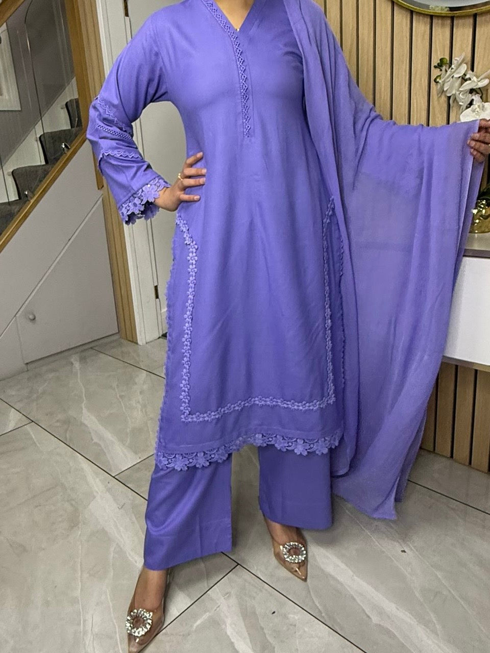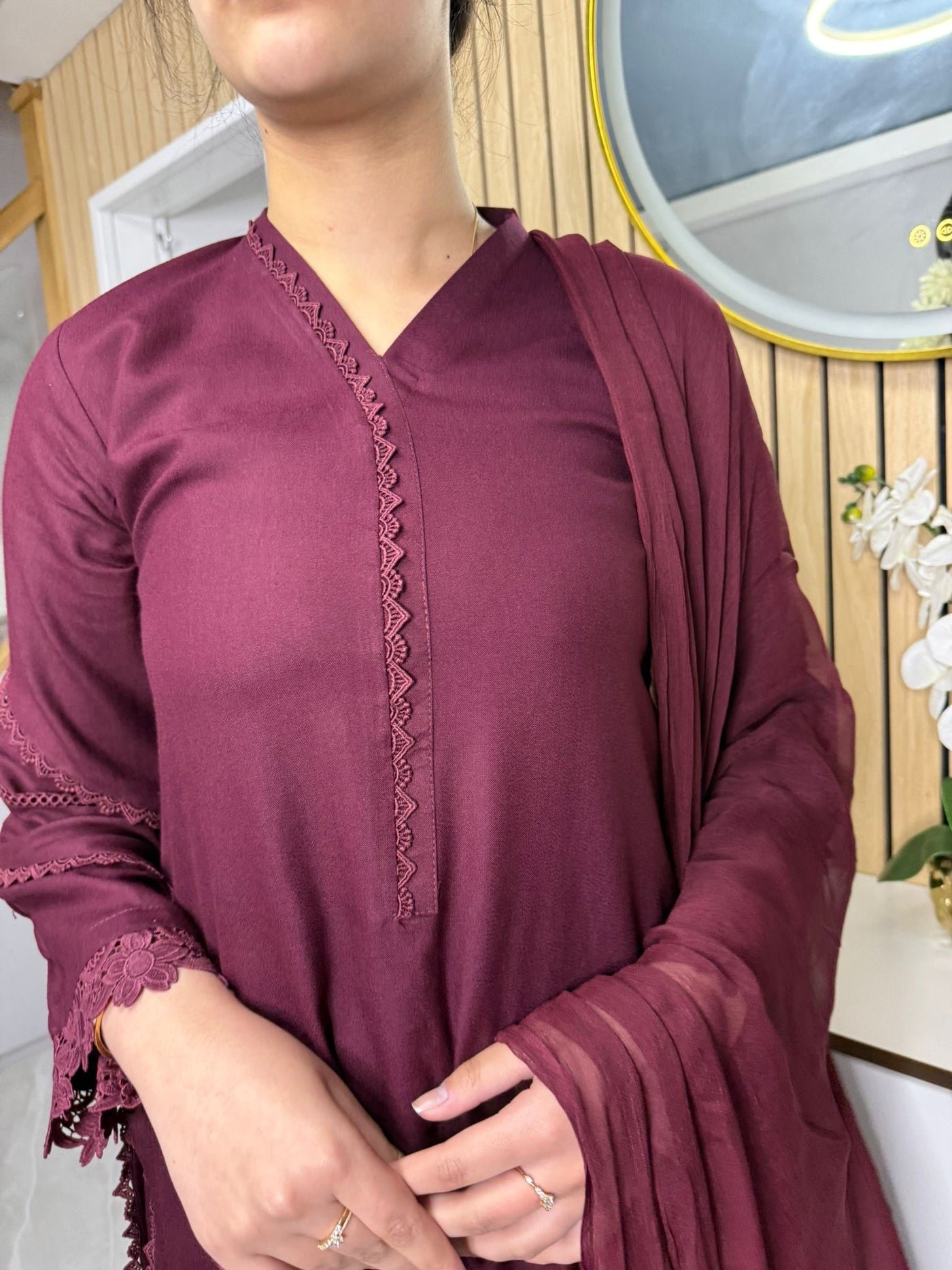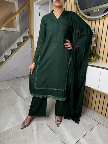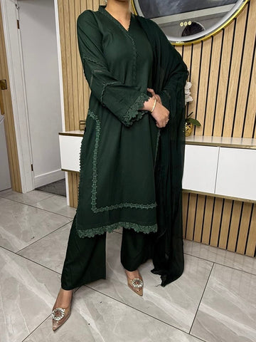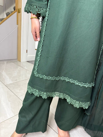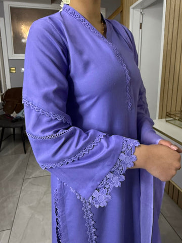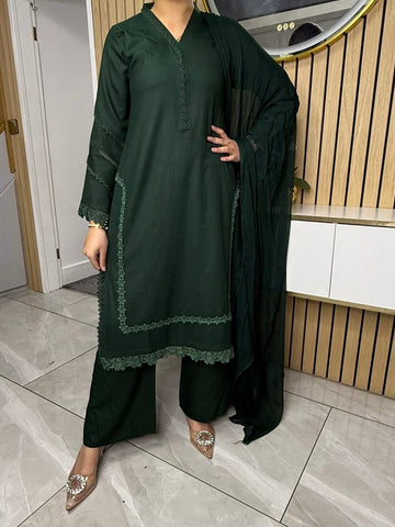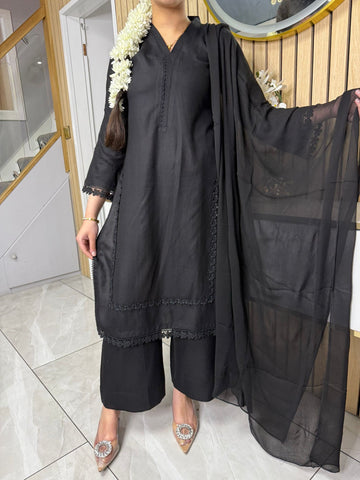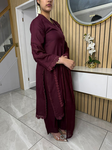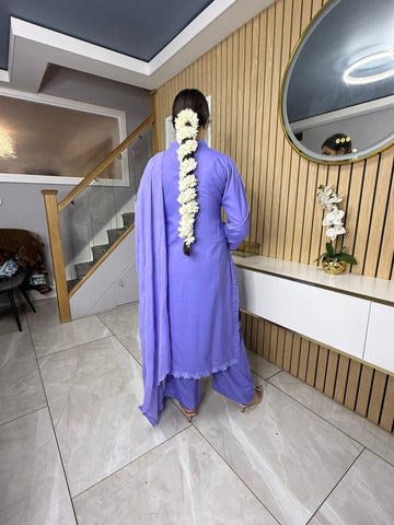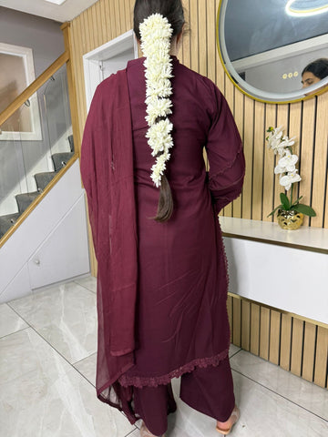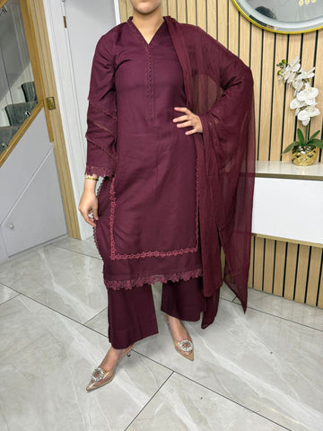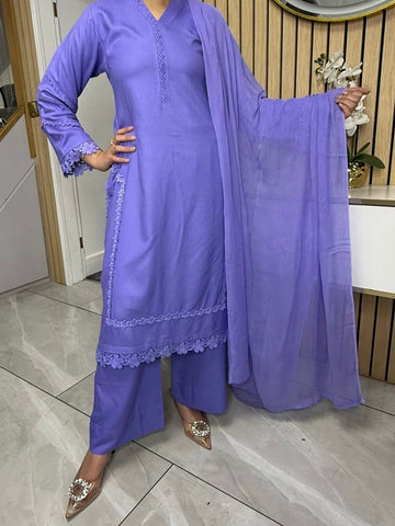 Product Description:This elegant 3-piece suit features a long kameez with lace embroidery along the sleeves and neckline, paired with comfortable palazzo trousers and a flowing chiffon dupatta. The kameez's lace adds a touch of sophistication, the palazzo trousers offer a contemporary fit, and the plain chiffon dupatta completes the look, making it a versatile ensemble suitable for various occasions and available in lilac, black, green and maroon