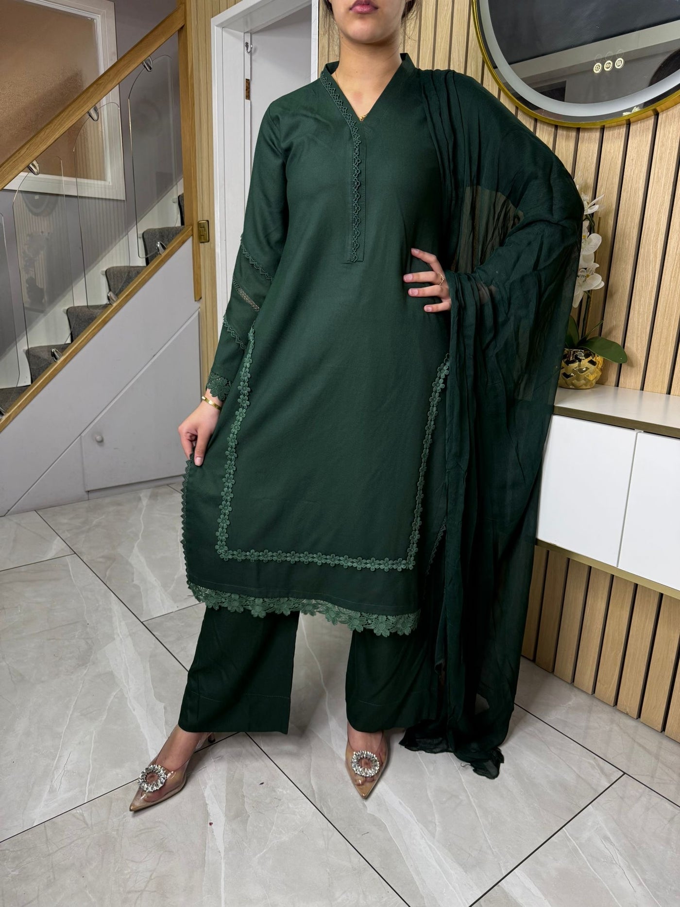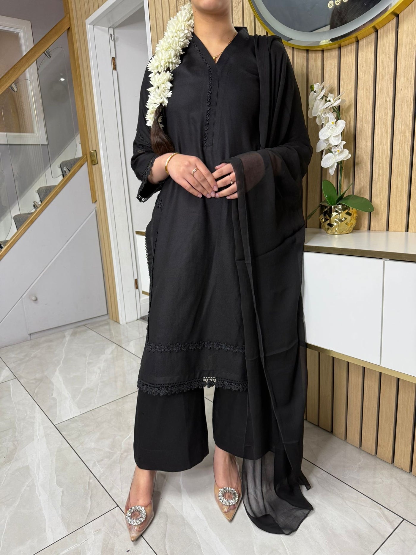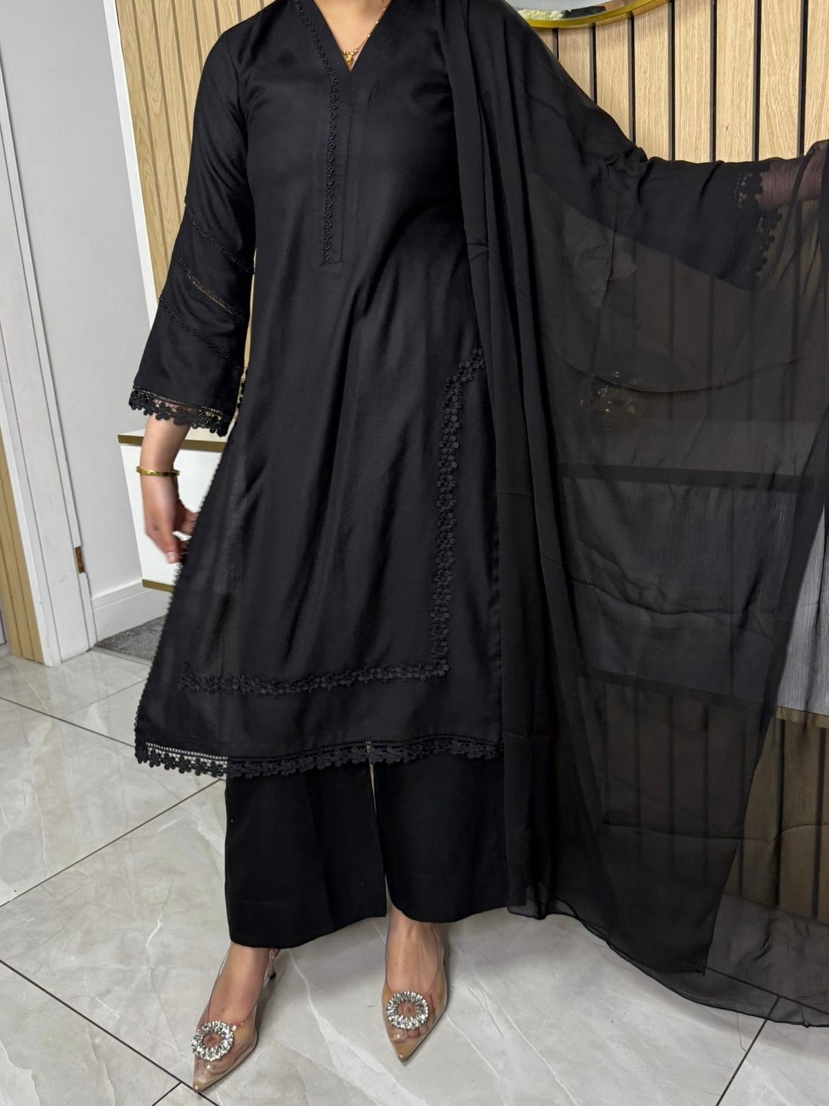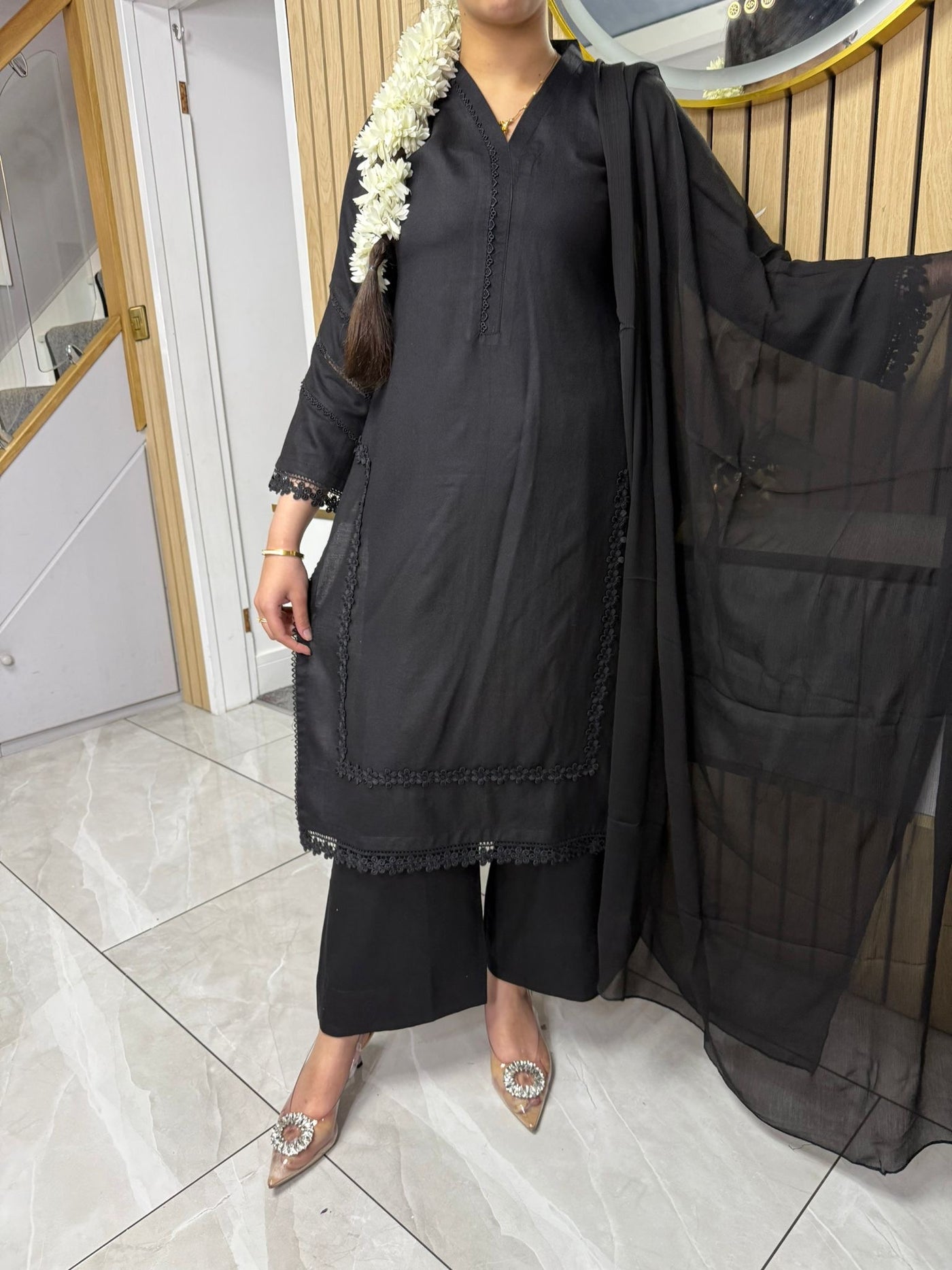 Product Description:This elegant 3-piece suit features a long kameez with lace embroidery along the sleeves and neckline, paired with comfortable palazzo trousers and a flowing chiffon dupatta. The kameez's lace adds a touch of sophistication, the palazzo trousers offer a contemporary fit, and the plain chiffon dupatta completes the look, making it a versatile ensemble suitable for various occasions and available in lilac, black, green and maroon