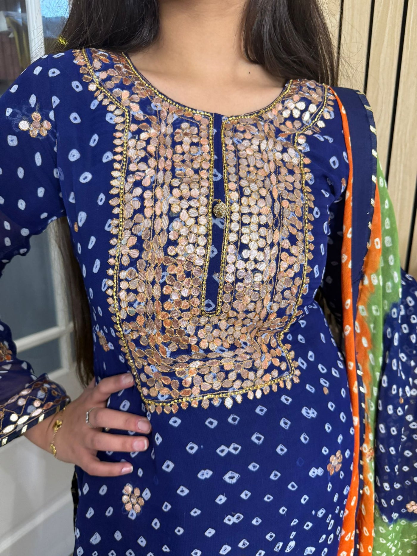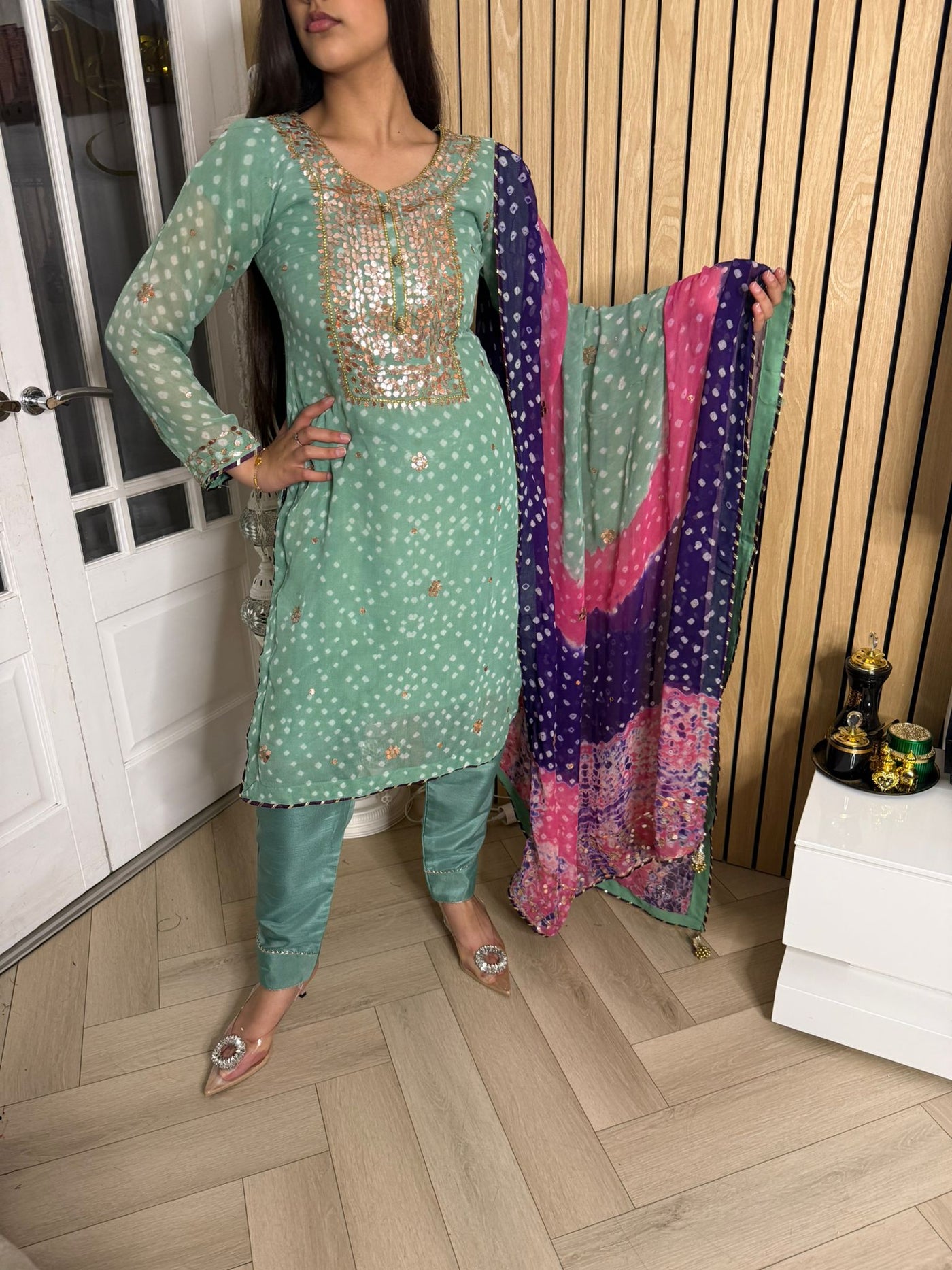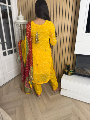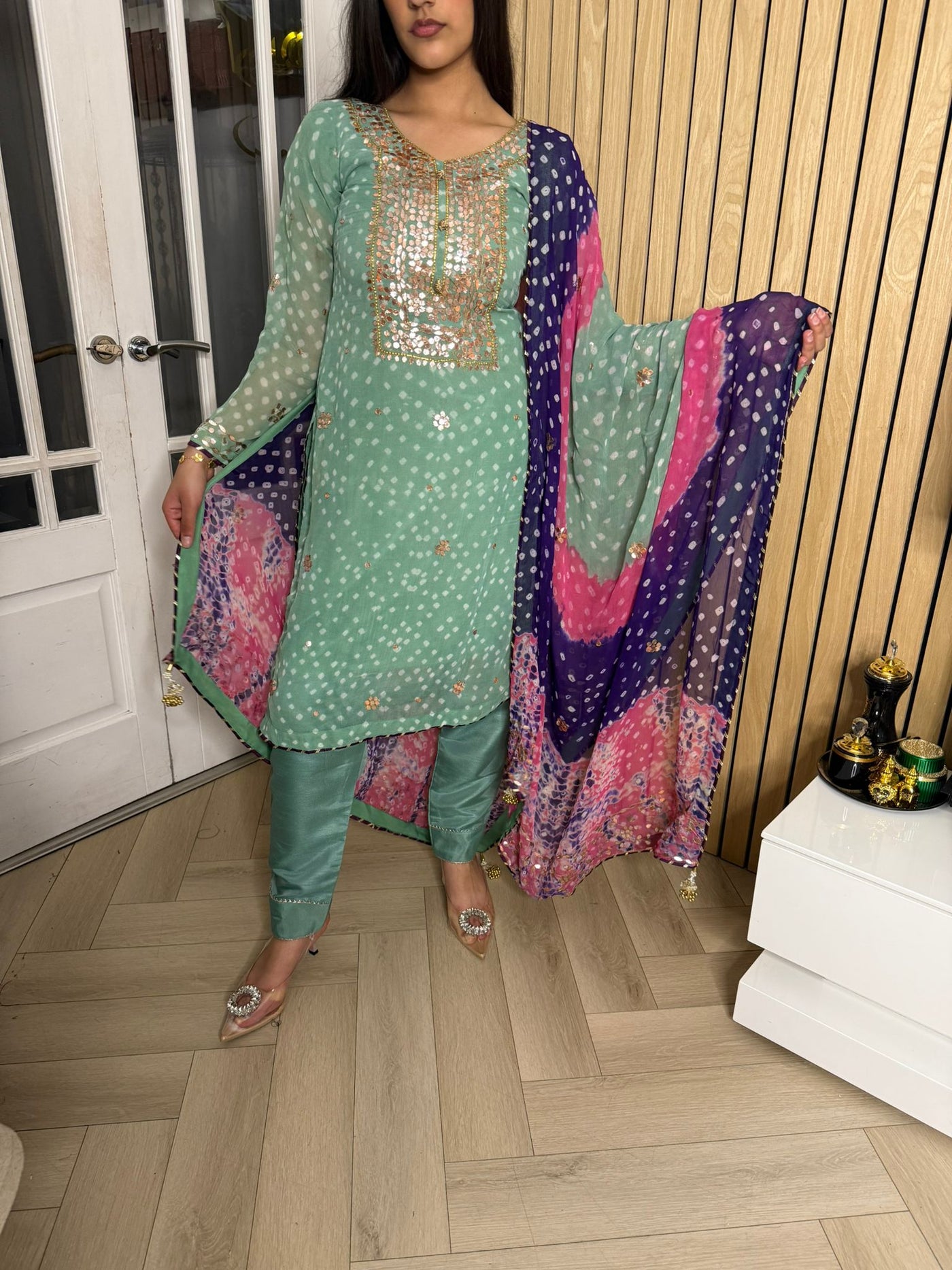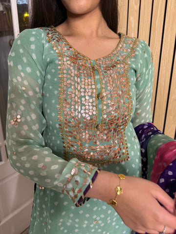 Product Description:This stunning three-piece suit is crafted from luxurious chiffon material,offering a soft and elegant feel. The long kameez features a beautiful embroidery that is showcased all over, creating a vibrant and eye-catching look. The neckline is detailed, adding a touch of sophistication, while the borders are thoughtfully designed to enhance the overall aesthetic. Accompanying the kameez are a matching shalwar and a dupatta, ensuring a cohesive and stylish ensemble. Perfect for any occasion, this outfit combines traditional charm with contemporary elegance.