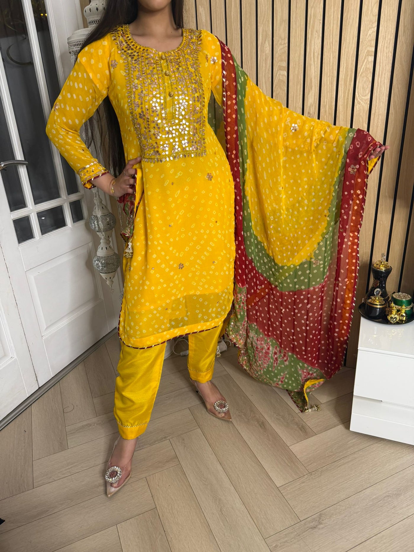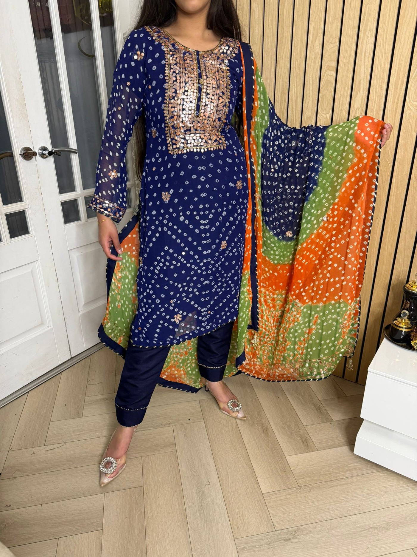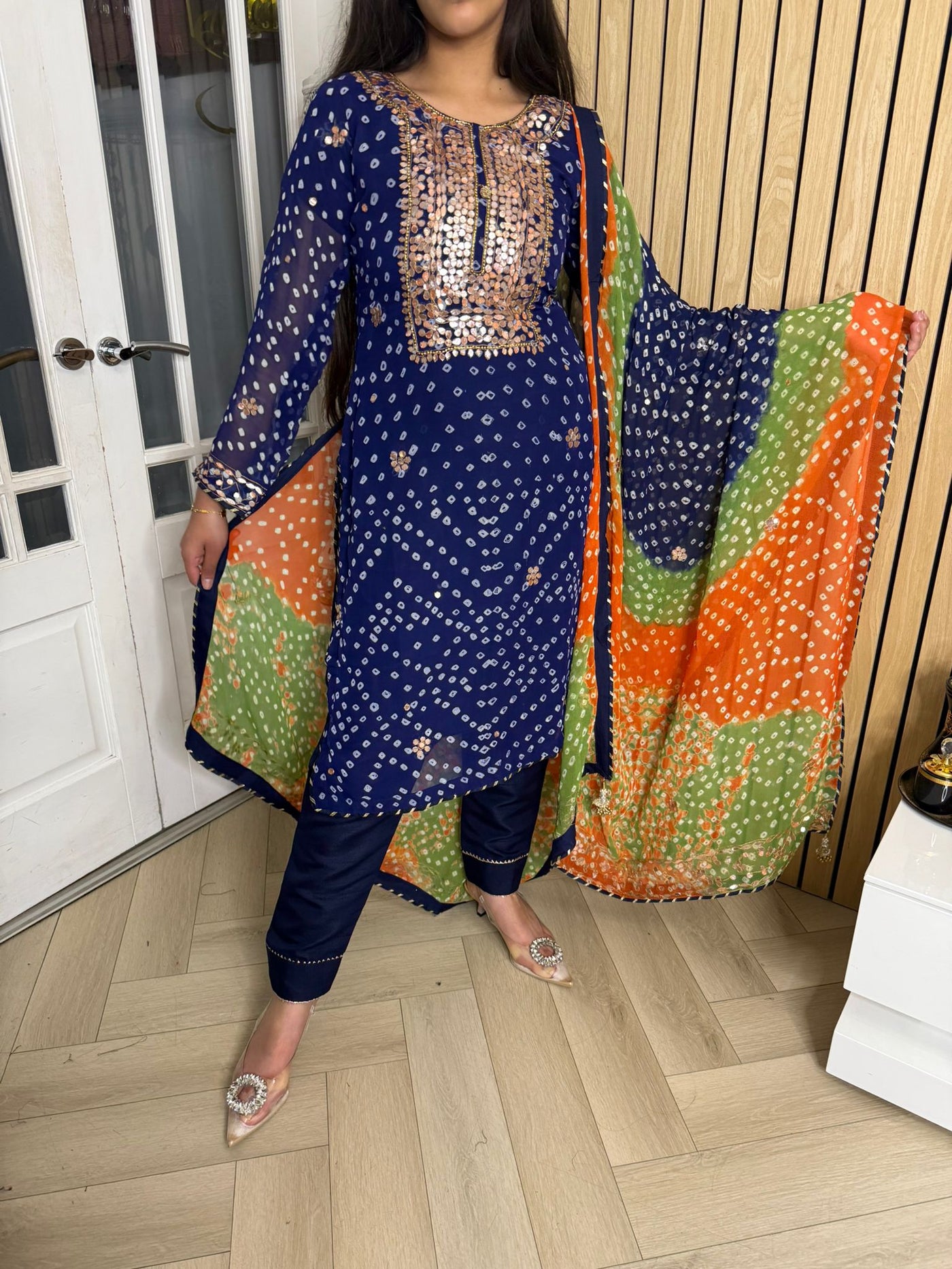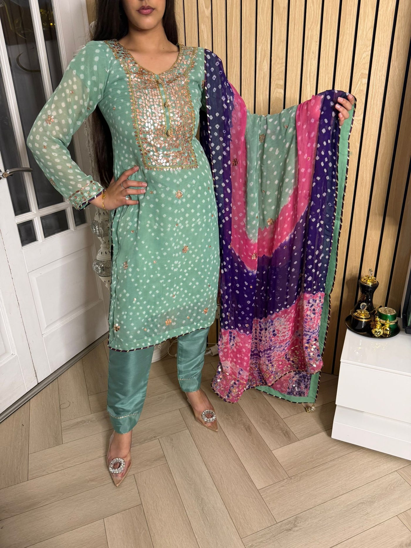 Product Description:This stunning three-piece suit is crafted from luxurious chiffon material,offering a soft and elegant feel. The long kameez features a beautiful embroidery that is showcased all over, creating a vibrant and eye-catching look. The neckline is detailed, adding a touch of sophistication, while the borders are thoughtfully designed to enhance the overall aesthetic. Accompanying the kameez are a matching shalwar and a dupatta, ensuring a cohesive and stylish ensemble. Perfect for any occasion, this outfit combines traditional charm with contemporary elegance.