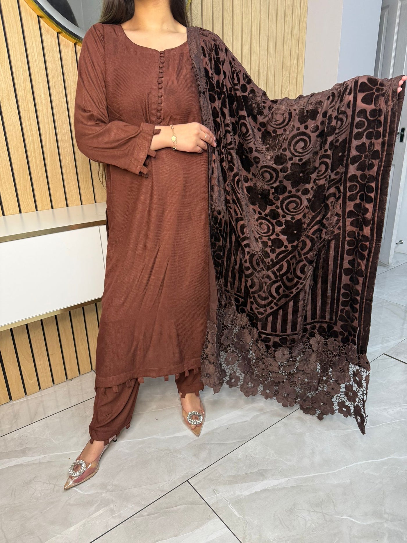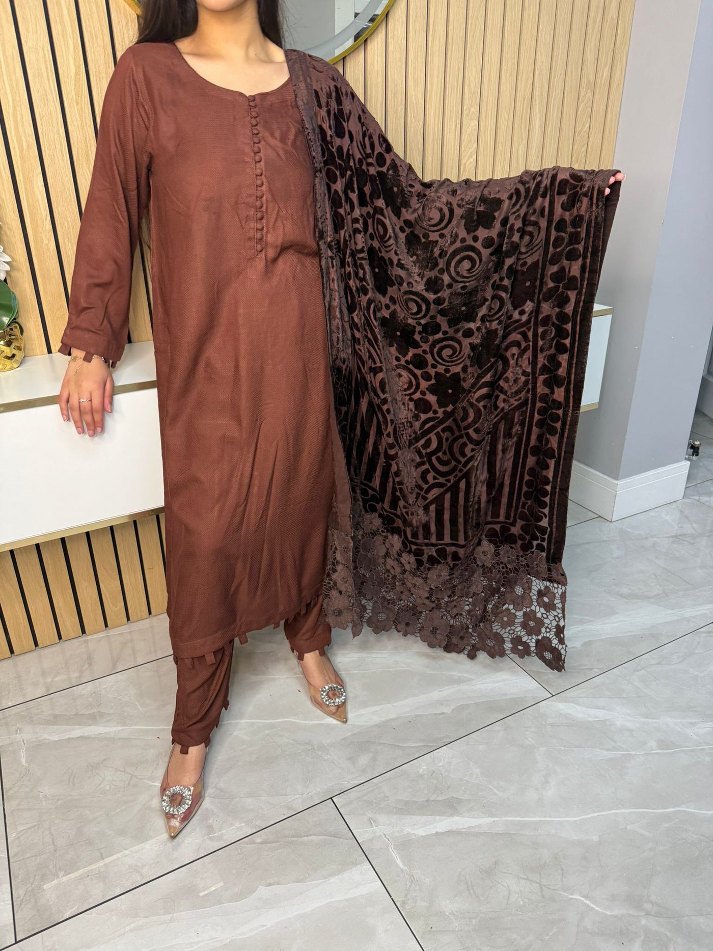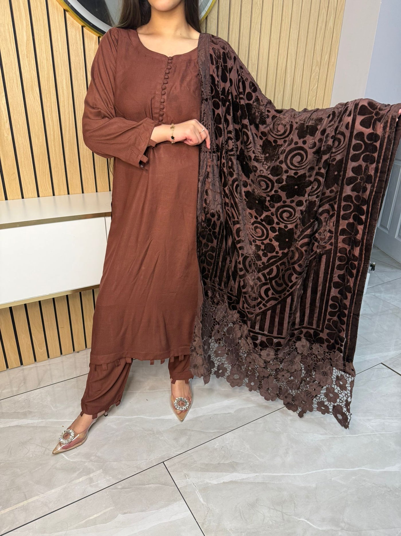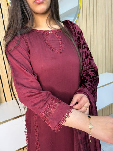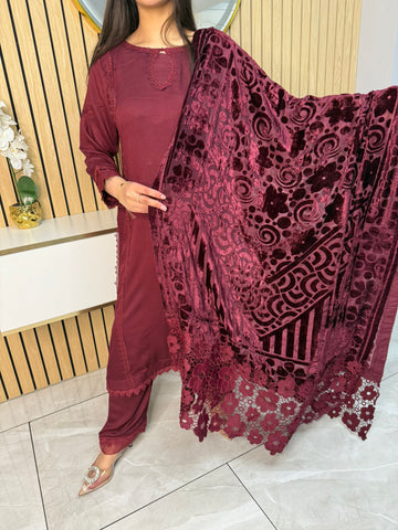 Product Description:Embrace the season with our exquisite 3-piece Dhannak suit. The kameez features delicate button detailing at the neckline, adding a touch of subtle elegance. Paired with comfortable, plain trousers, this set offers a versatile foundation. The highlight is the luxurious Palachi velvet shawl, known for its rich texture and warmth. Perfect for festive occasions or adding a touch of sophistication to your everyday style, this suit is a winter wardrobe essential.