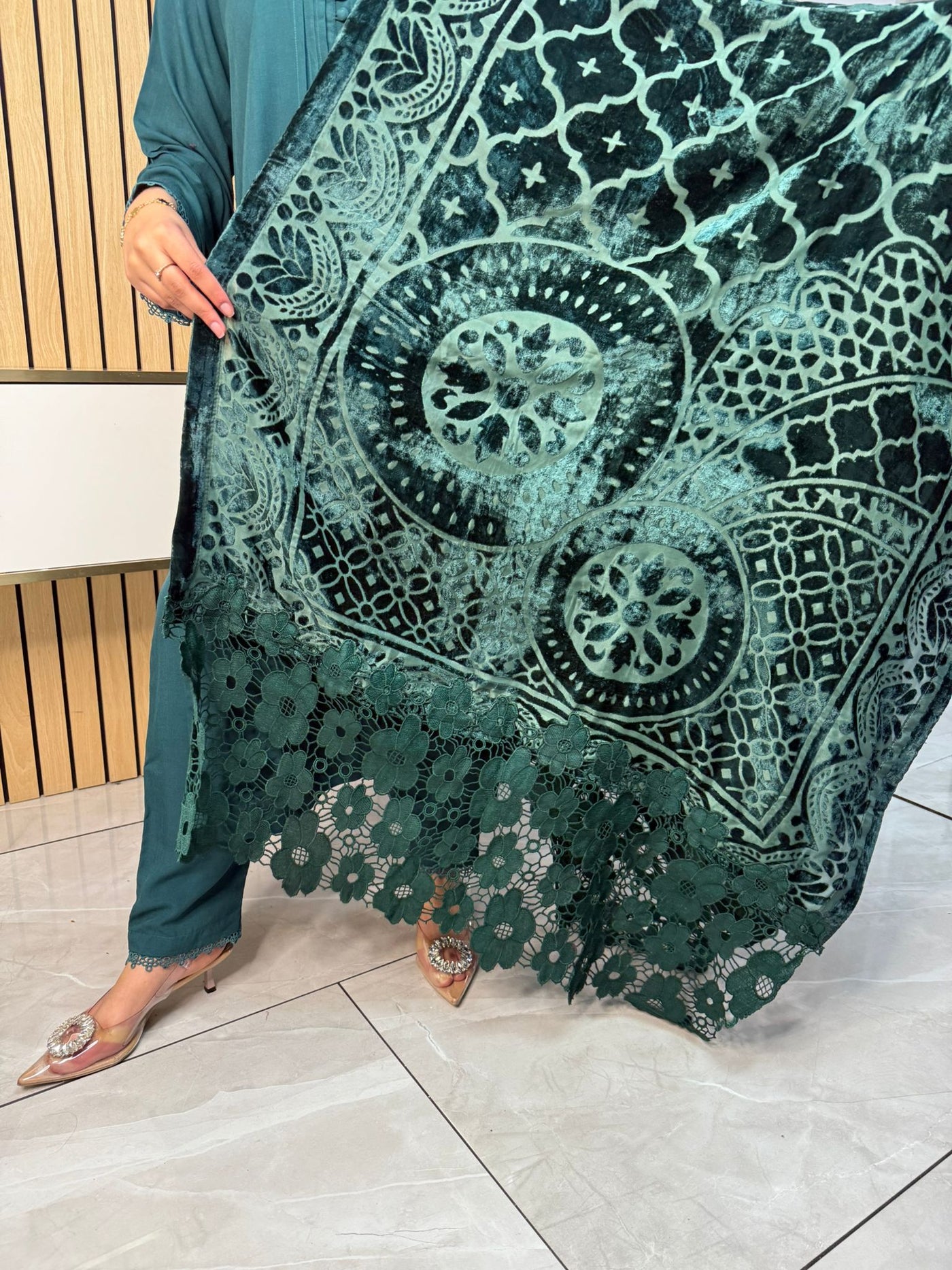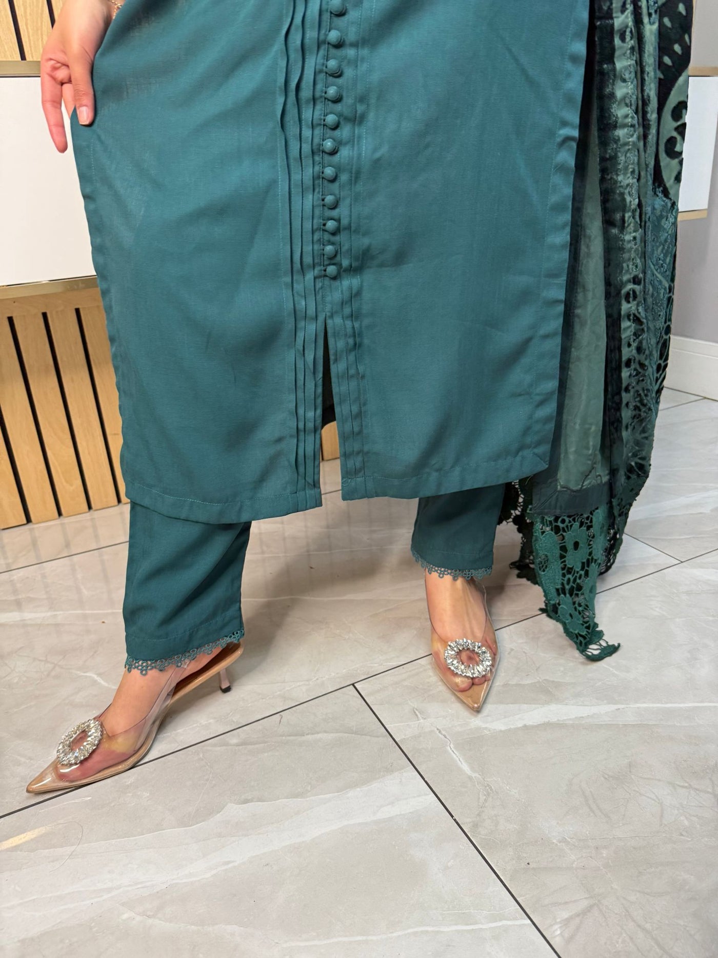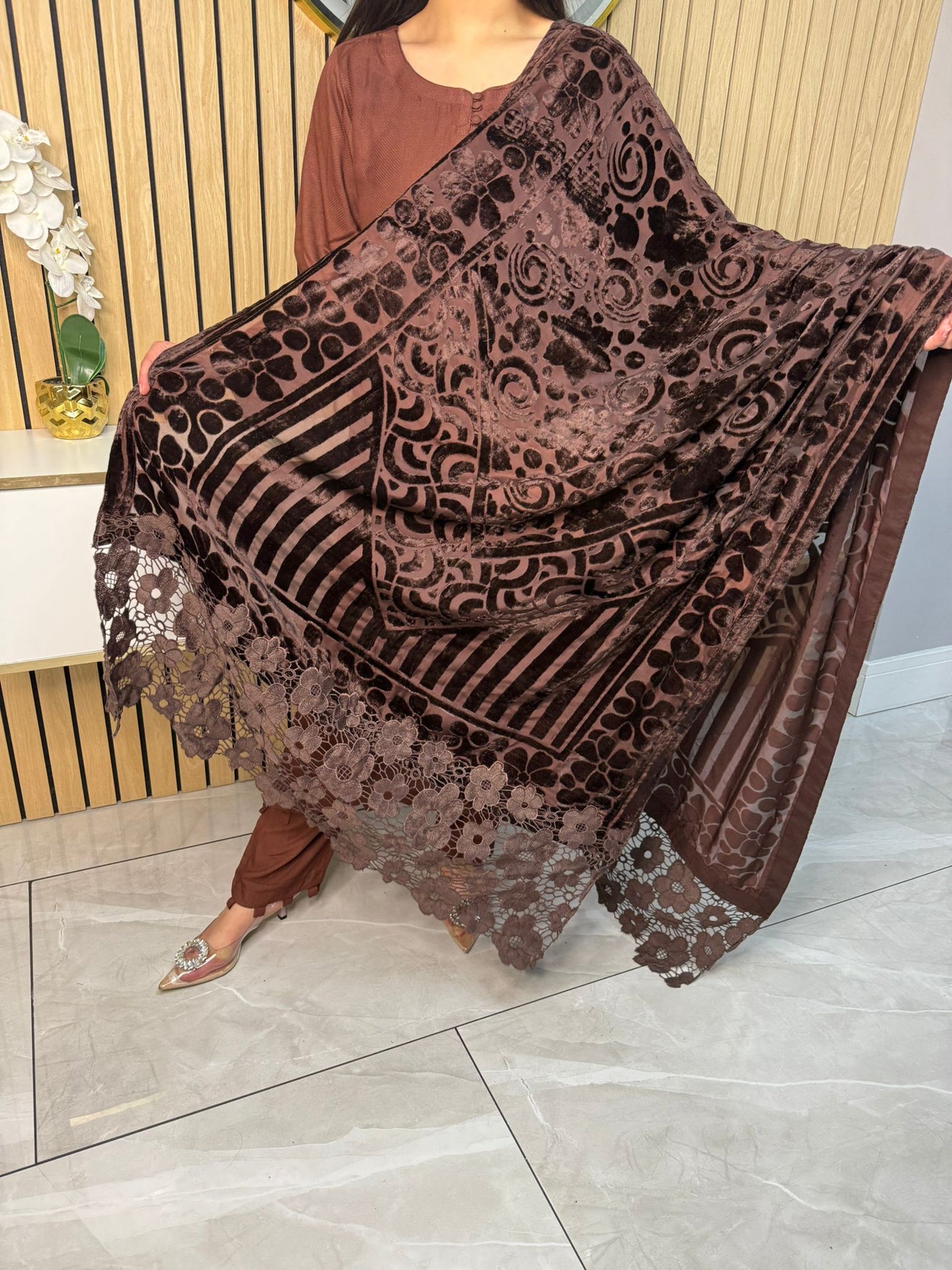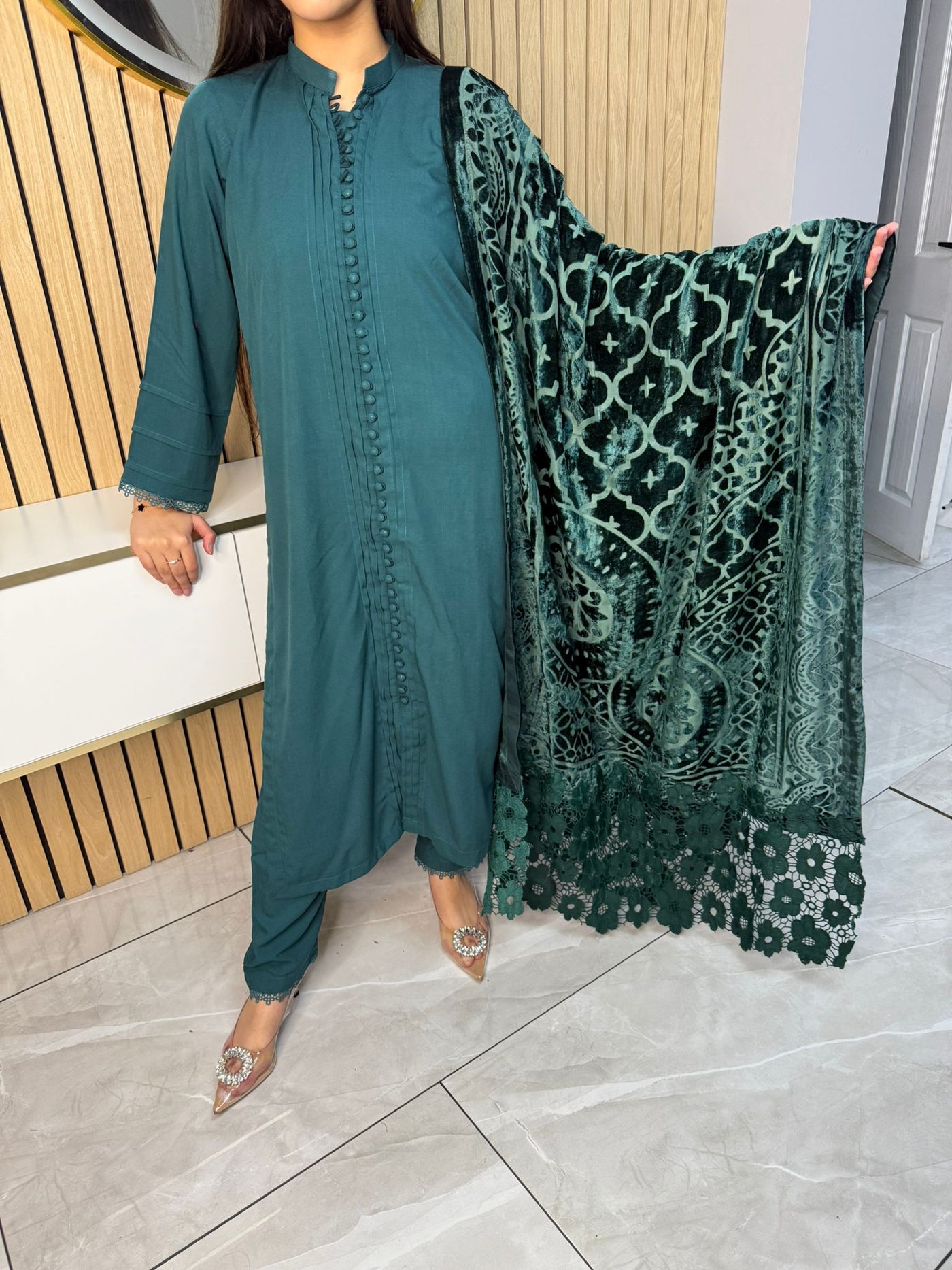 Product Description:Embrace the season with our exquisite 3-piece Dhannak suit. The kameez features delicate button detailing at the neckline, adding a touch of subtle elegance. Paired with comfortable, plain trousers, this set offers a versatile foundation. The highlight is the luxurious Palachi velvet shawl, known for its rich texture and warmth. Perfect for festive occasions or adding a touch of sophistication to your everyday style, this suit is a winter wardrobe essential.