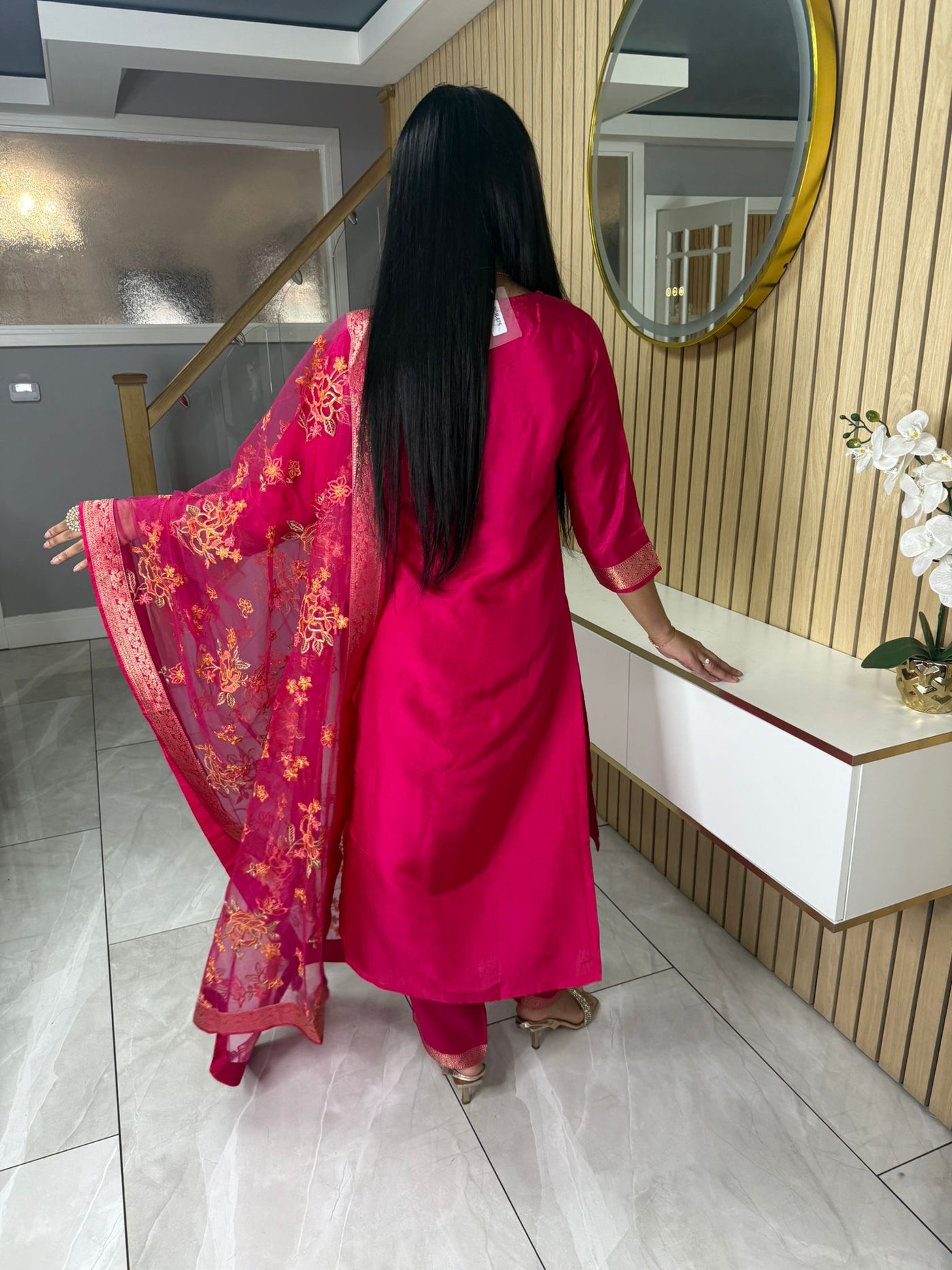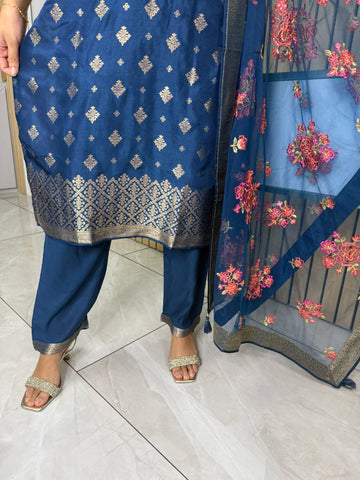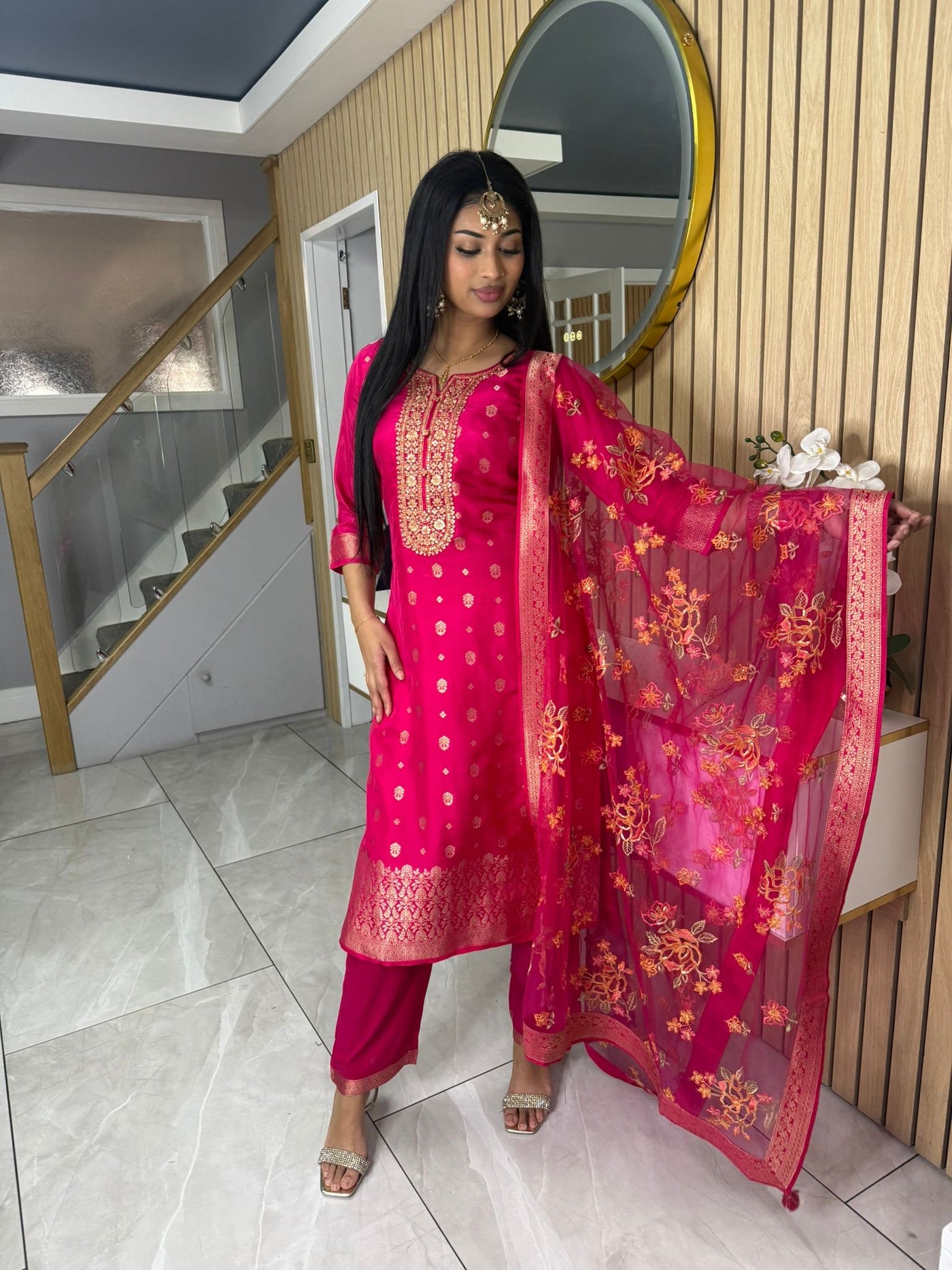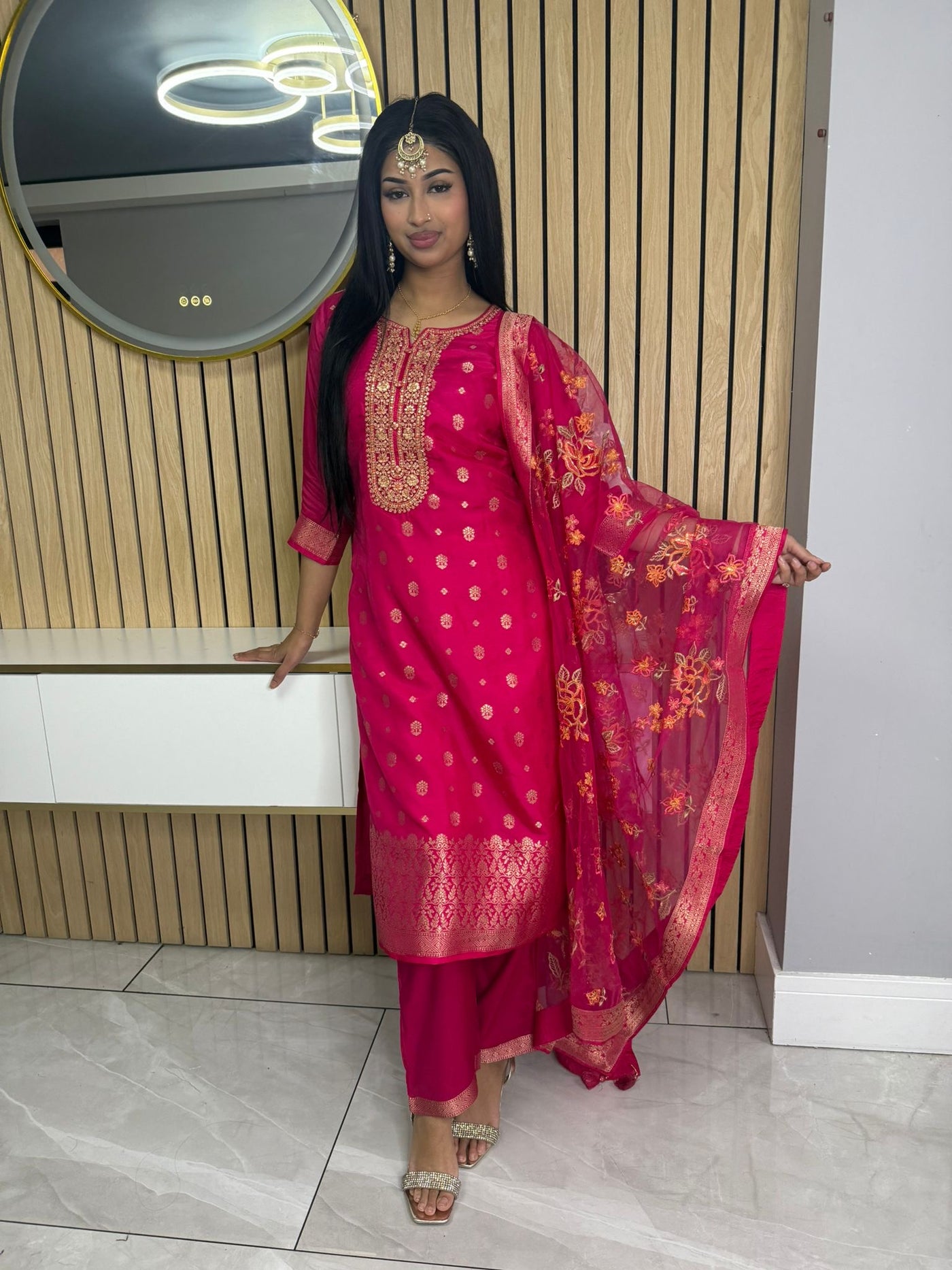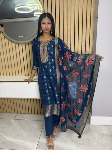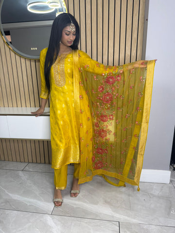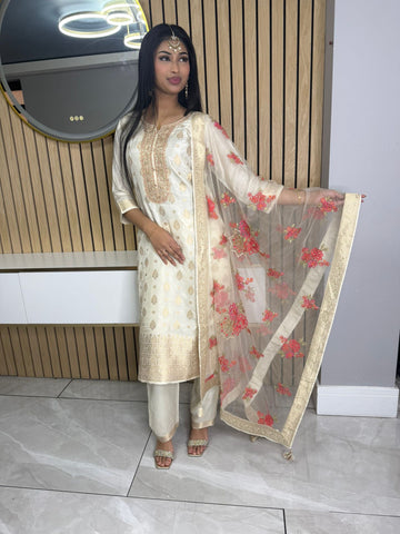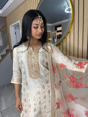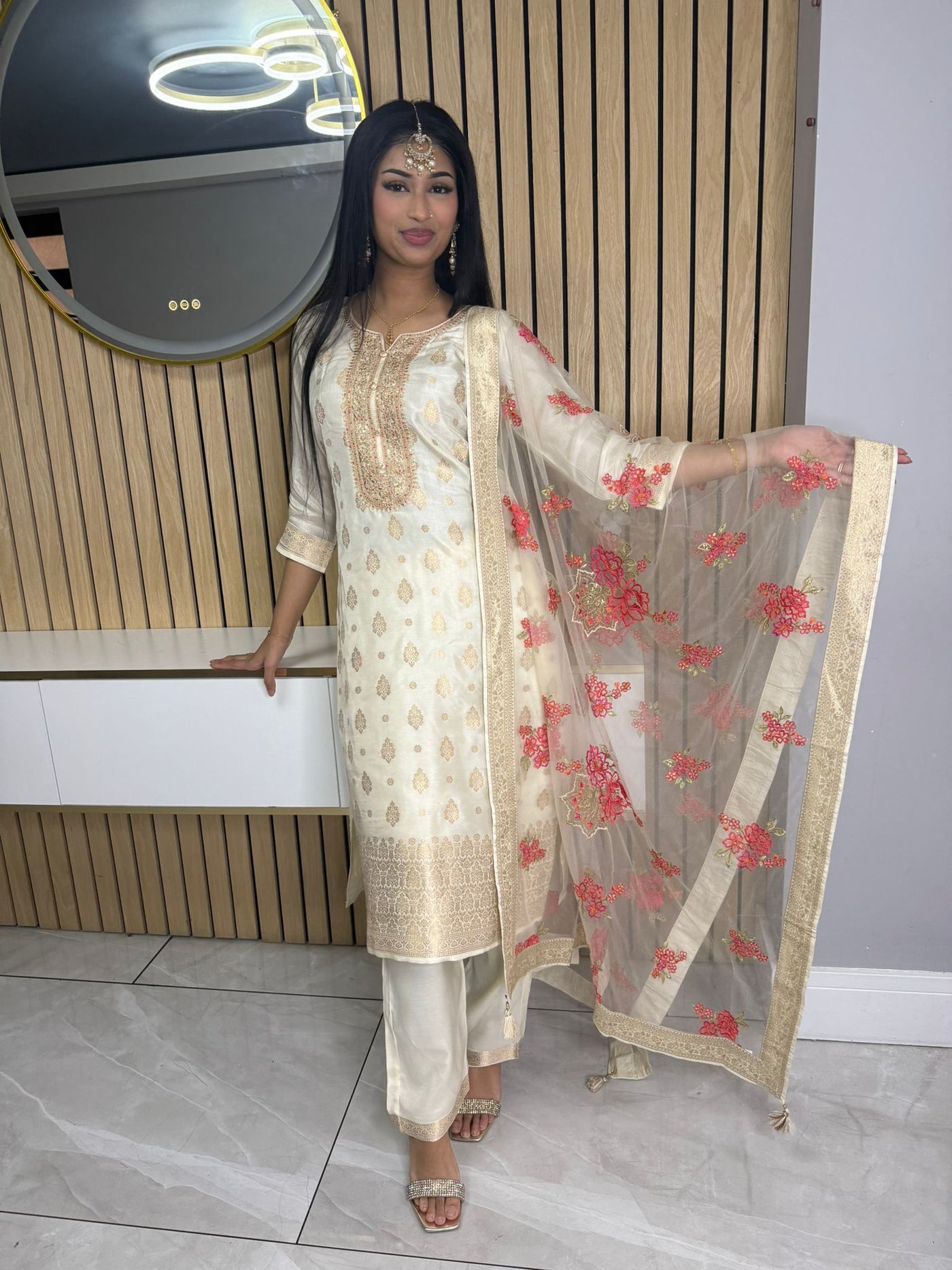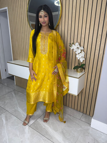 Product Description:Celebrate Eid in unparalleled style with our luxurious three-piece Indian silk suit. This elegant ensemble features a long kameez crafted from premium silk, adorned with exquisite gold detailing that adds a touch of regal charm. The kameez is perfectly paired with classic, plain straight trousers, offering a sleek and sophisticated silhouette. The true showstopper of this outfit is the stunning floral net dupatta, which adds a layer of delicate beauty and grace. Available in four gorgeous colours: Cream, Blue, Fuschia, and Mustard. This suit is designed to make you feel like royalty during the joyous celebrations of Eid.