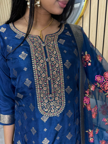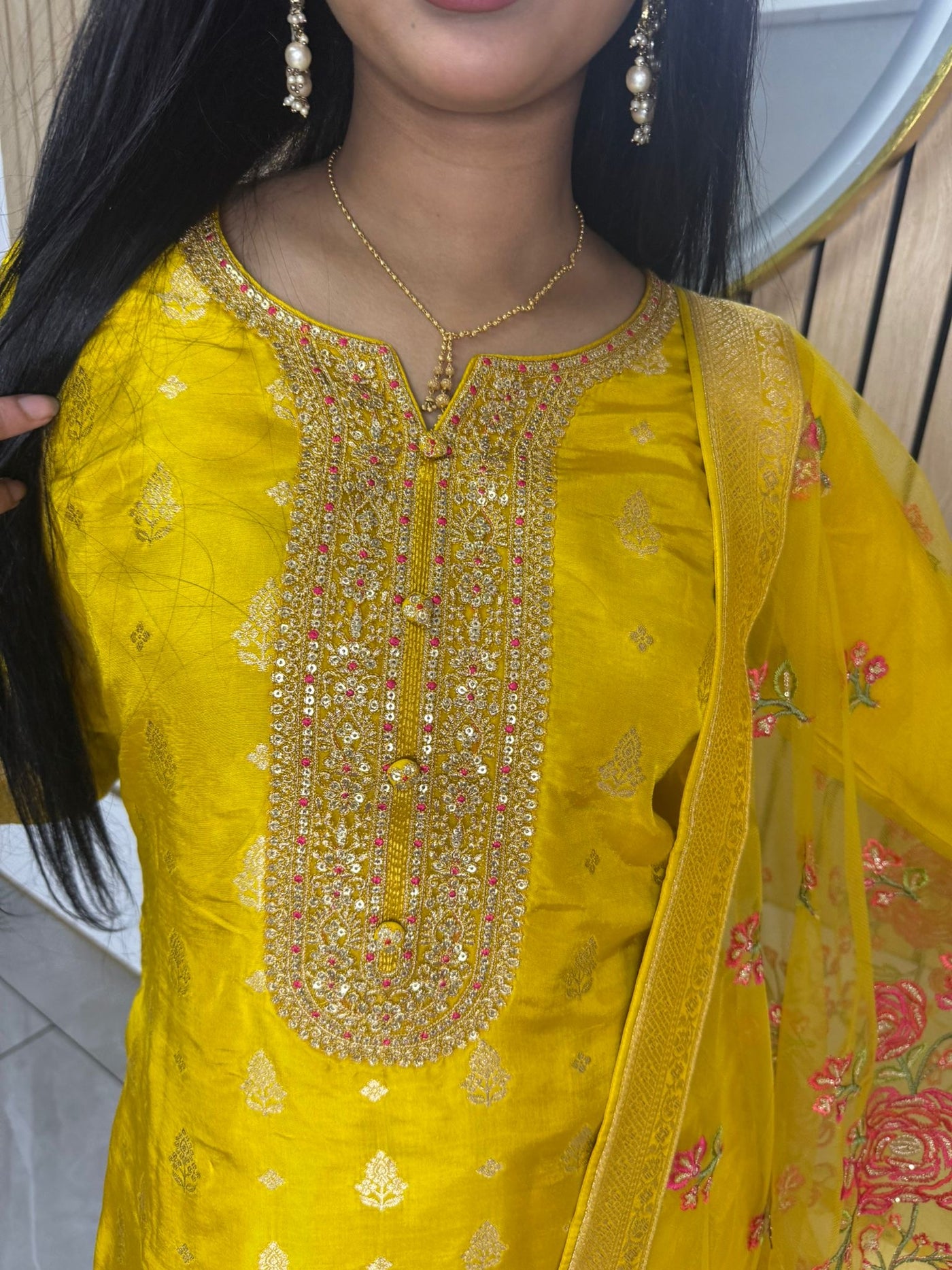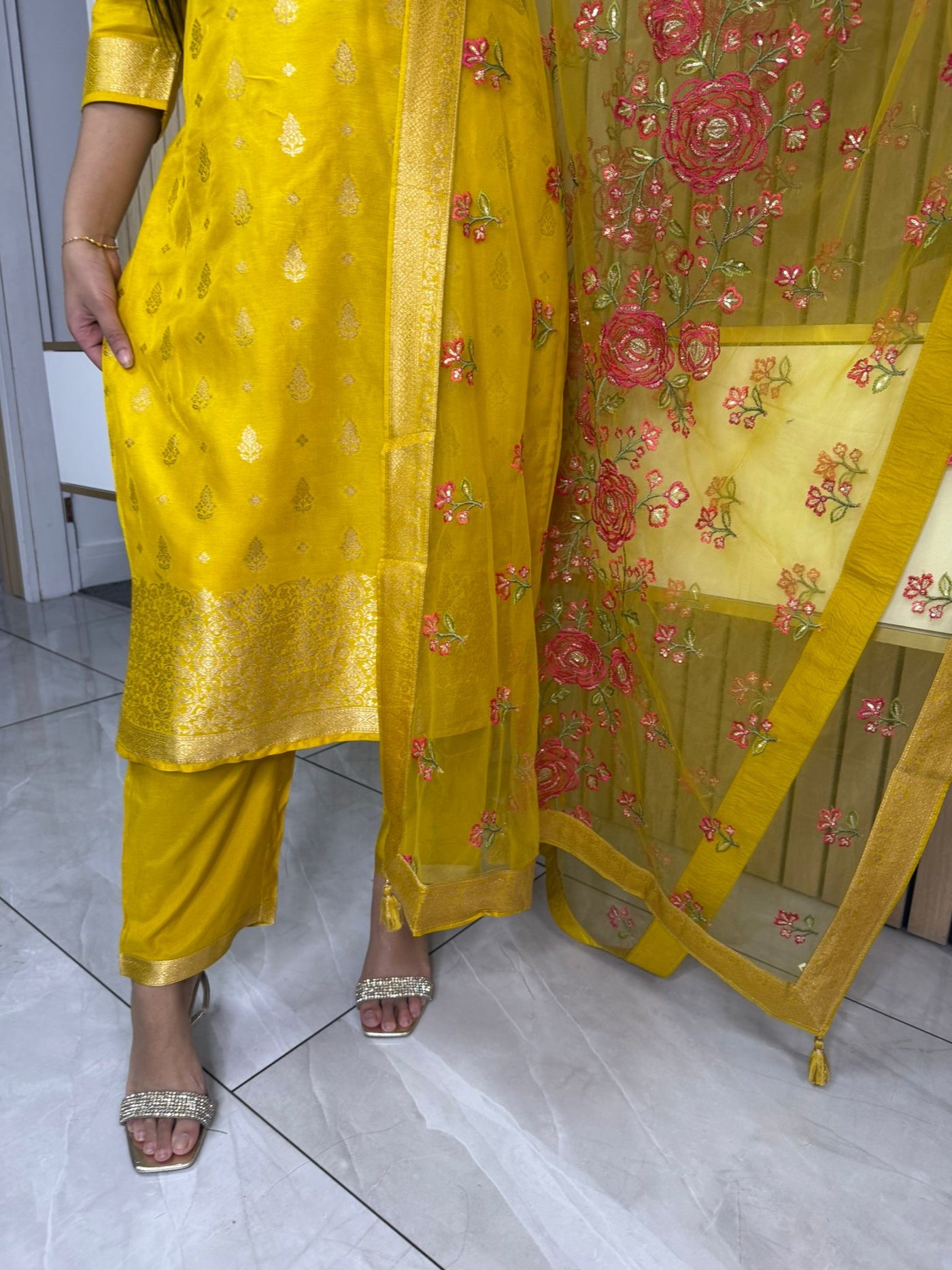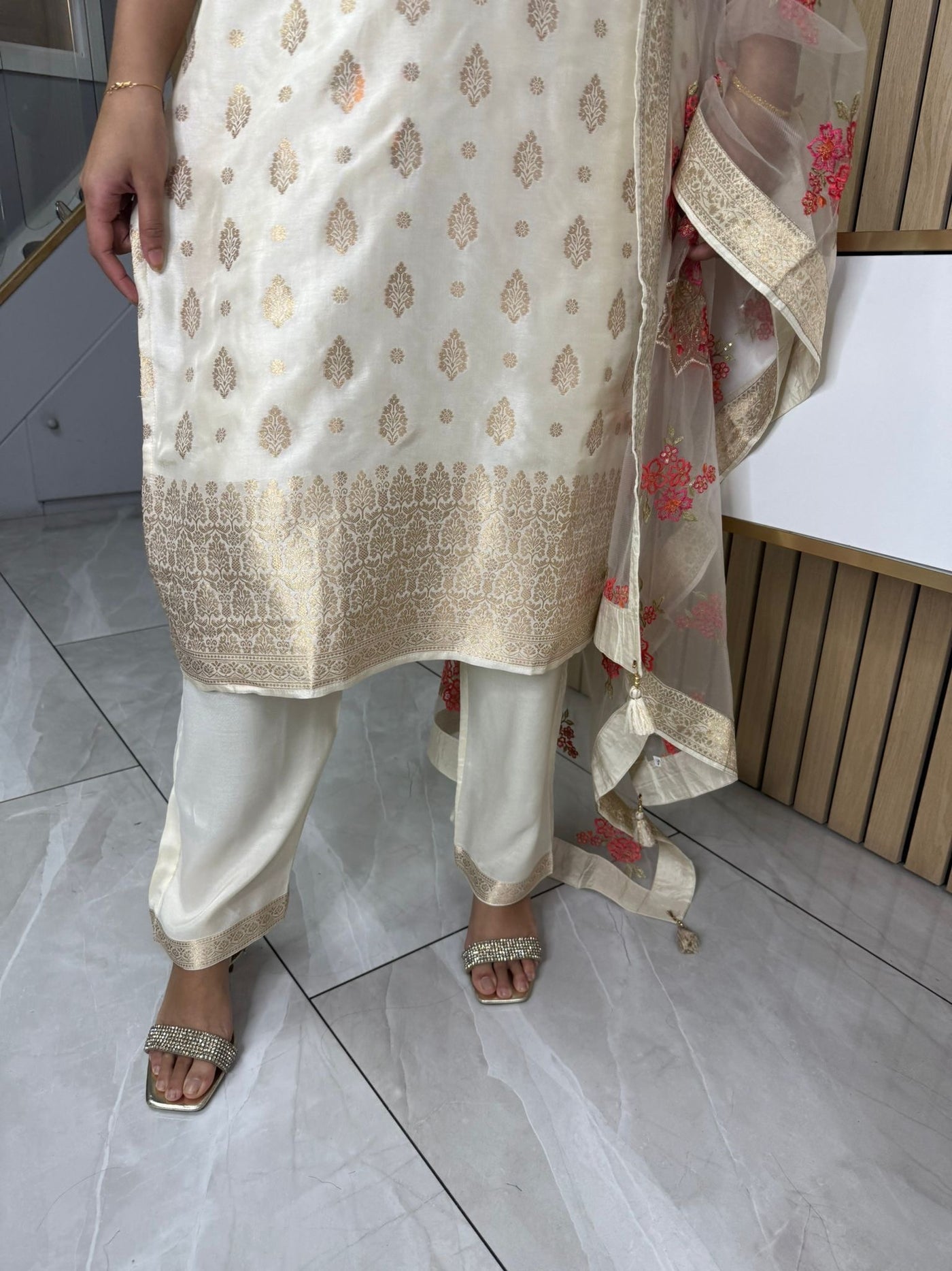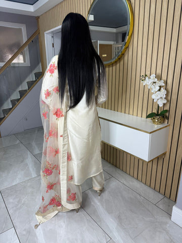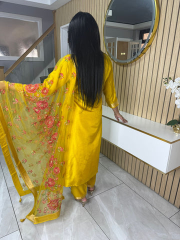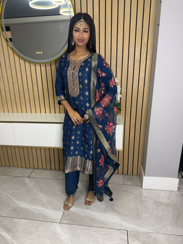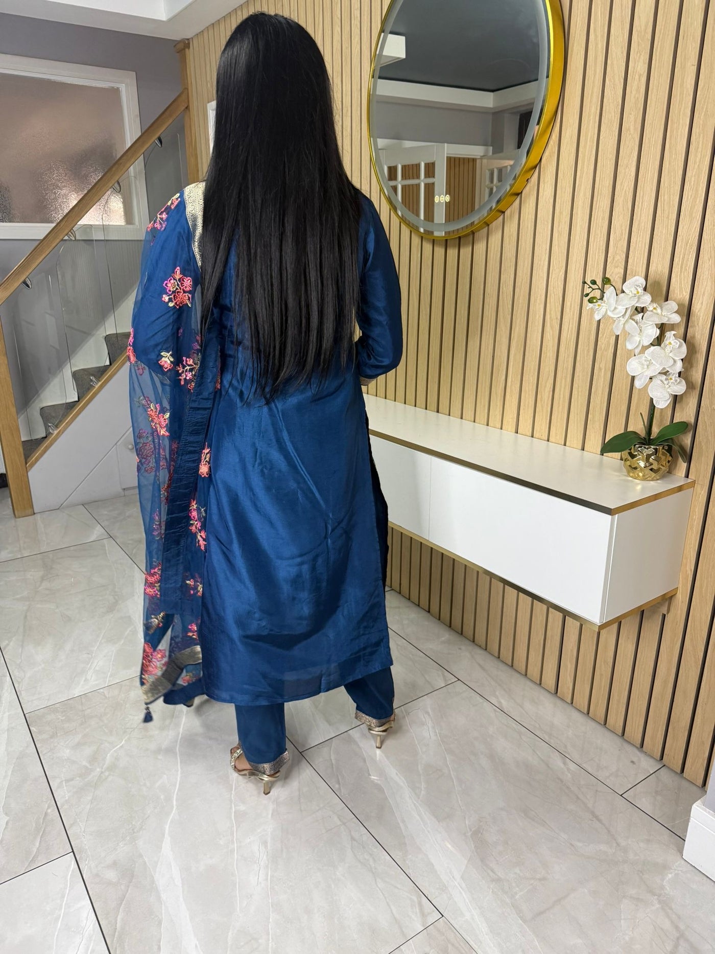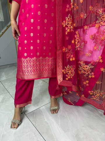 Product Description:Celebrate Eid in unparalleled style with our luxurious three-piece Indian silk suit. This elegant ensemble features a long kameez crafted from premium silk, adorned with exquisite gold detailing that adds a touch of regal charm. The kameez is perfectly paired with classic, plain straight trousers, offering a sleek and sophisticated silhouette. The true showstopper of this outfit is the stunning floral net dupatta, which adds a layer of delicate beauty and grace. Available in four gorgeous colours: Cream, Blue, Fuschia, and Mustard. This suit is designed to make you feel like royalty during the joyous celebrations of Eid.
