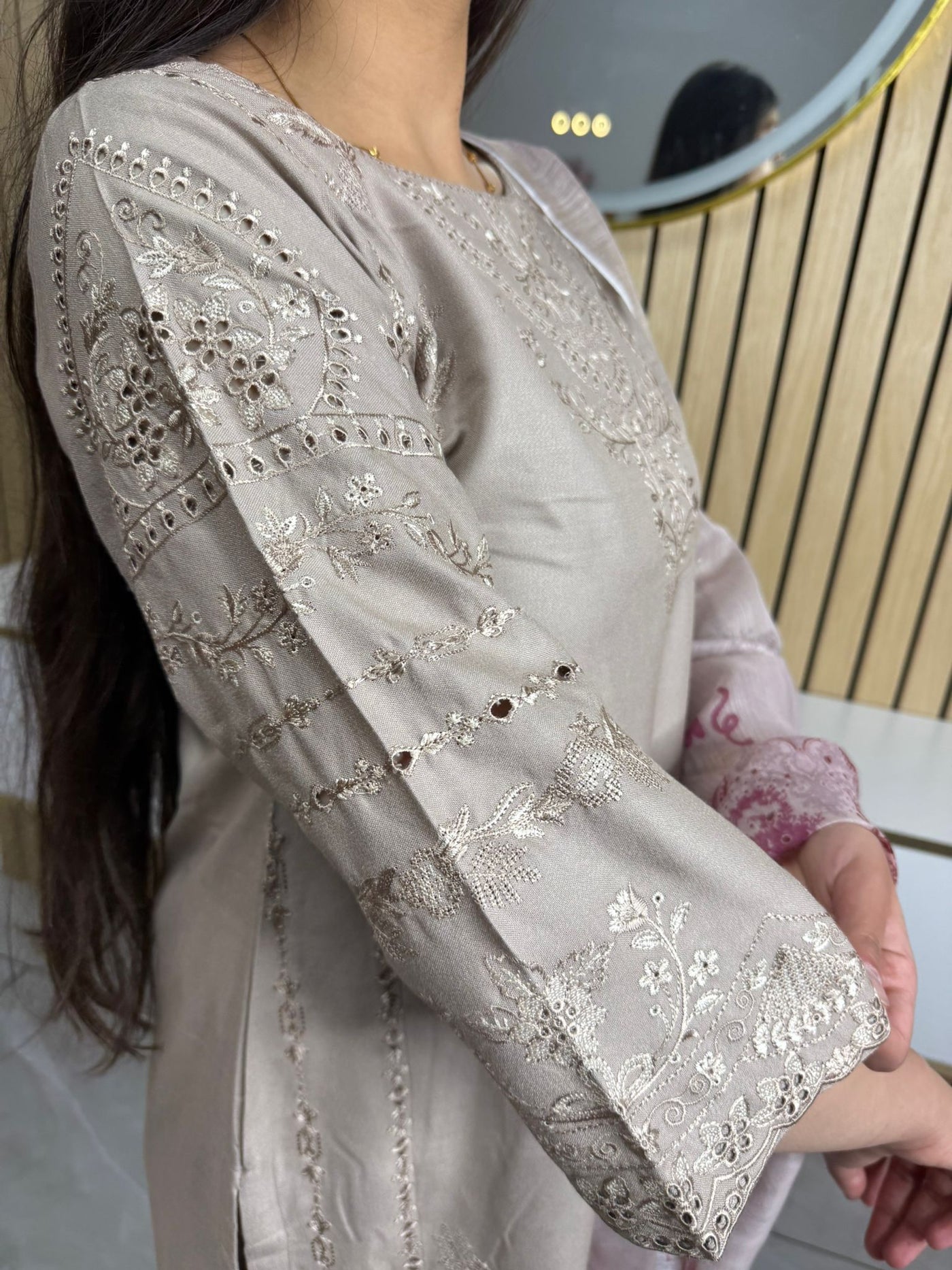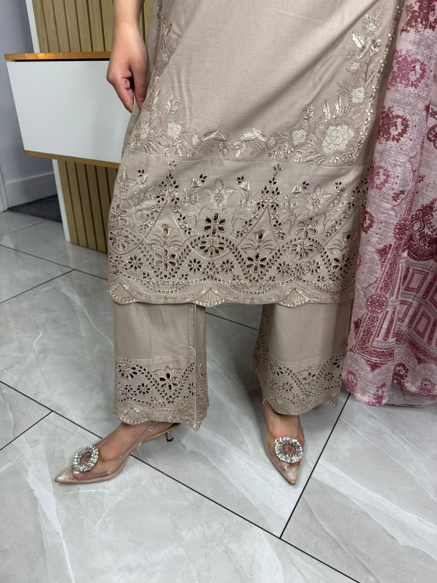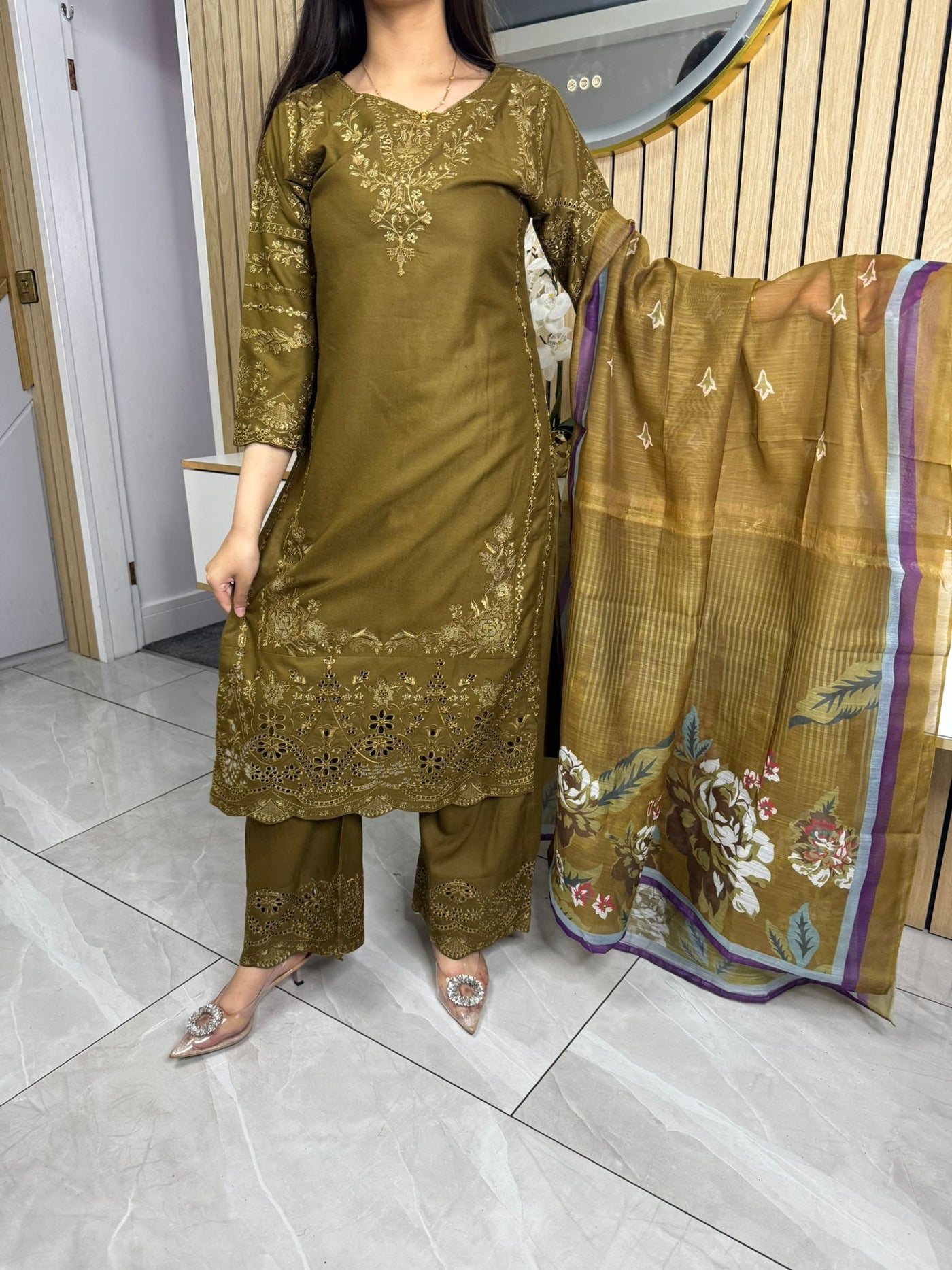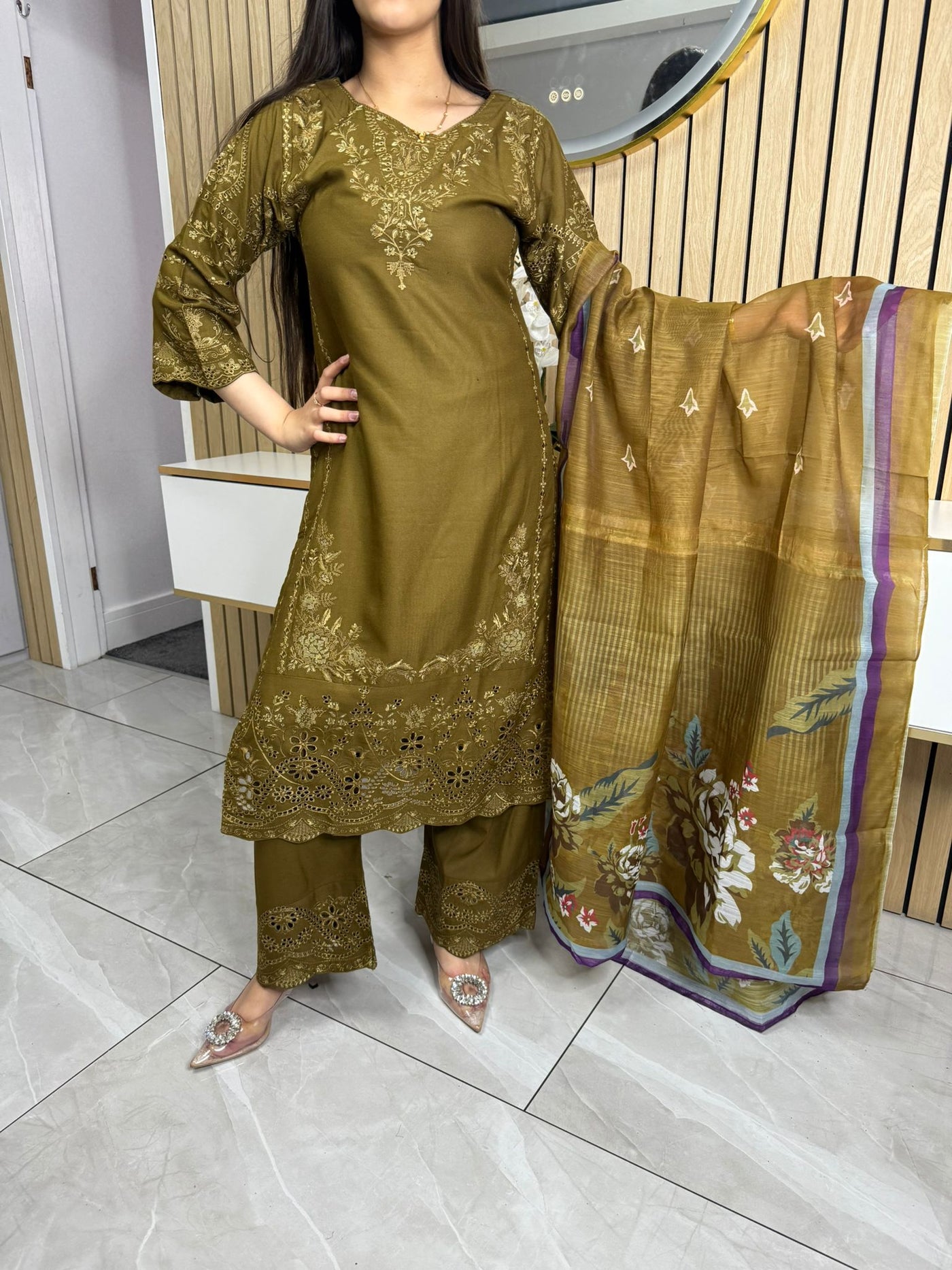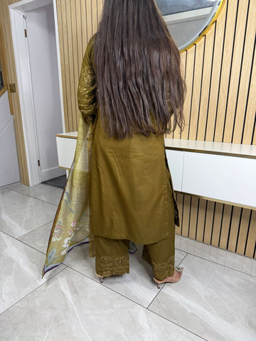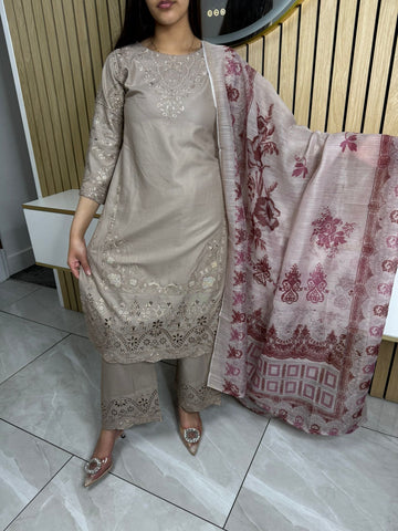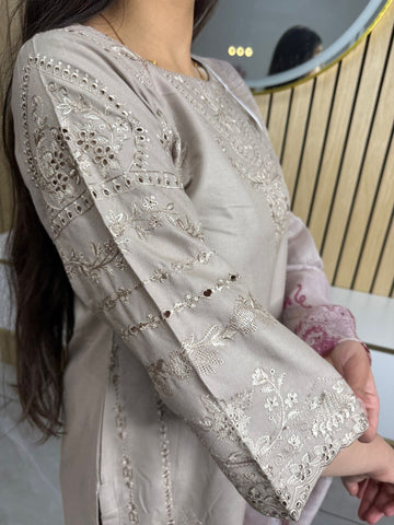 Product Description:Experience the perfect blend of elegance and comfort with our 3-piece suit. This ensemble features a long kameez with a detailed border, paired with trendy palazzo trousers and a graceful khadi netting dupatta. Available in three striking colors: emerald,grey and coffee this suit is designed to make you stand out with its sophisticated charm.