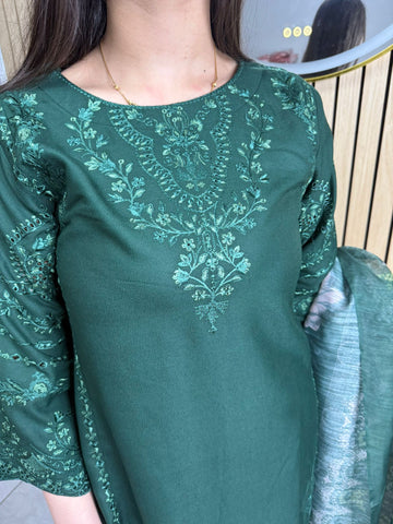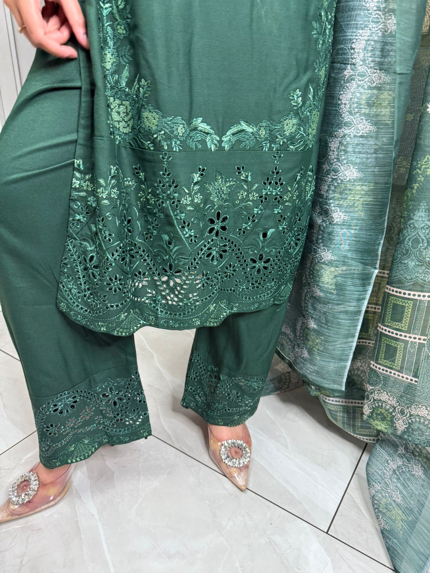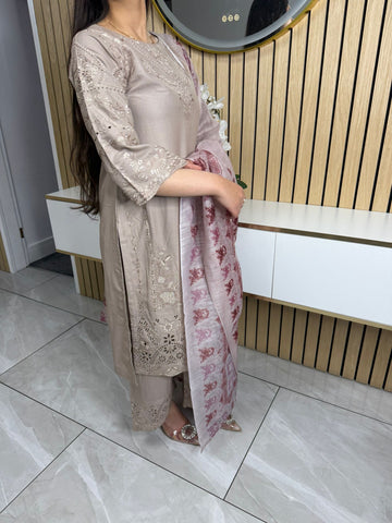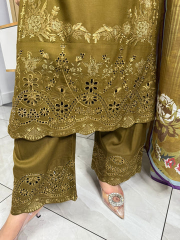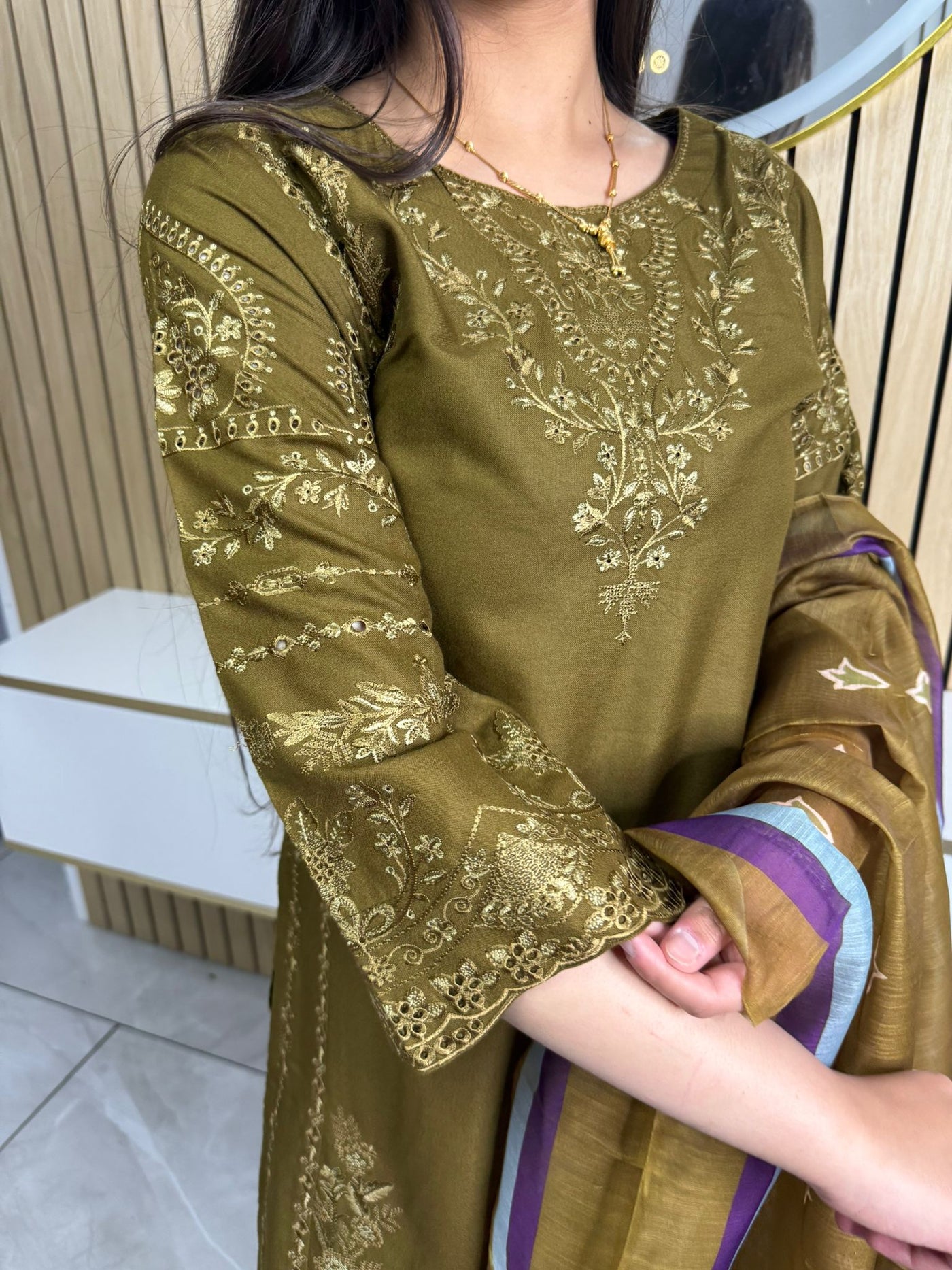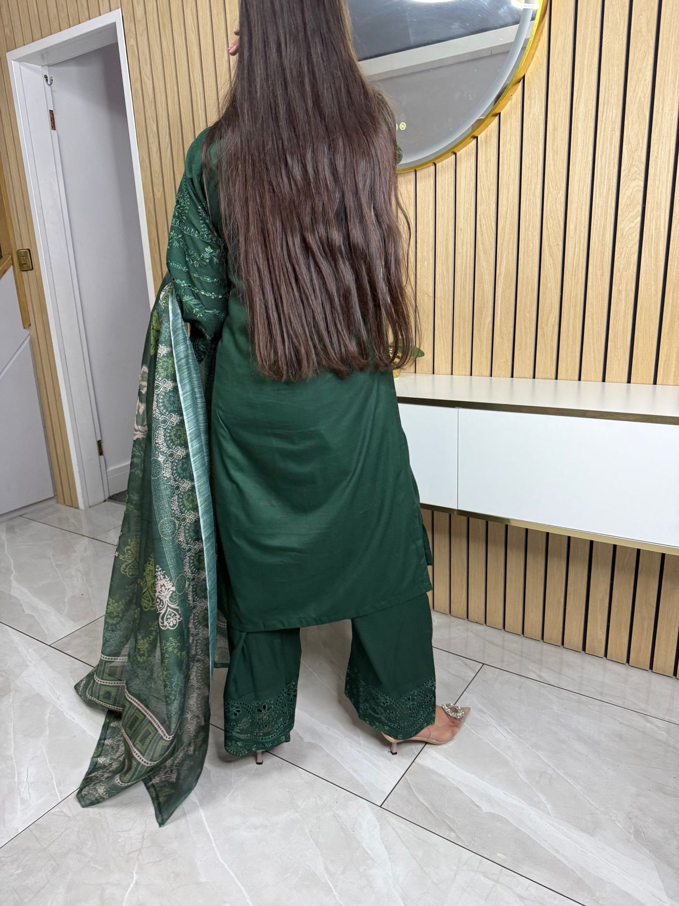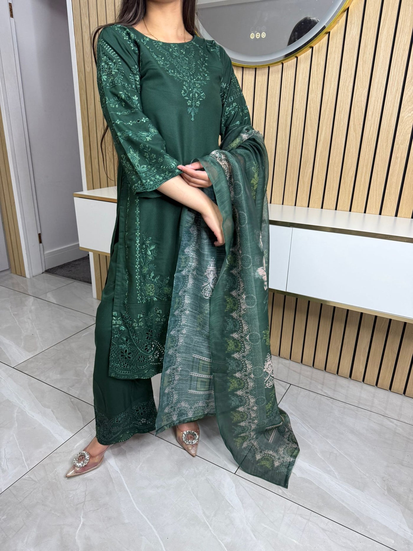 Product Description:Experience the perfect blend of elegance and comfort with our 3-piece suit. This ensemble features a long kameez with a detailed border, paired with trendy palazzo trousers and a graceful khadi netting dupatta. Available in three striking colors: emerald,grey and coffee this suit is designed to make you stand out with its sophisticated charm.