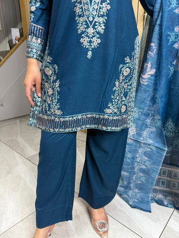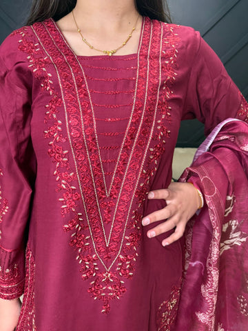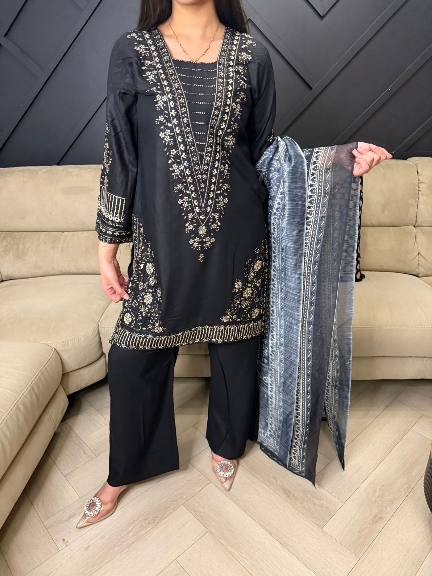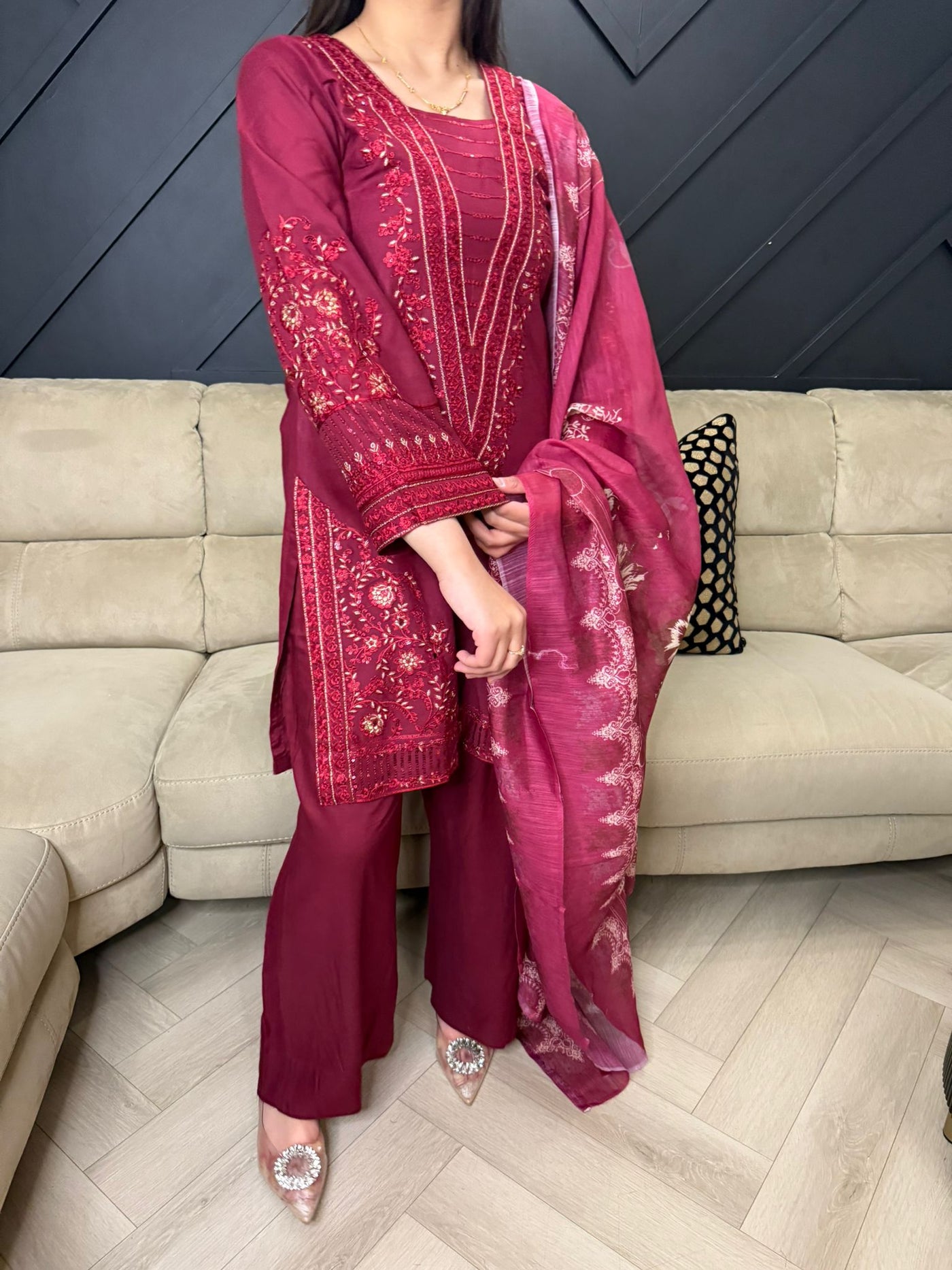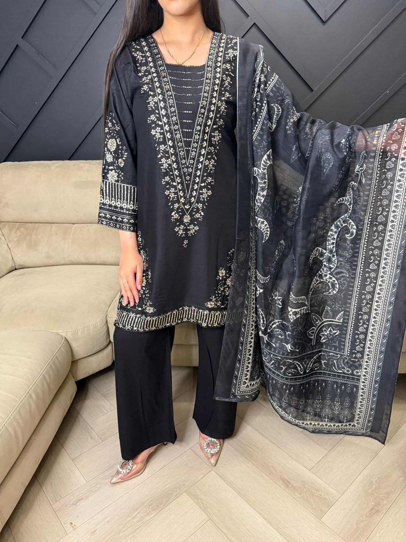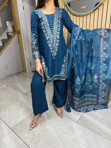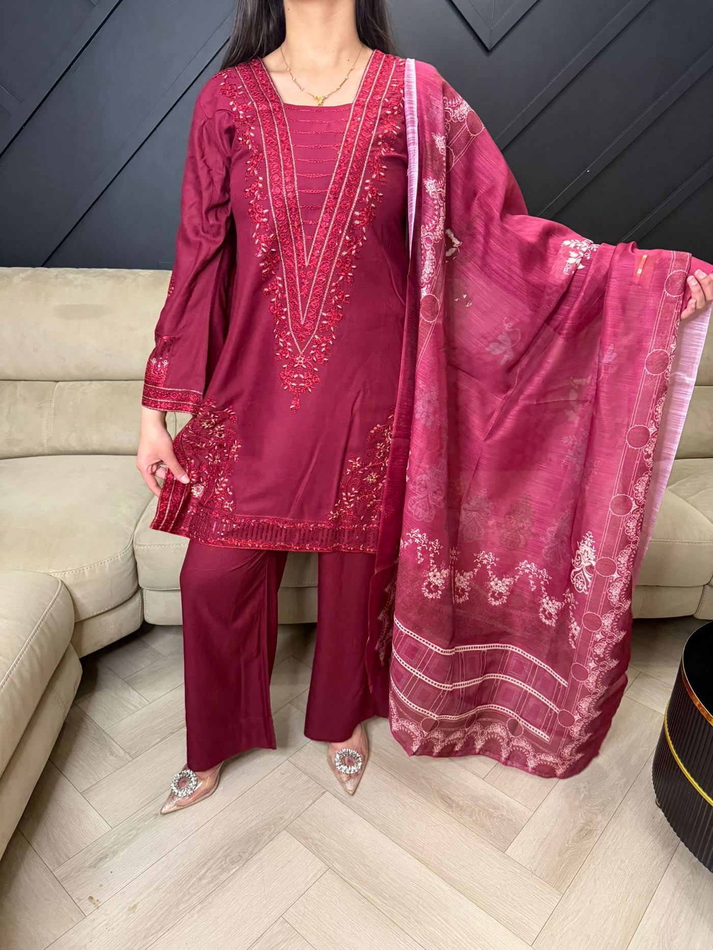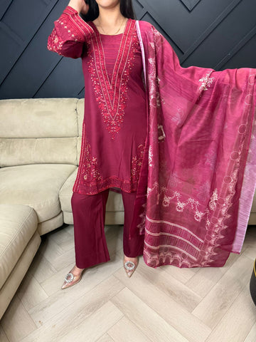 Product Description:Make a statement with our beautifully crafted 3-piece suit. This ensemble features a kameez with detailed thread embroidery and a stunning neckline, paired with tailored trousers and a flowing khadi net dupatta. Available in sophisticated blue, rich maroon, and classic black, this suit is designed to enhance your elegance and charm.