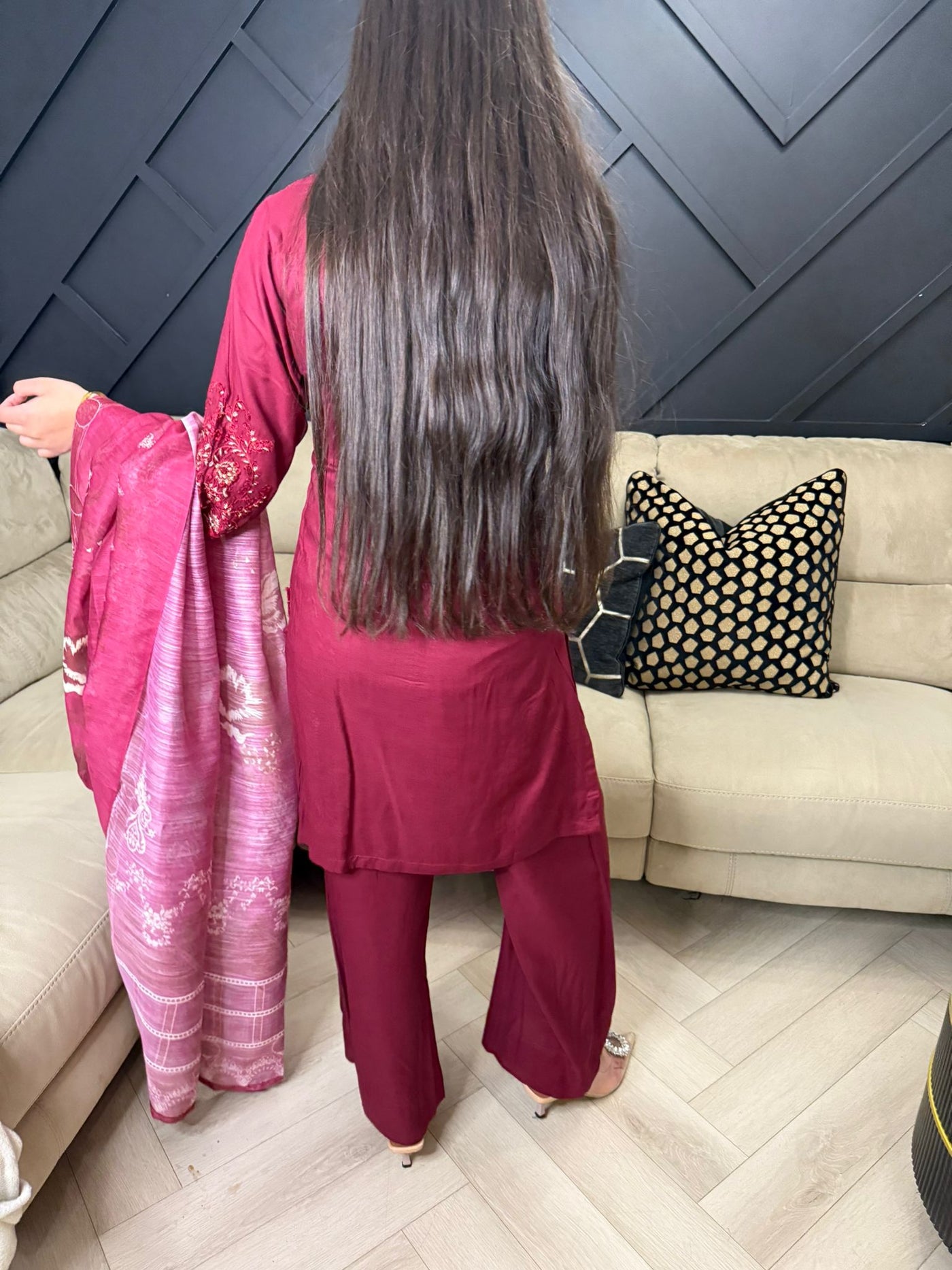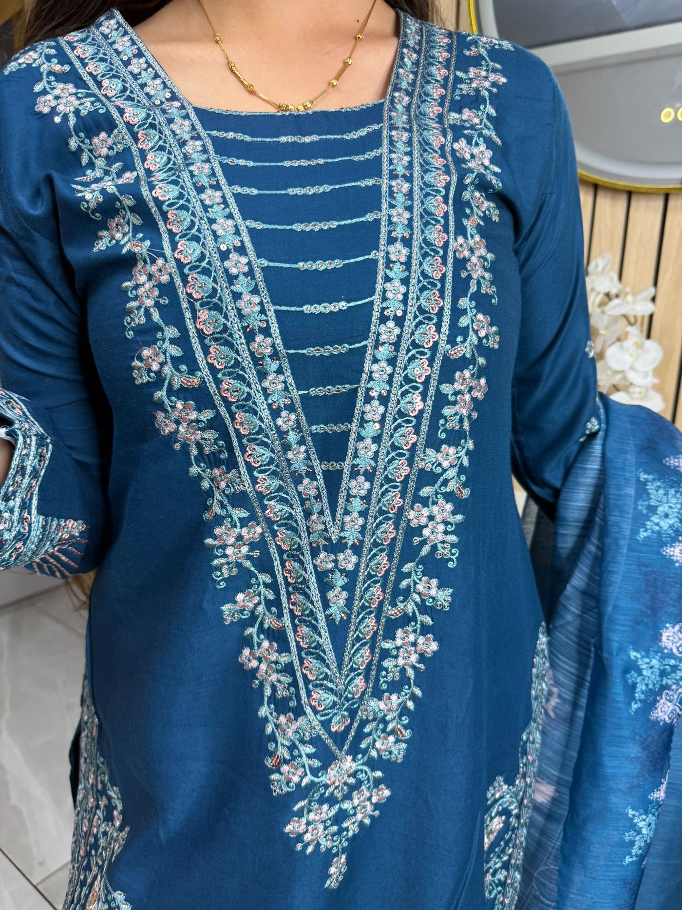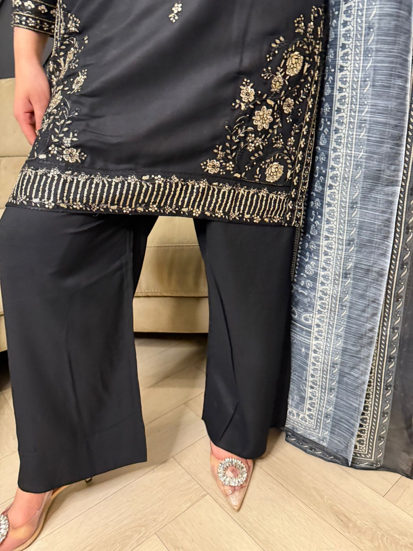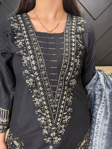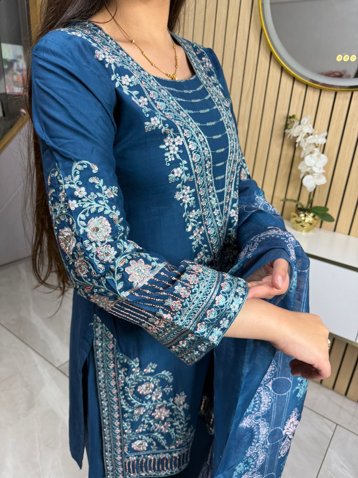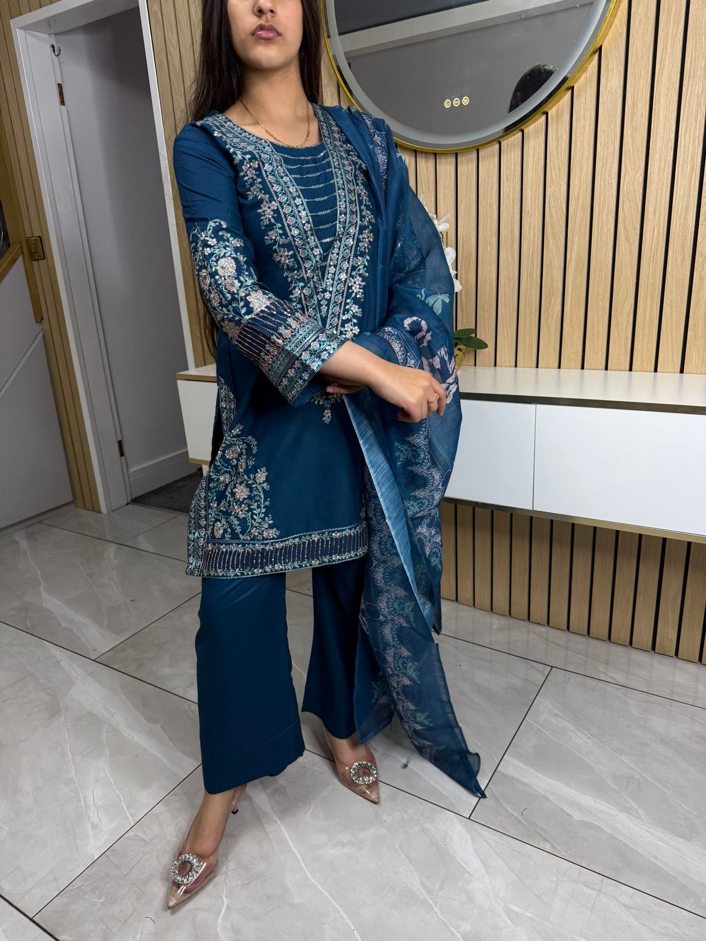 Product Description:Make a statement with our beautifully crafted 3-piece suit. This ensemble features a kameez with detailed thread embroidery and a stunning neckline, paired with tailored trousers and a flowing khadi net dupatta. Available in sophisticated blue, rich maroon, and classic black, this suit is designed to enhance your elegance and charm.