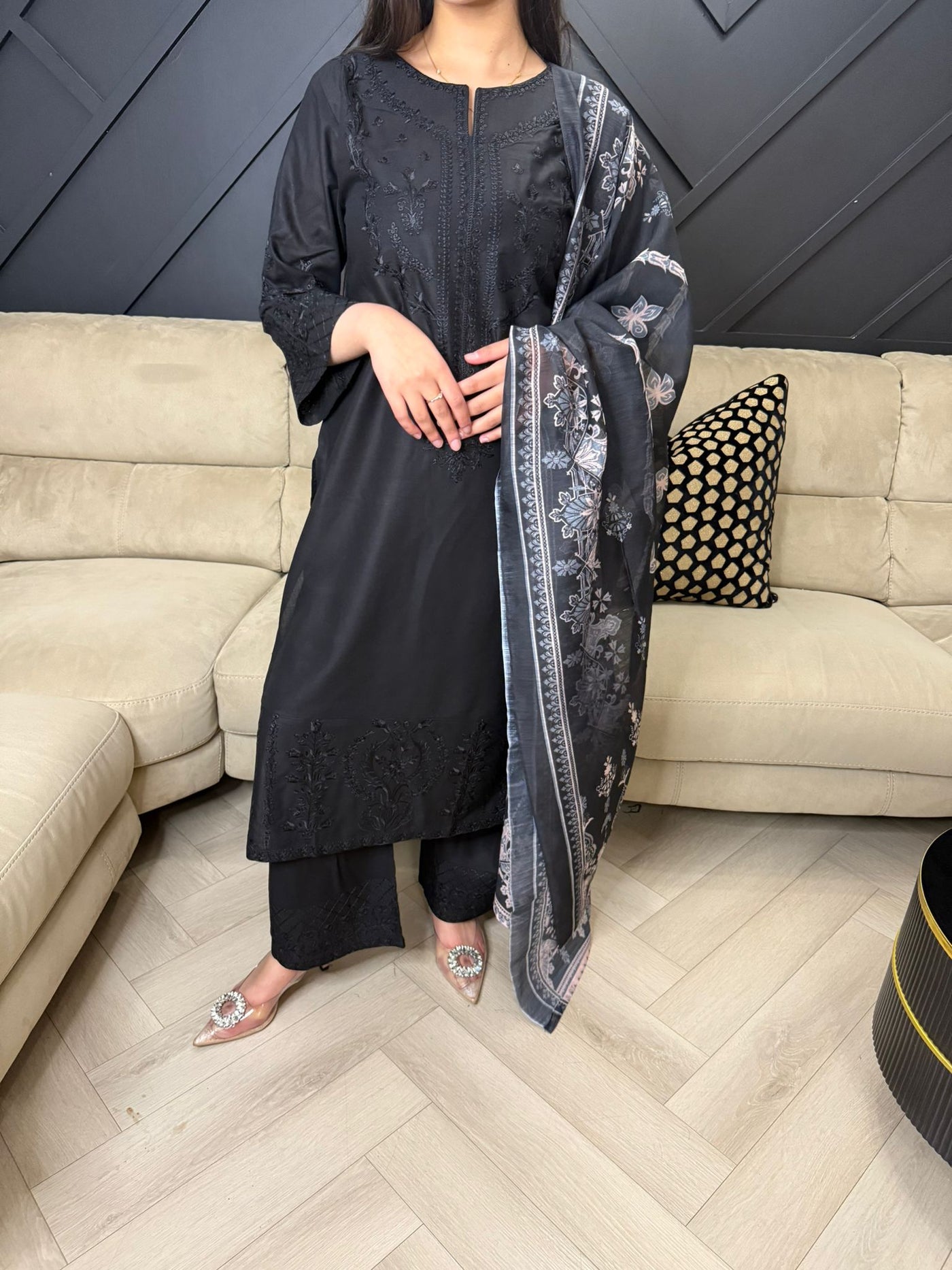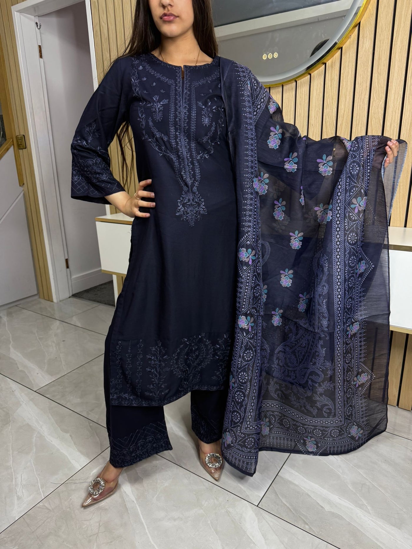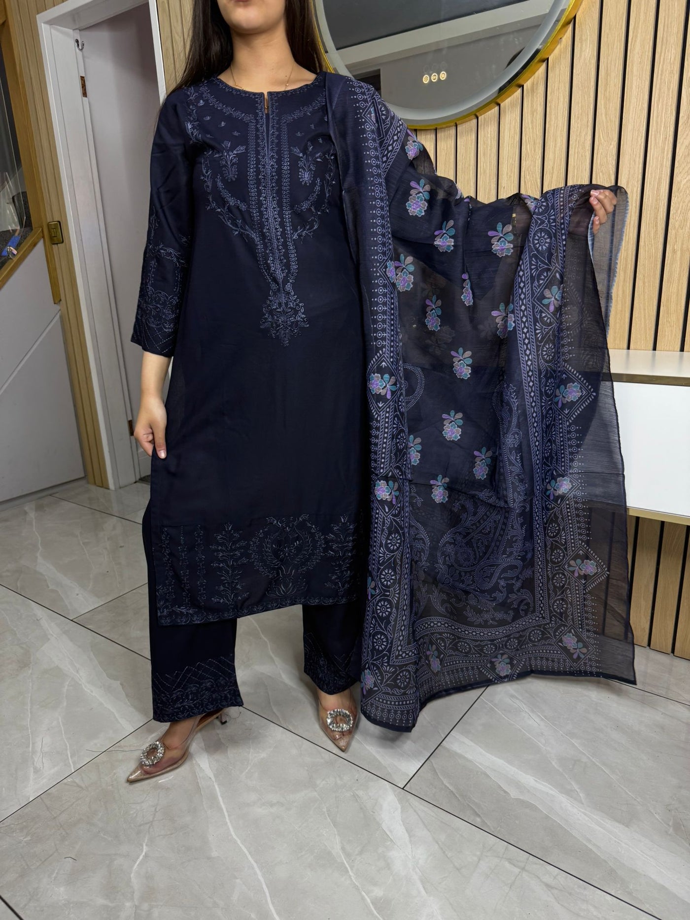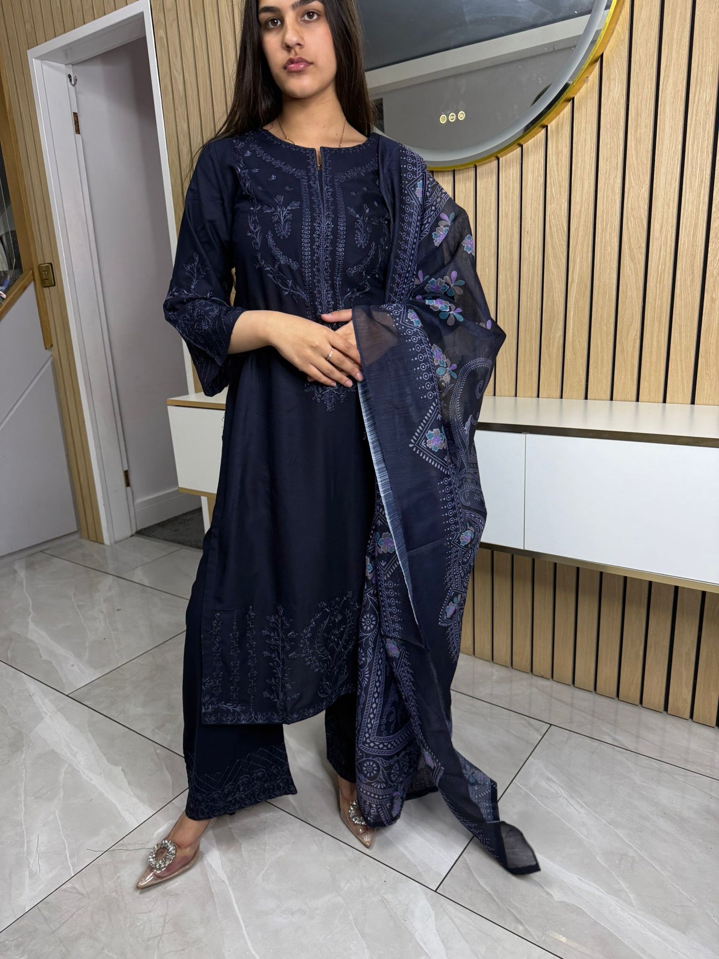 Product Description:Make a statement with our beautifully crafted 3-piece suit. This ensemble features a kameez with detailed thread embroidery and a stunning neckline, paired with tailored trousers and a flowing khadi net dupatta. Available in sophisticated navy, rich green, and classic black, this suit is designed to enhance your elegance and charm.
