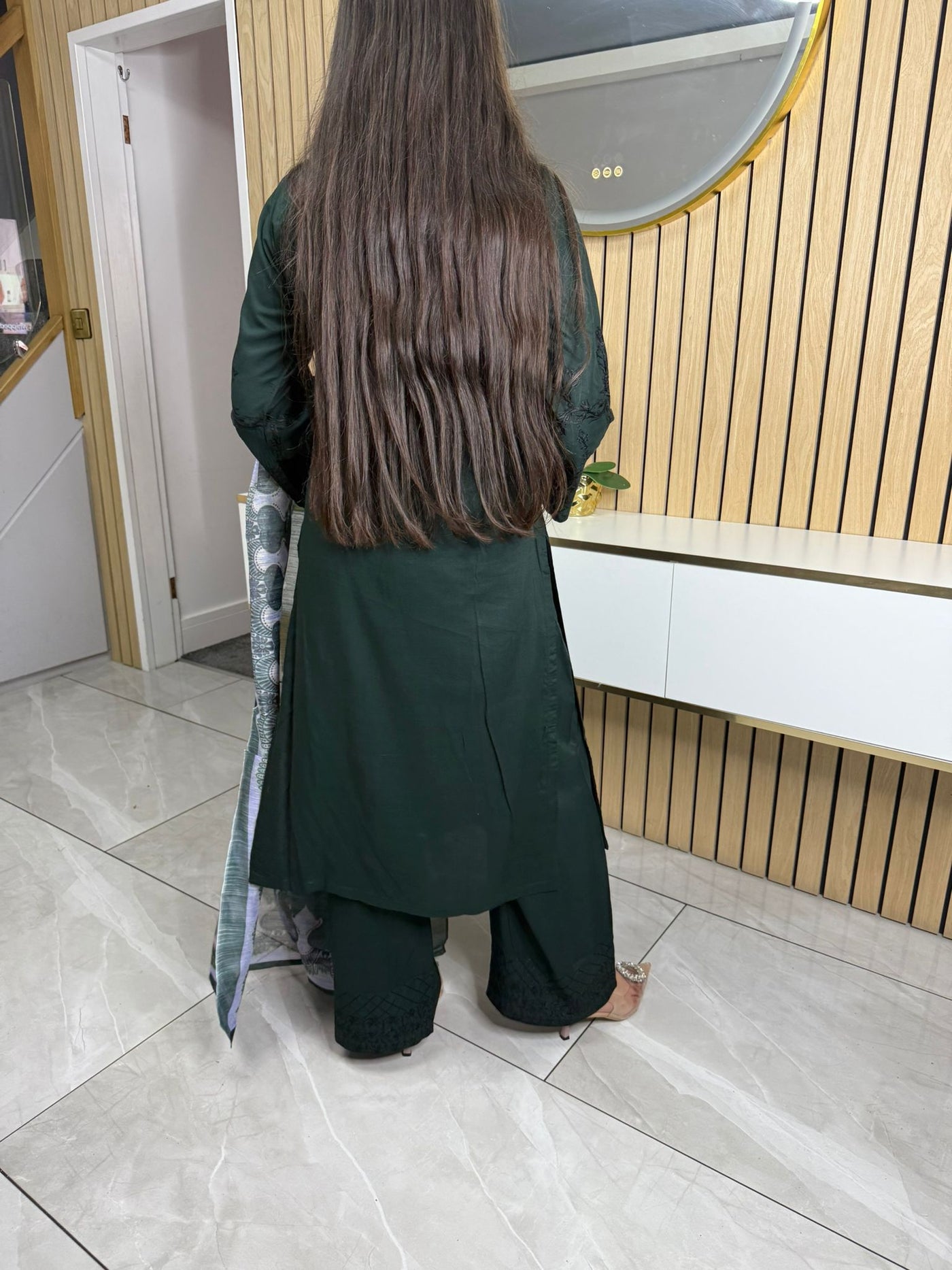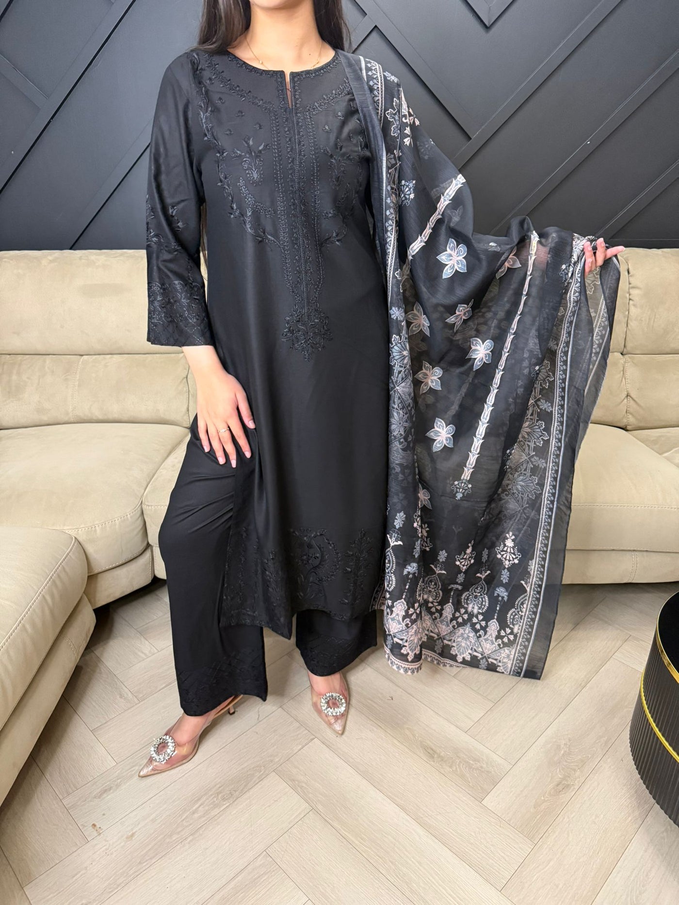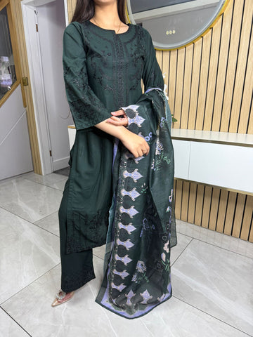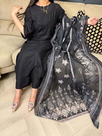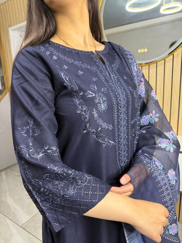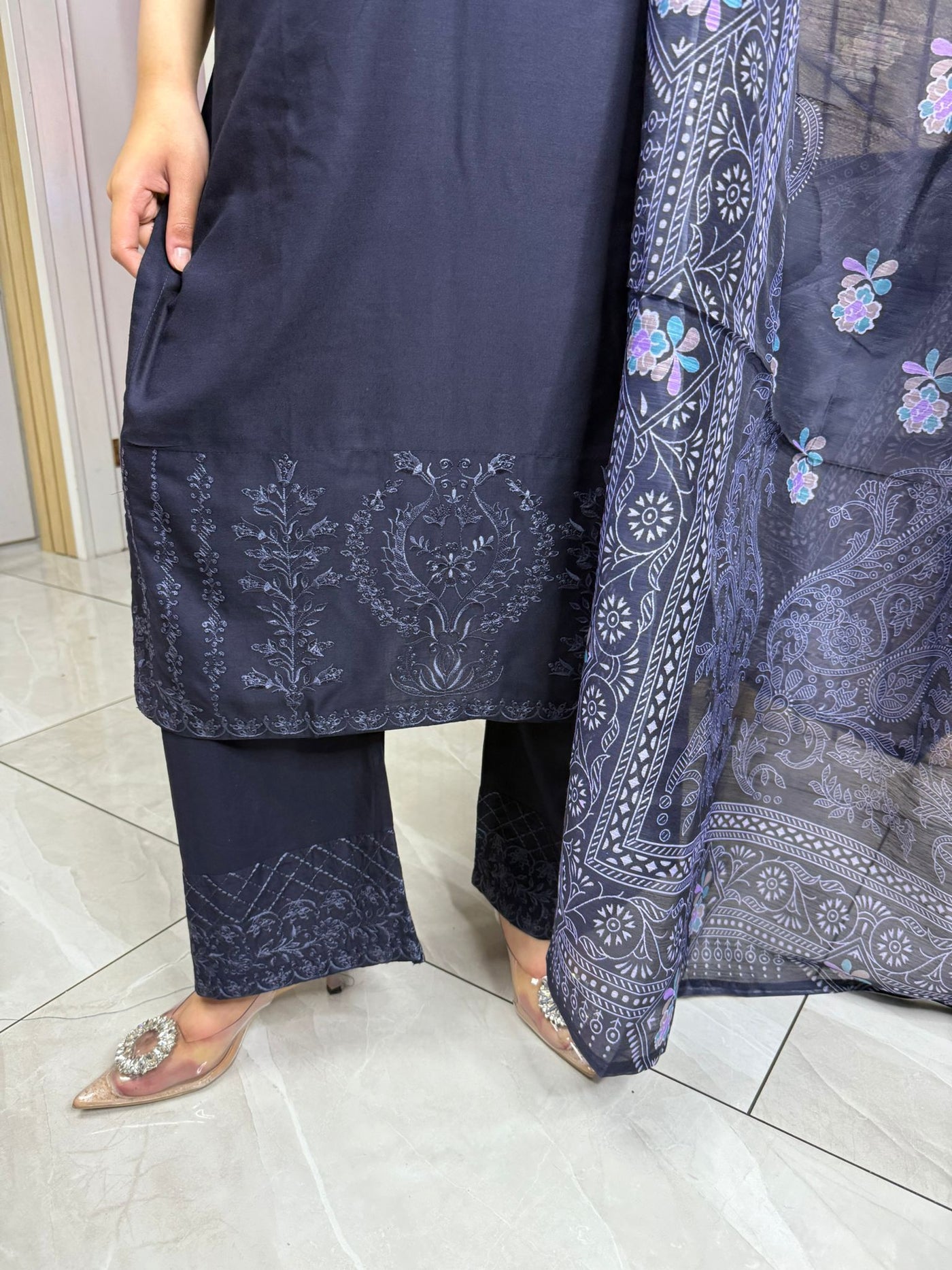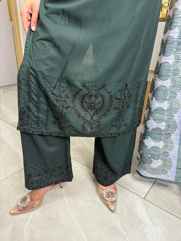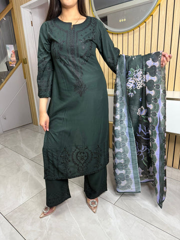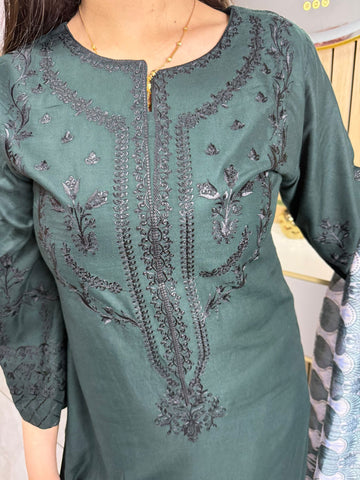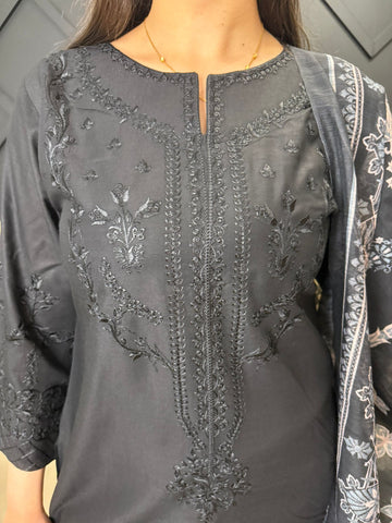 Product Description:Make a statement with our beautifully crafted 3-piece suit. This ensemble features a kameez with detailed thread embroidery and a stunning neckline, paired with tailored trousers and a flowing khadi net dupatta. Available in sophisticated navy, rich green, and classic black, this suit is designed to enhance your elegance and charm.