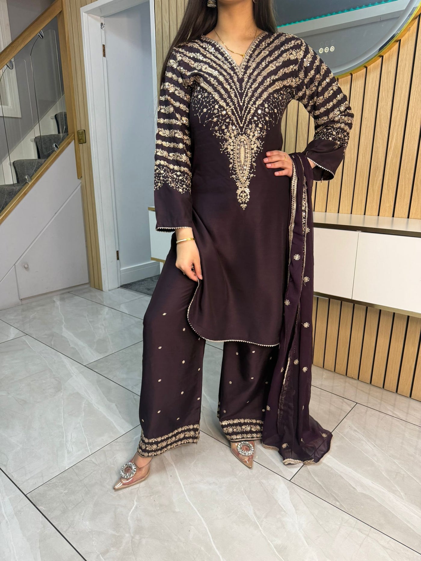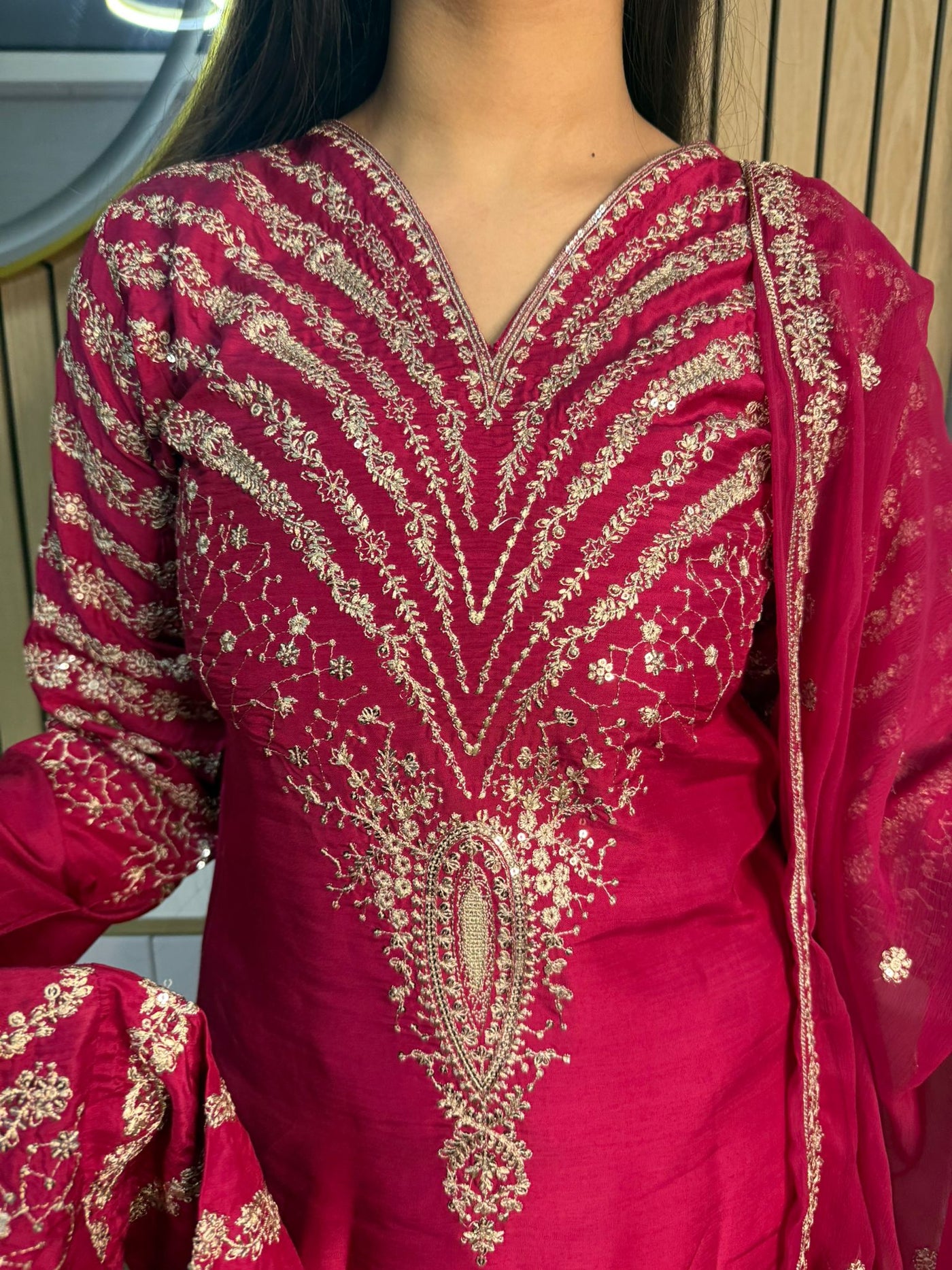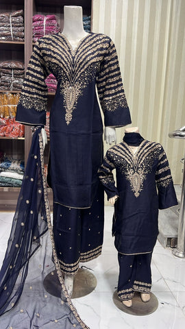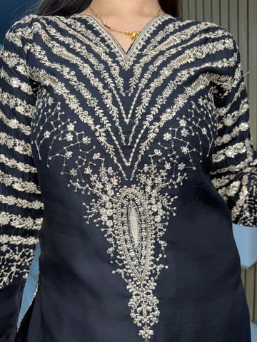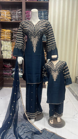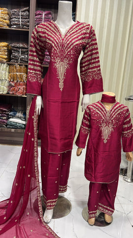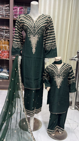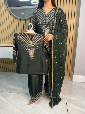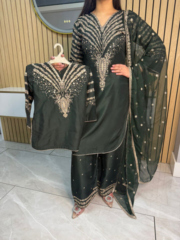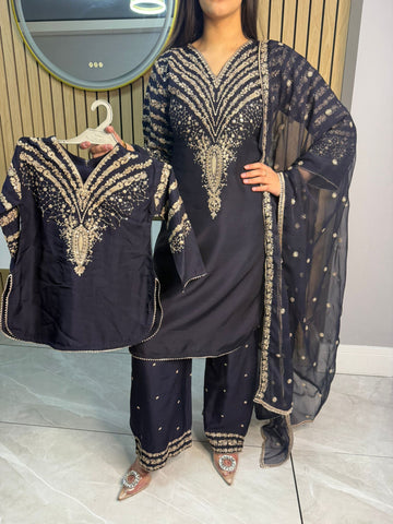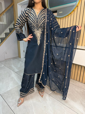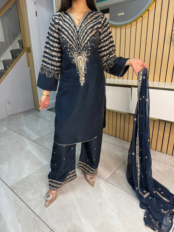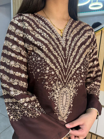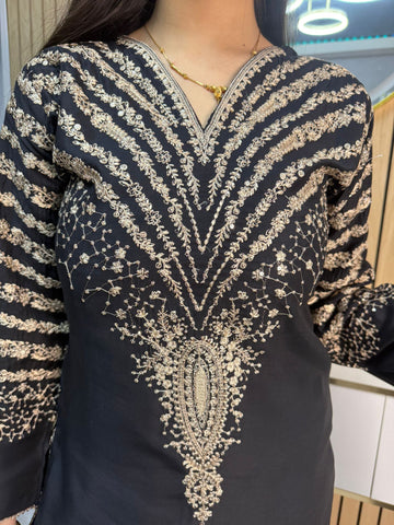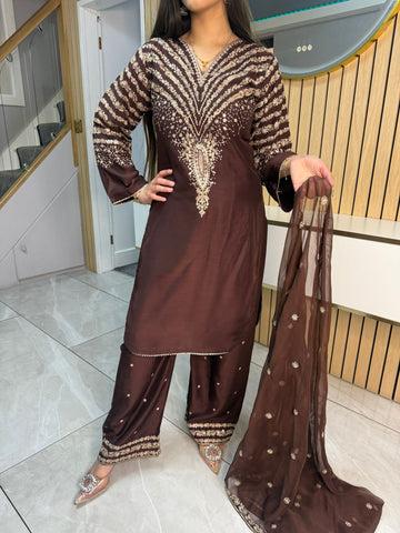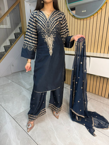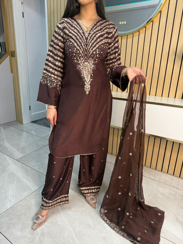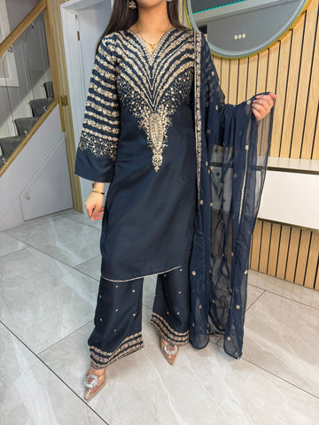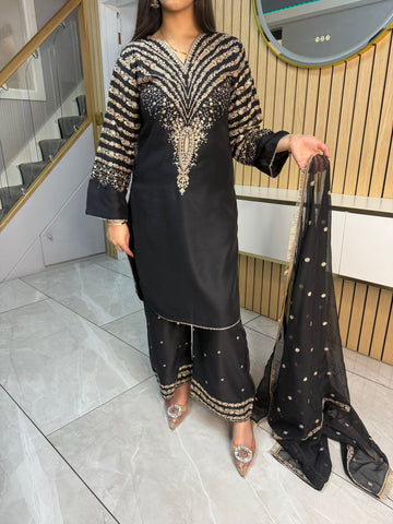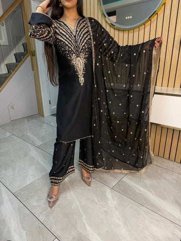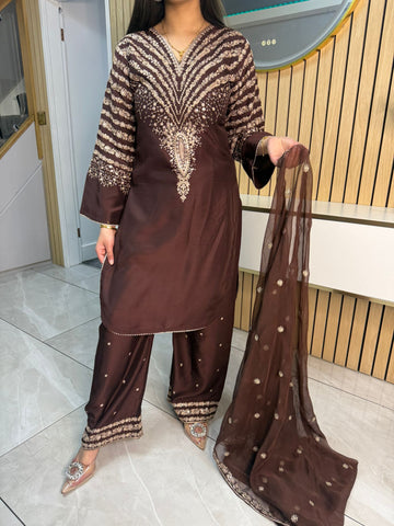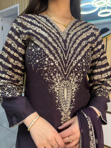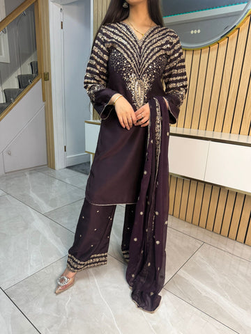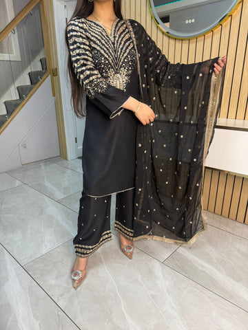 Celebrate Eid in style with our exquisite 3-piece viscous collection. This elegant set features a kameez and contrasting Plazzo trousers, crafted from luxurious viscous fabric for a graceful drape and comfortable feel. The kameez is adorned with delicate gold neckline detailing and matching detail on the shalwar. The outfit is completed with a silk dupatta, providing a touch of ethereal beauty. This collection is designed to offer a stunning contrast in colours, where the kameez stands out.