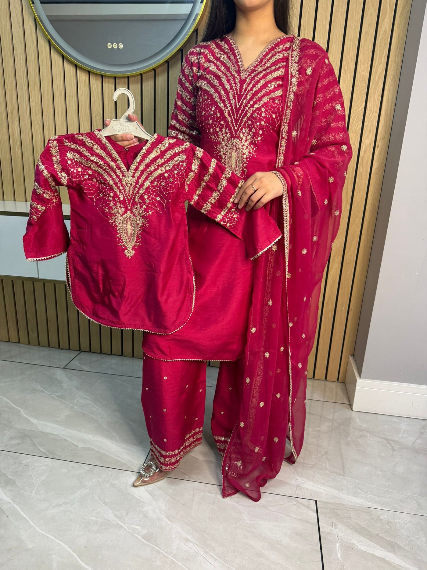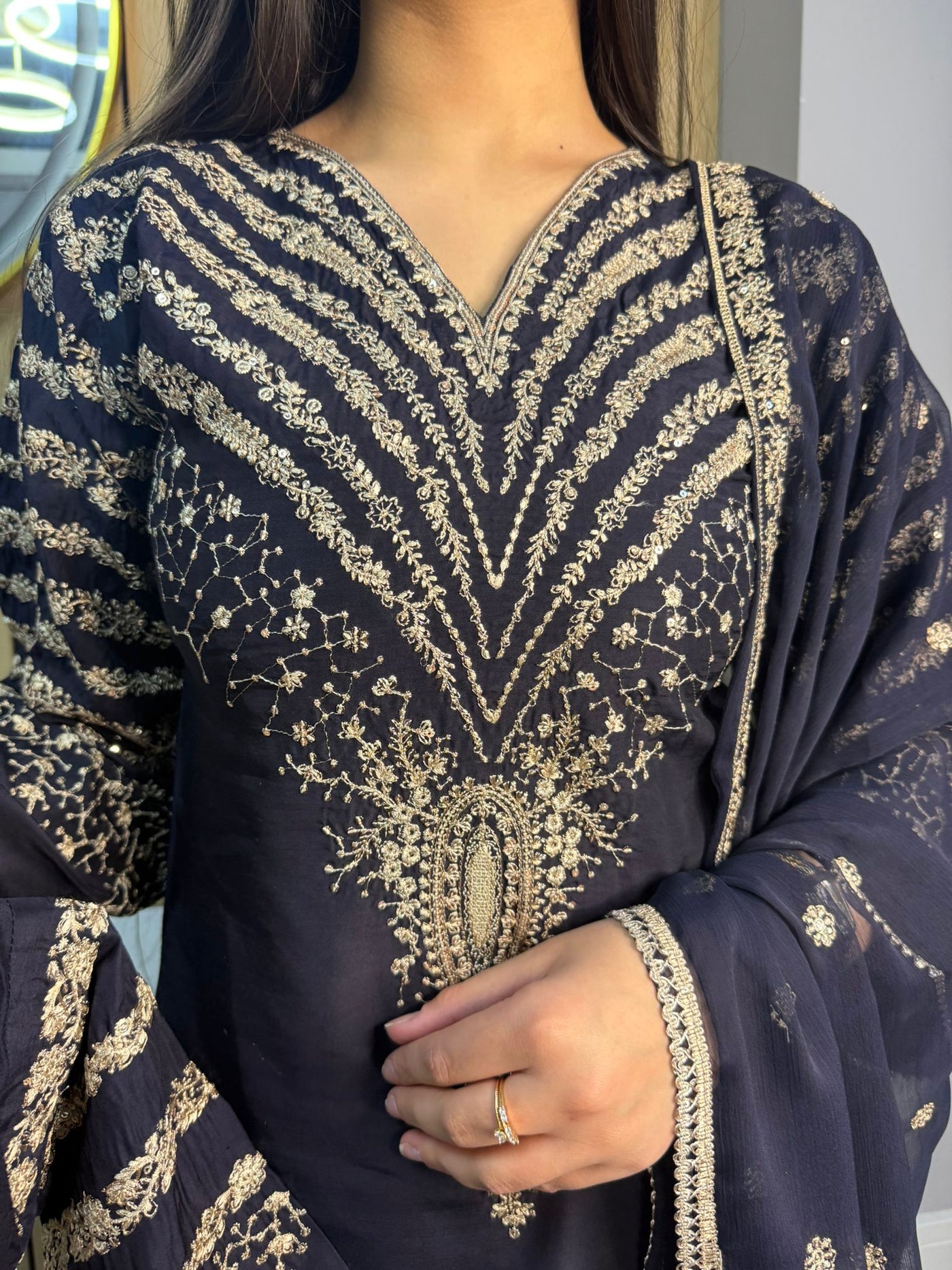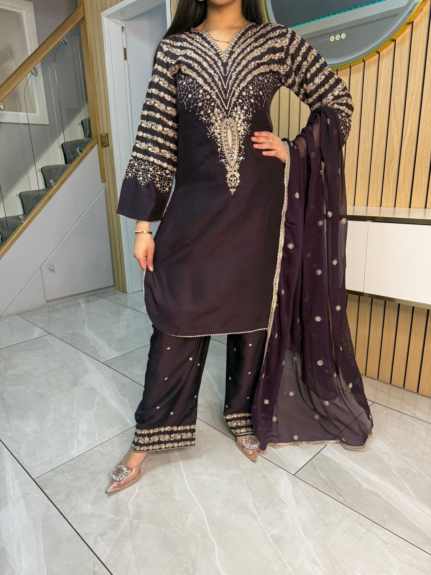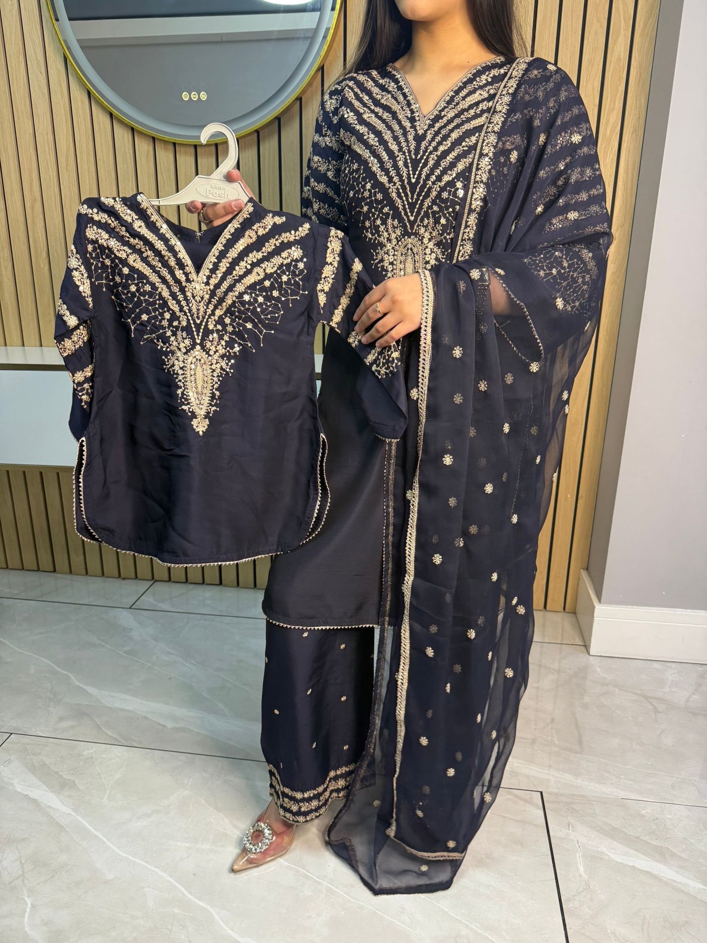 Celebrate Eid in style with our exquisite 3-piece viscous collection. This elegant set features a kameez and contrasting Plazzo trousers, crafted from luxurious viscous fabric for a graceful drape and comfortable feel. The kameez is adorned with delicate gold neckline detailing and matching detail on the shalwar. The outfit is completed with a silk dupatta, providing a touch of ethereal beauty. This collection is designed to offer a stunning contrast in colours, where the kameez stands out.