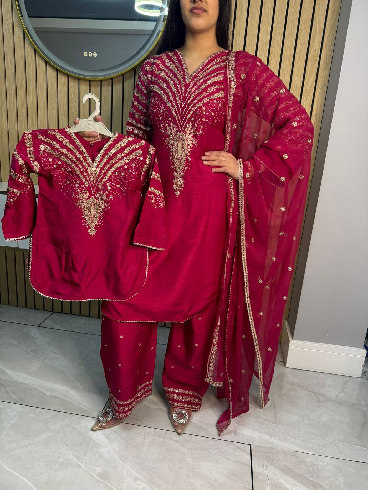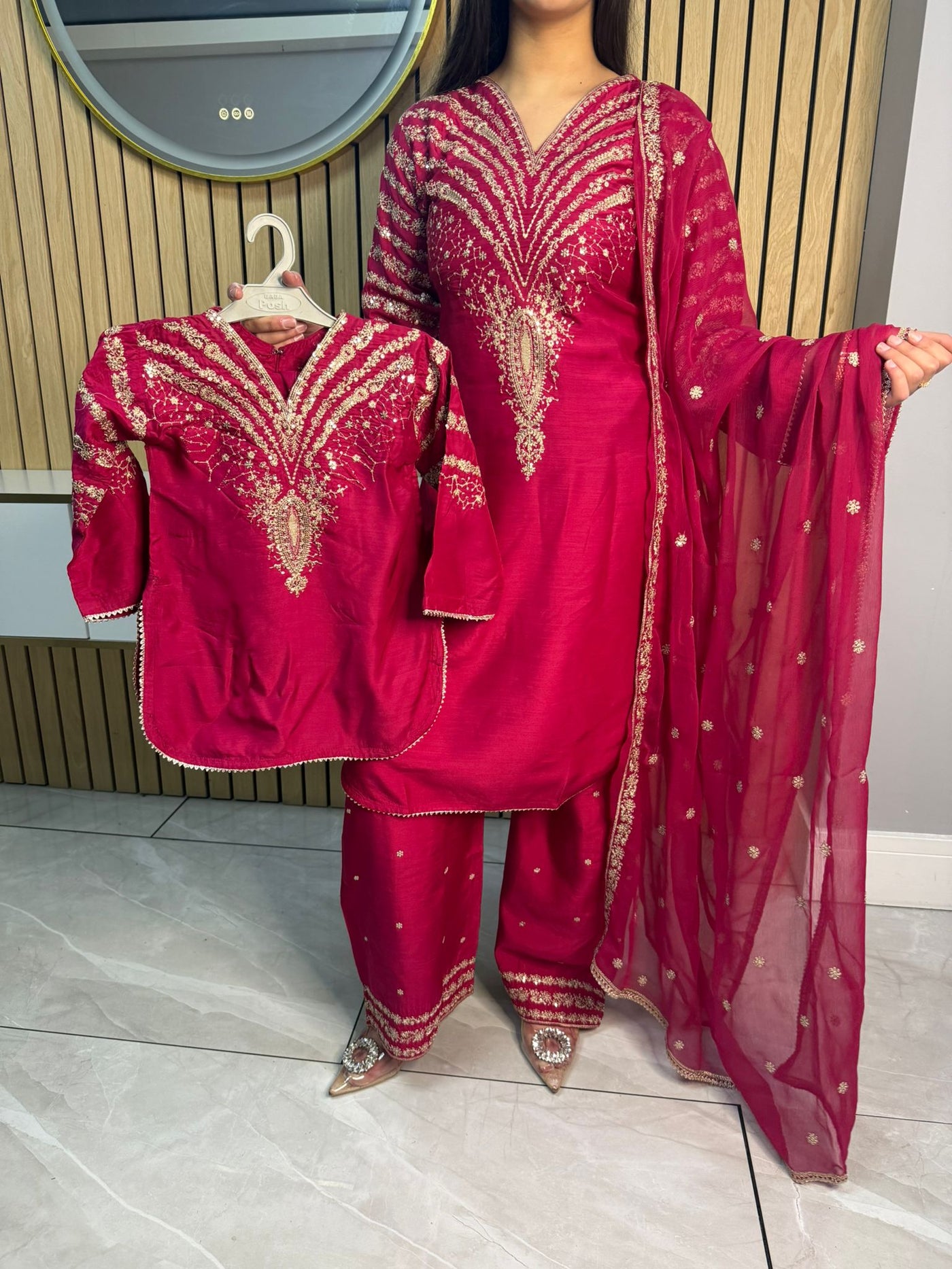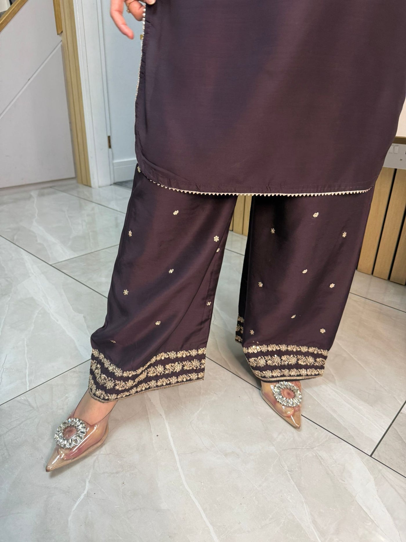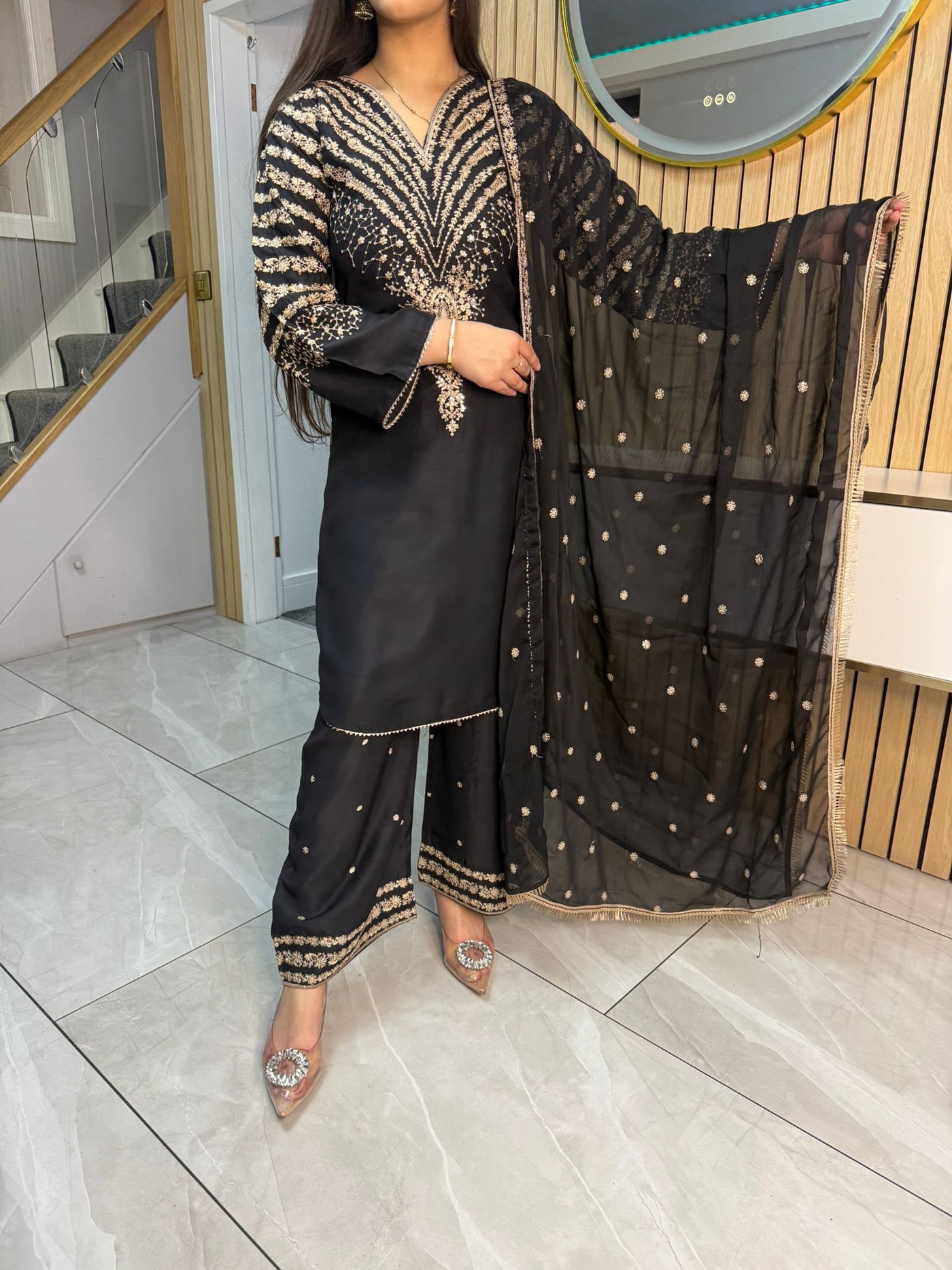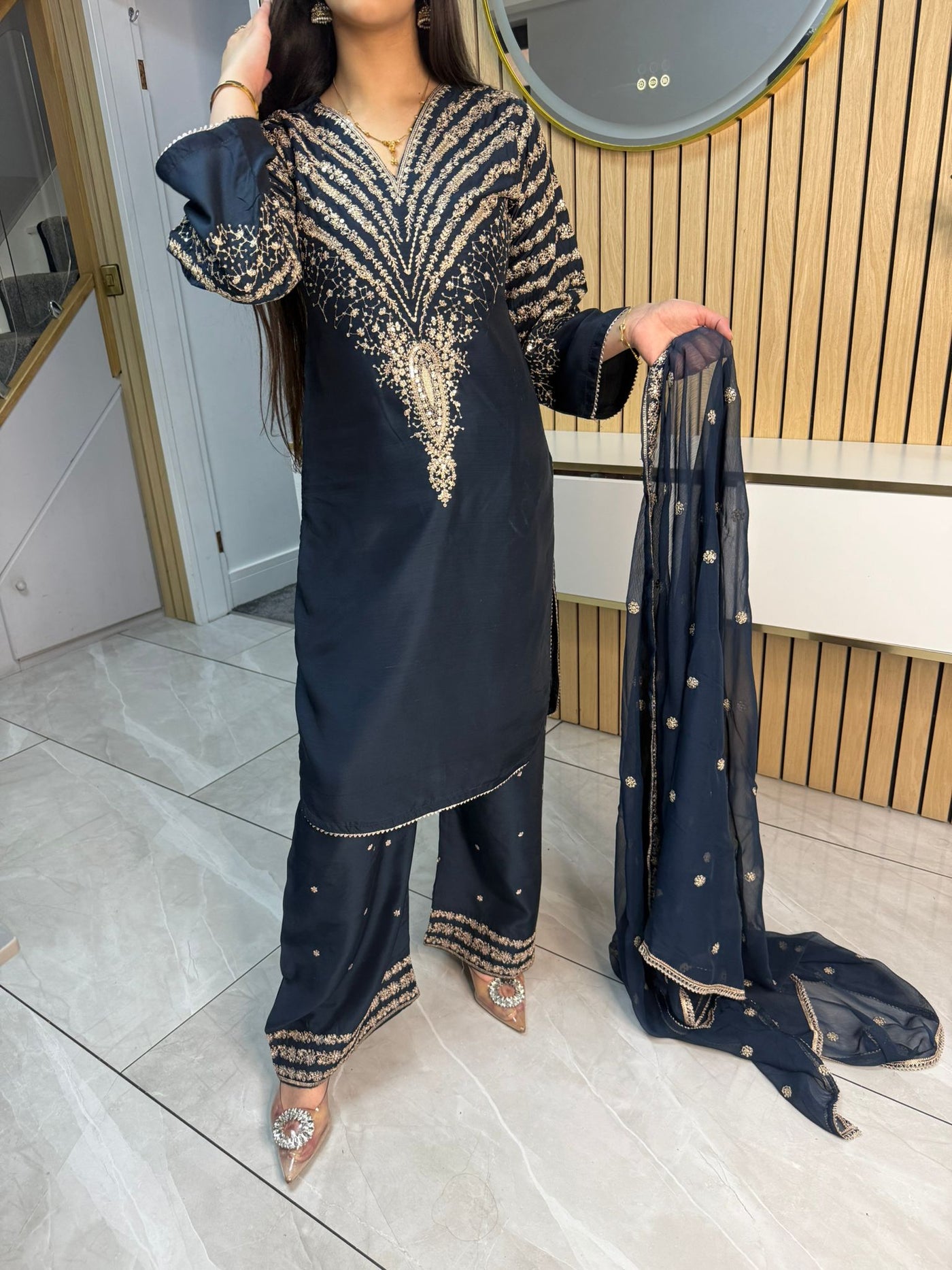 Celebrate Eid in style with our exquisite 3-piece viscous collection. This elegant set features a kameez and contrasting Plazzo trousers, crafted from luxurious viscous fabric for a graceful drape and comfortable feel. The kameez is adorned with delicate gold neckline detailing and matching detail on the shalwar. The outfit is completed with a silk dupatta, providing a touch of ethereal beauty. This collection is designed to offer a stunning contrast in colours, where the kameez stands out.