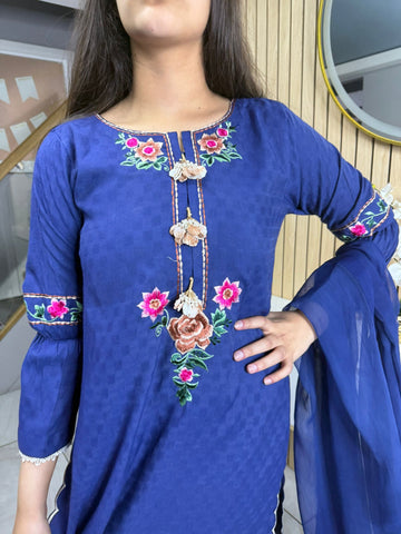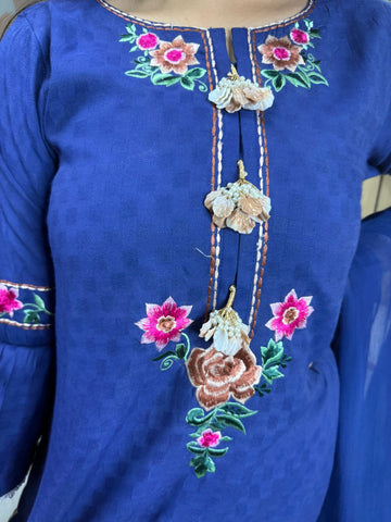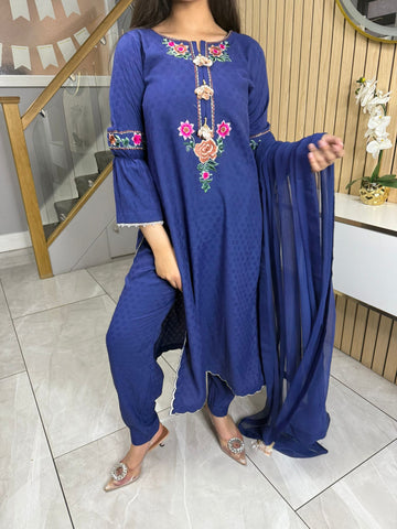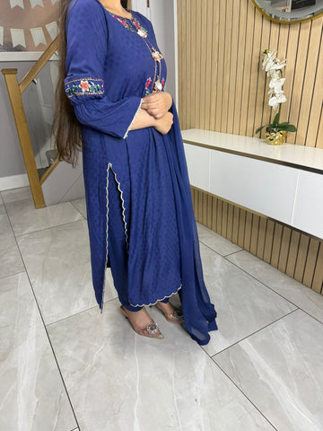 Product Description:Our 3-piece Marina suit offers effortless style and versatility. The long kameez and straight leg trousers create a flattering and comfortable fit, while the thread flower embroidery on the neckline adds a subtle yet elegant detail. Perfect for day or evening, this Marina suit is a timeless addition to any wardrobe. A coordinating dupatta completes the set.
