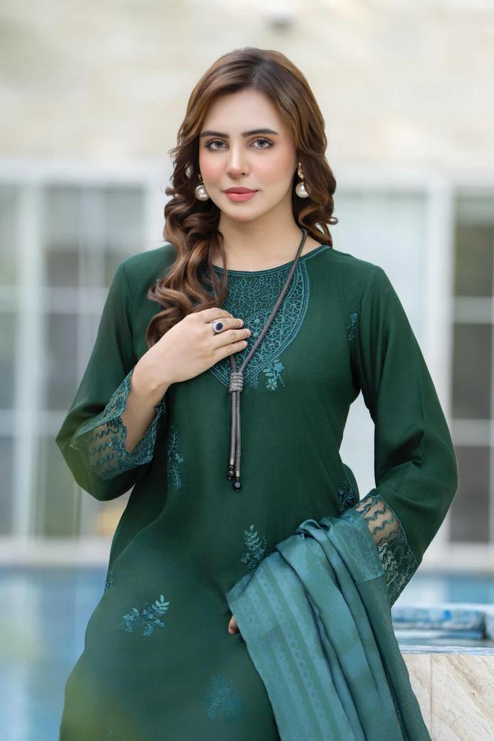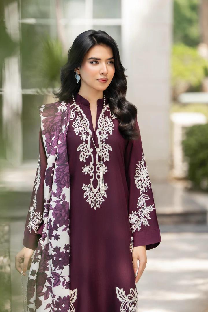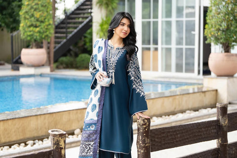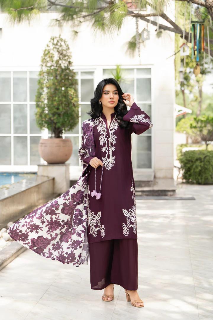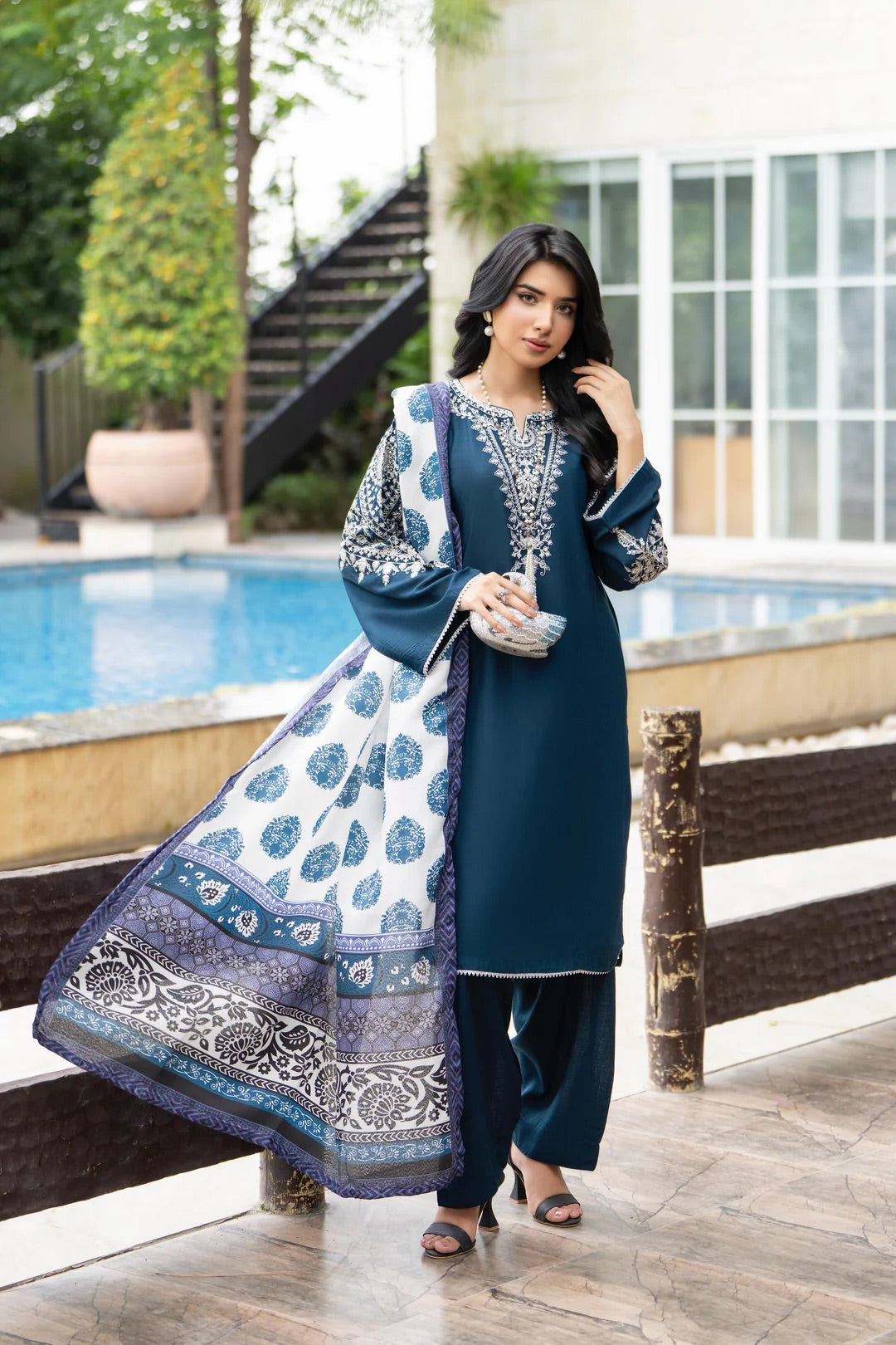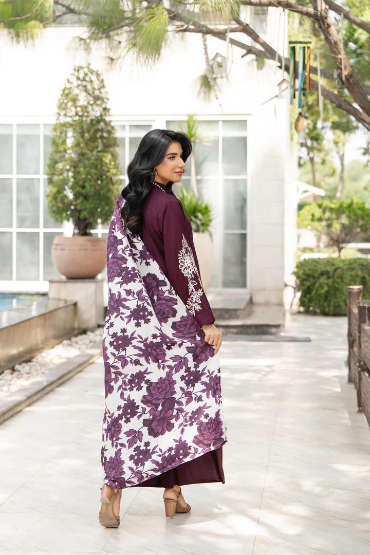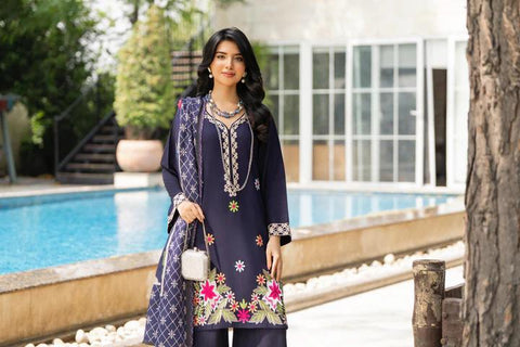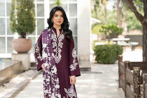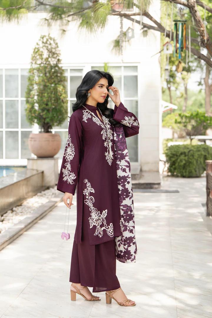 Crafted from premium slub linen, this deep colour collection ensemble radiates timeless sophistication. The straight-cut kameez features intricate tonal embroidery across the neckline and hem, complemented by delicate lace detailing on the sleeves. Paired with matching trousers and a beautifully woven dupatta, it's a perfect blend of elegance and comfort - ideal for both festive gatherings and elegant evenings.