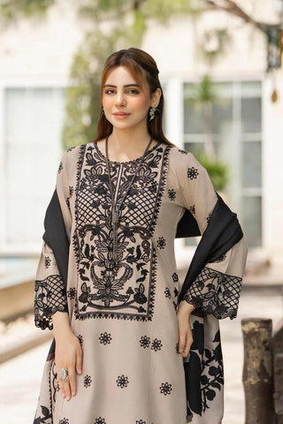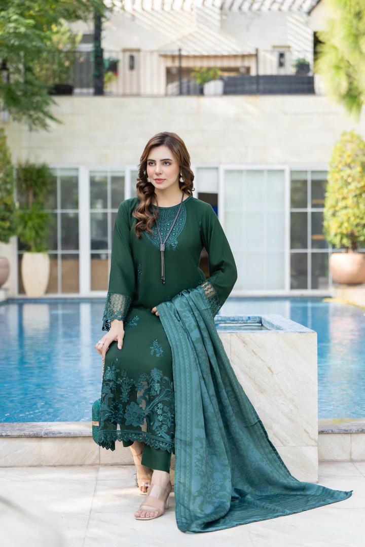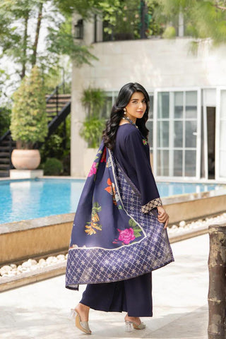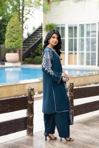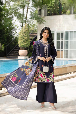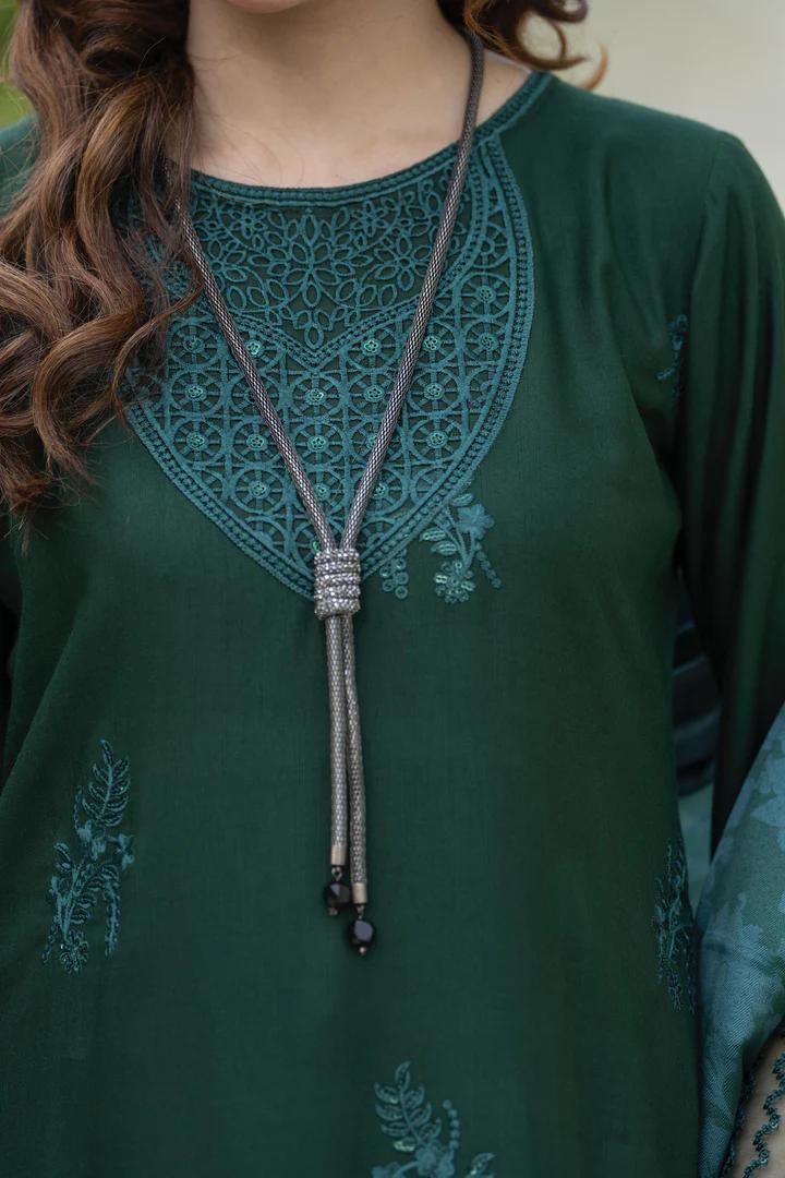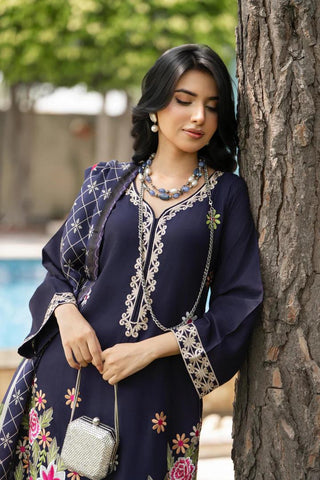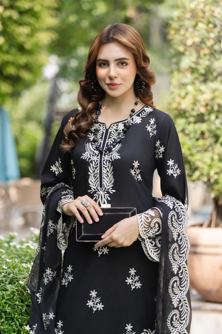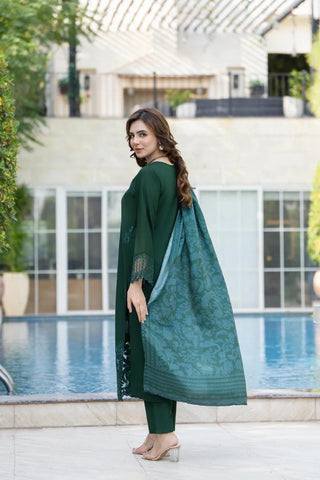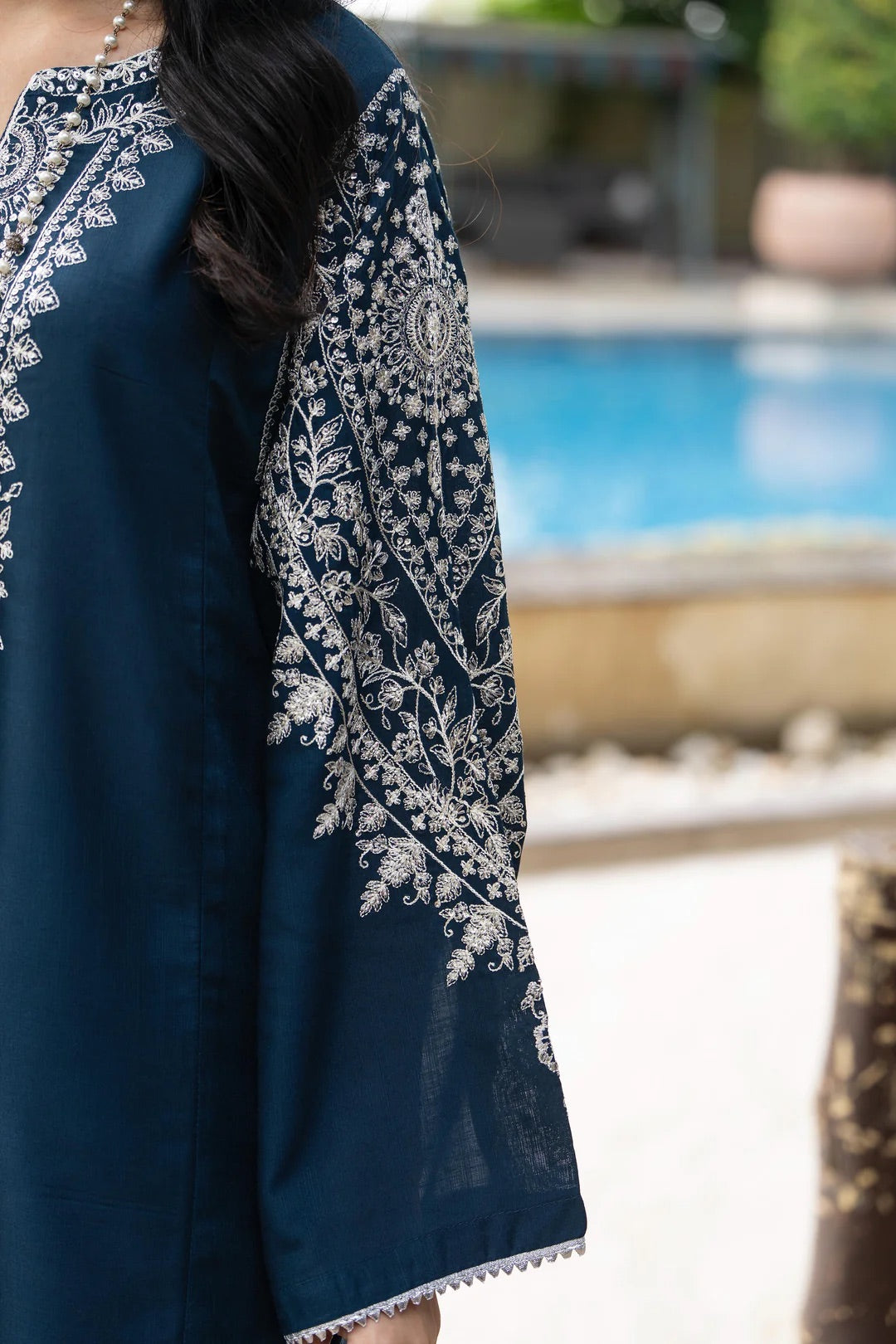 Crafted from premium slub linen, this deep colour collection ensemble radiates timeless sophistication. The straight-cut kameez features intricate tonal embroidery across the neckline and hem, complemented by delicate lace detailing on the sleeves. Paired with matching trousers and a beautifully woven dupatta, it's a perfect blend of elegance and comfort - ideal for both festive gatherings and elegant evenings.