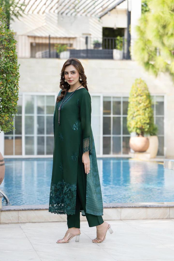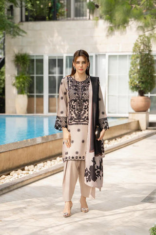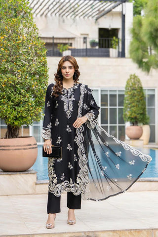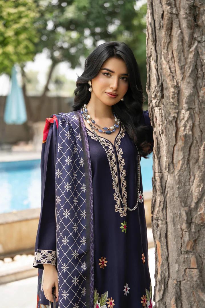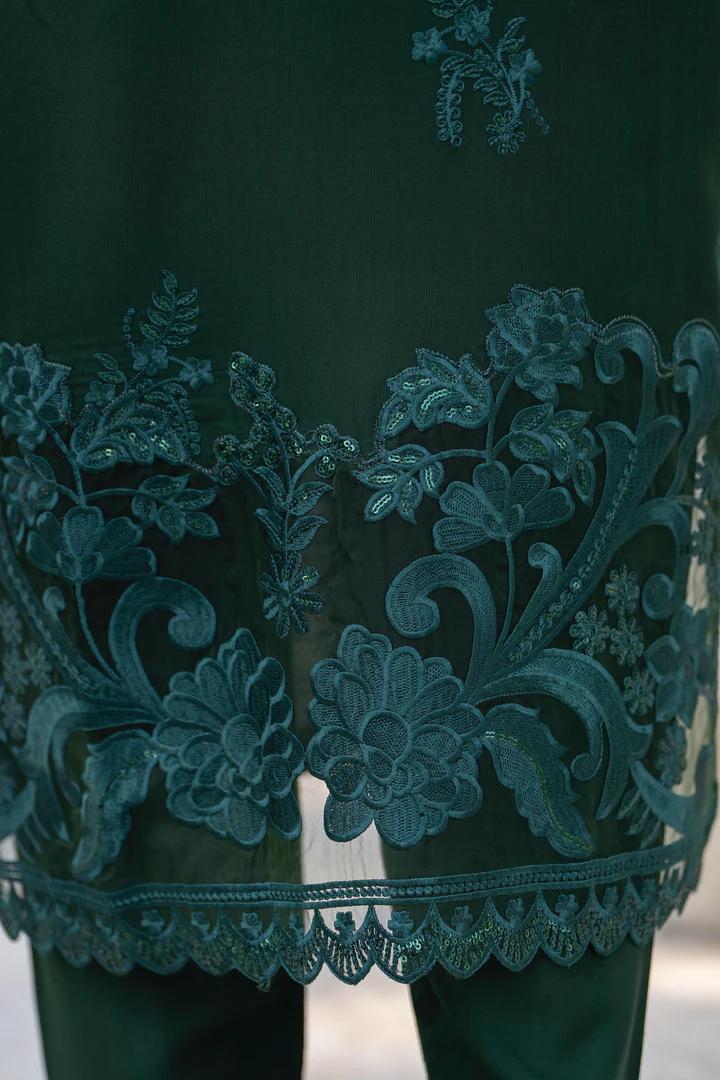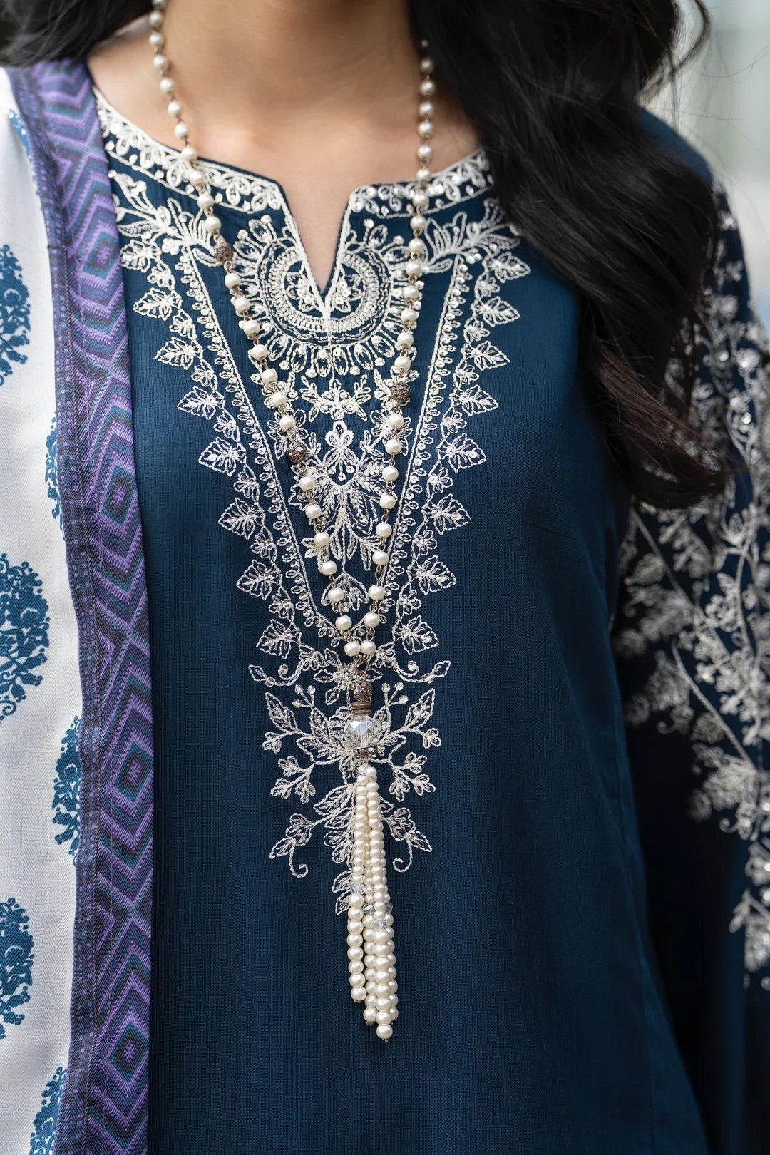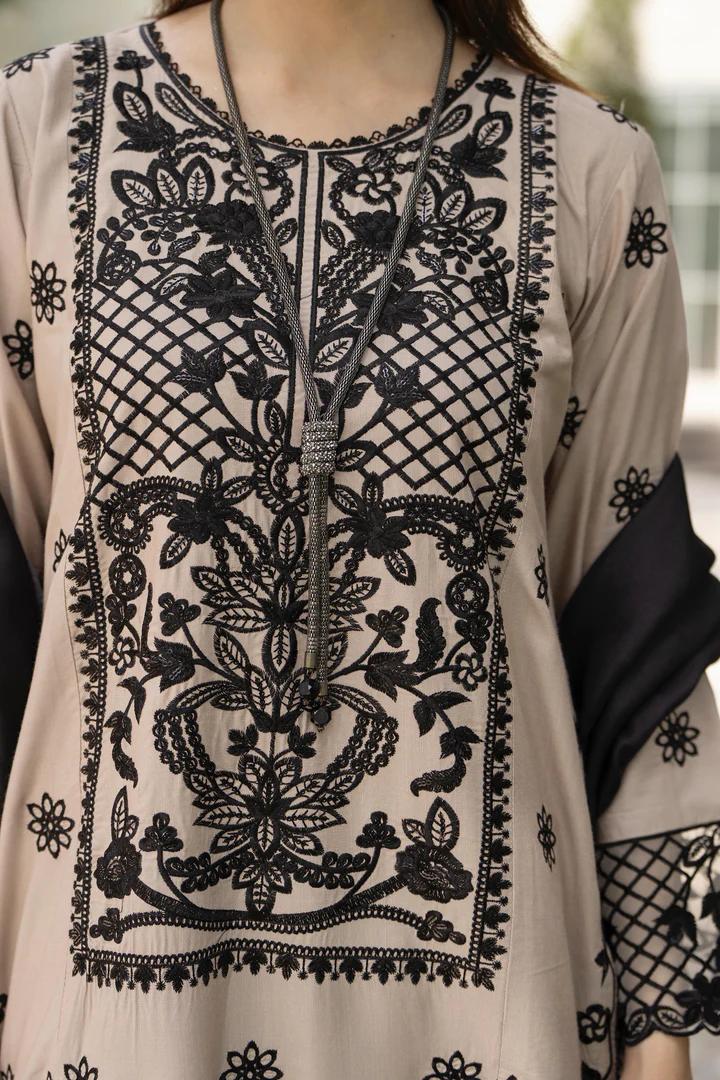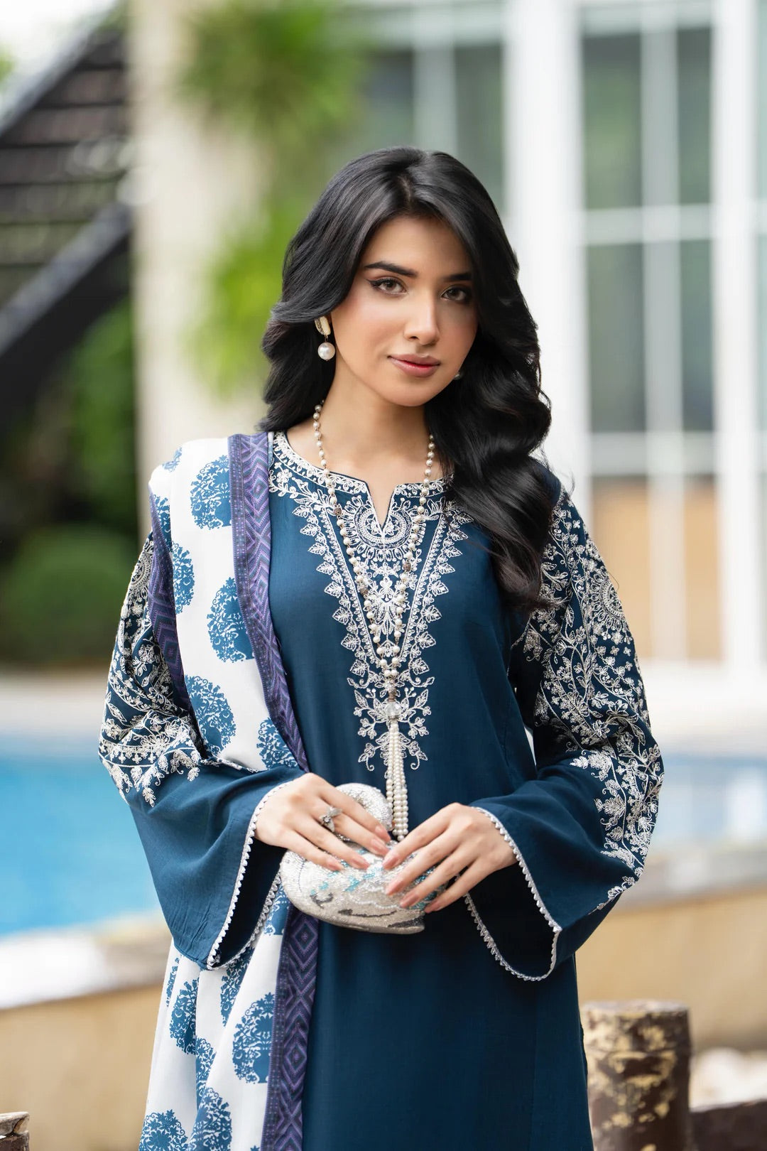 Crafted from premium slub linen, this deep colour collection ensemble radiates timeless sophistication. The straight-cut kameez features intricate tonal embroidery across the neckline and hem, complemented by delicate lace detailing on the sleeves. Paired with matching trousers and a beautifully woven dupatta, it's a perfect blend of elegance and comfort - ideal for both festive gatherings and elegant evenings.