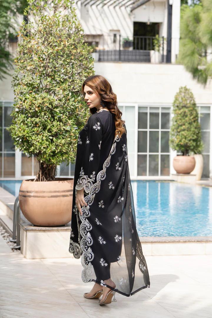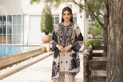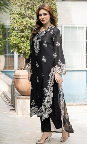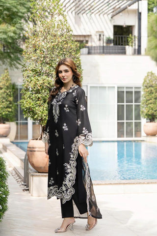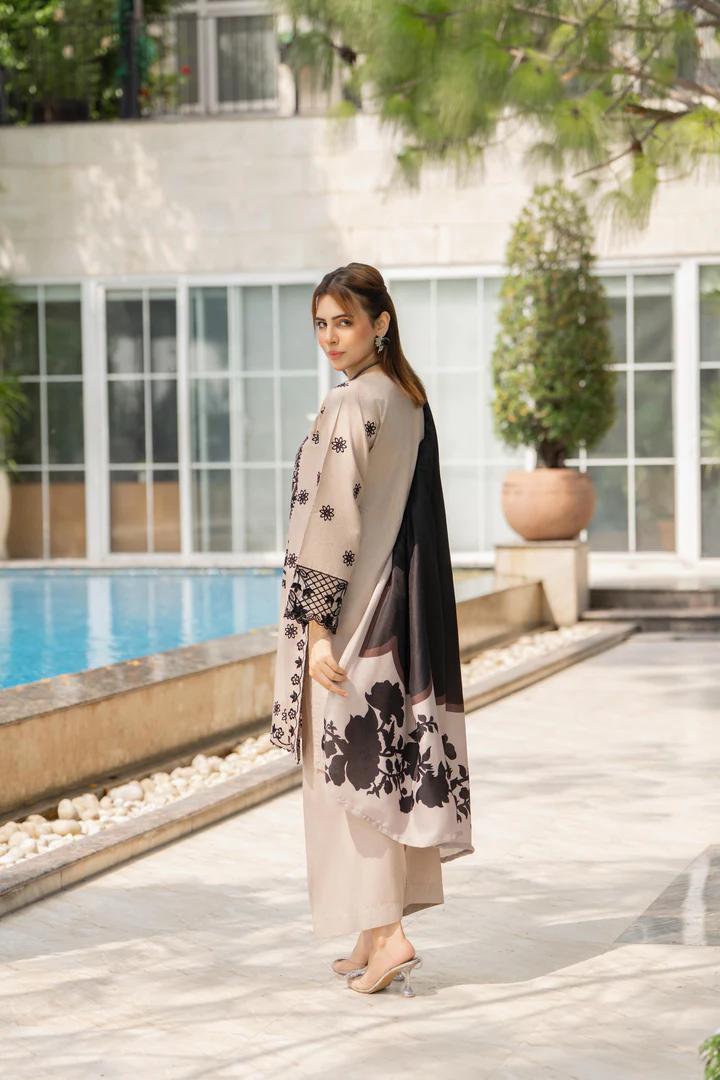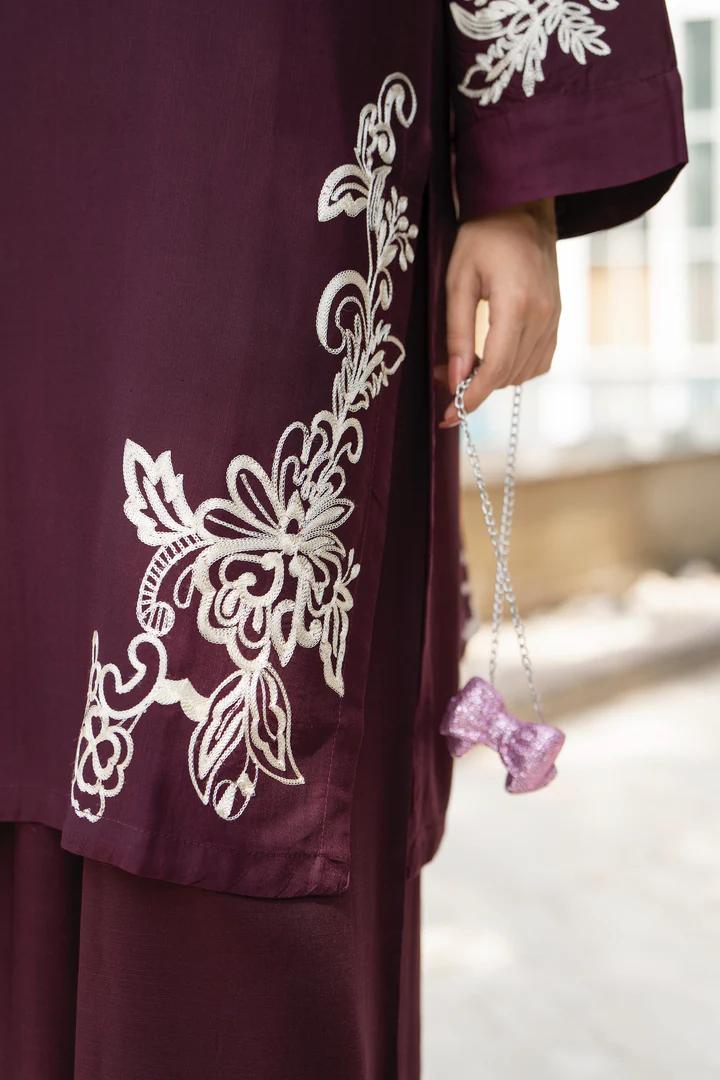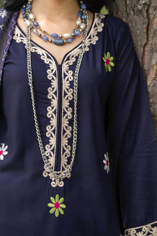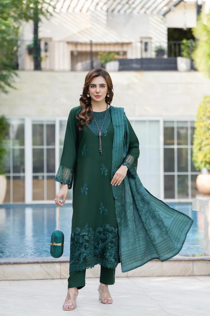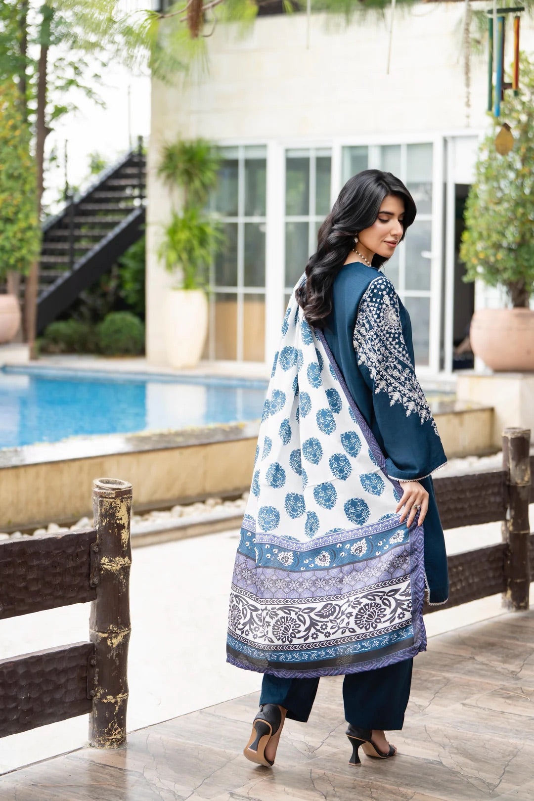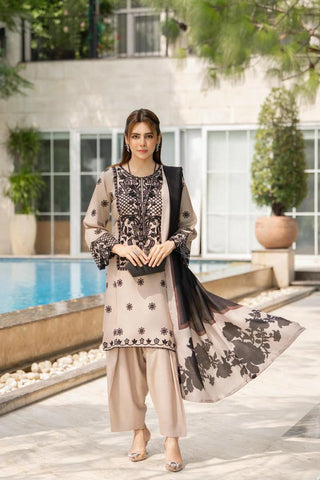 Crafted from premium slub linen, this deep colour collection ensemble radiates timeless sophistication. The straight-cut kameez features intricate tonal embroidery across the neckline and hem, complemented by delicate lace detailing on the sleeves. Paired with matching trousers and a beautifully woven dupatta, it's a perfect blend of elegance and comfort - ideal for both festive gatherings and elegant evenings.