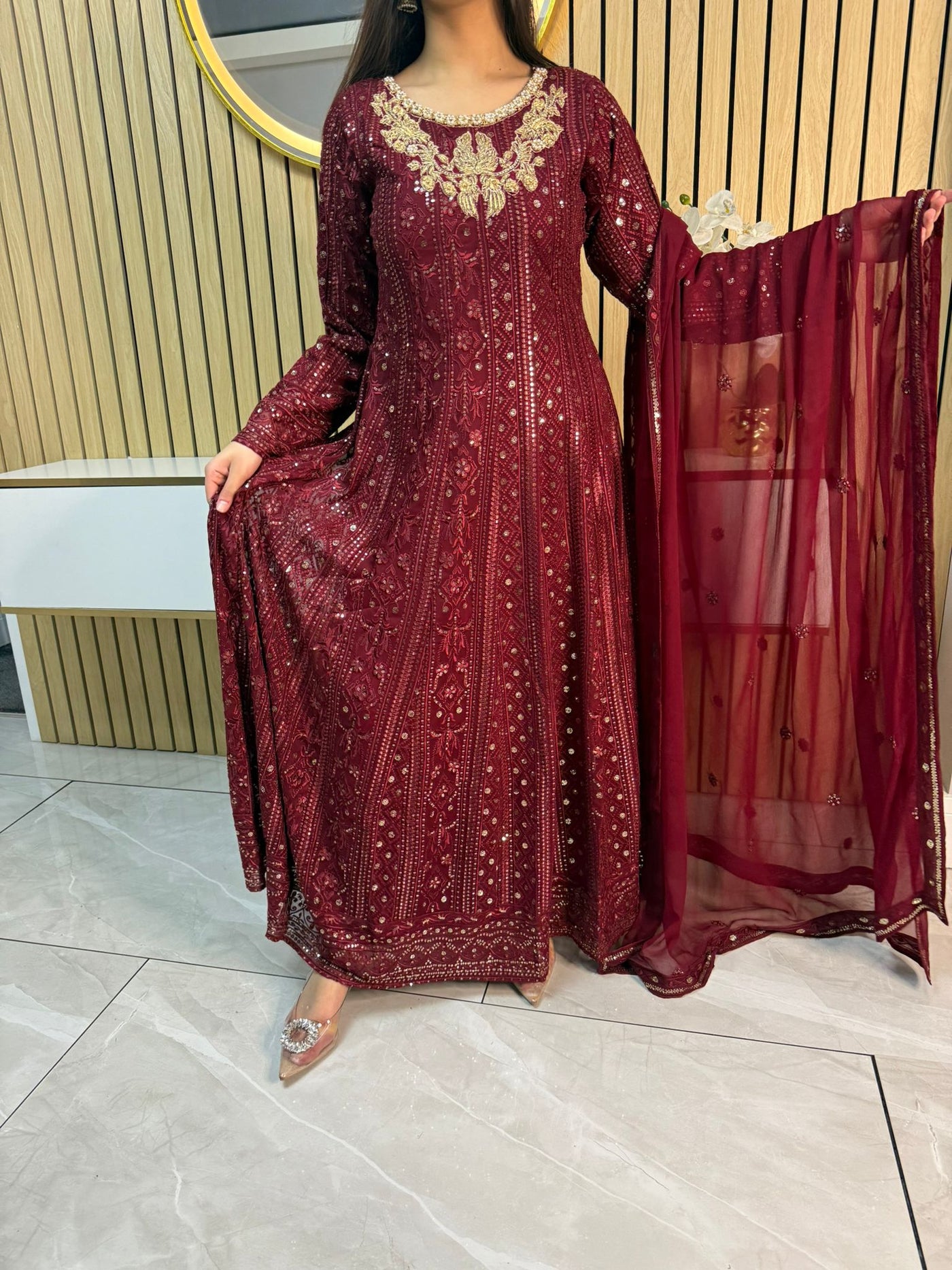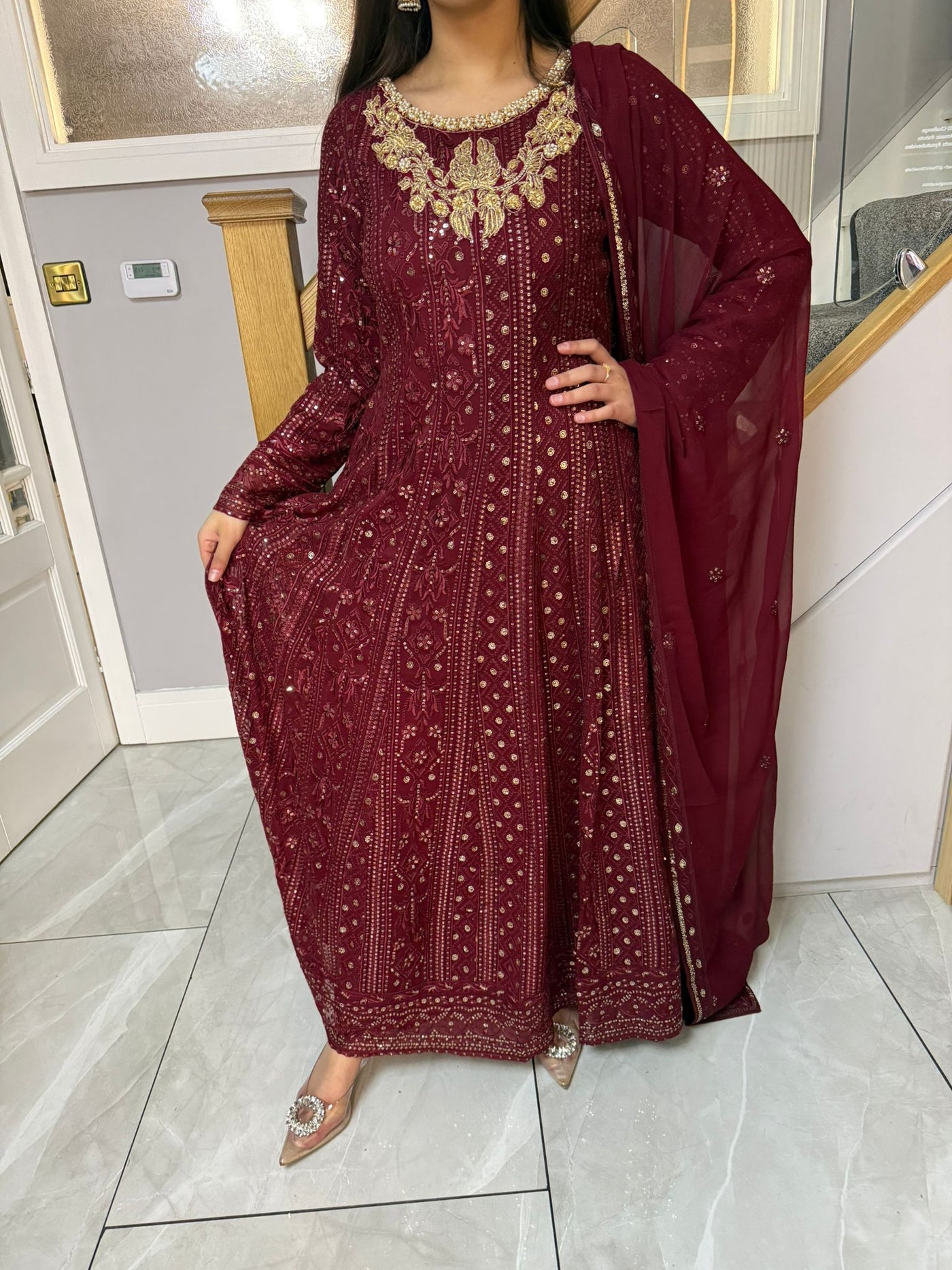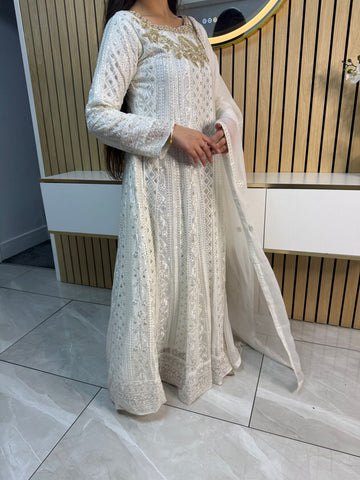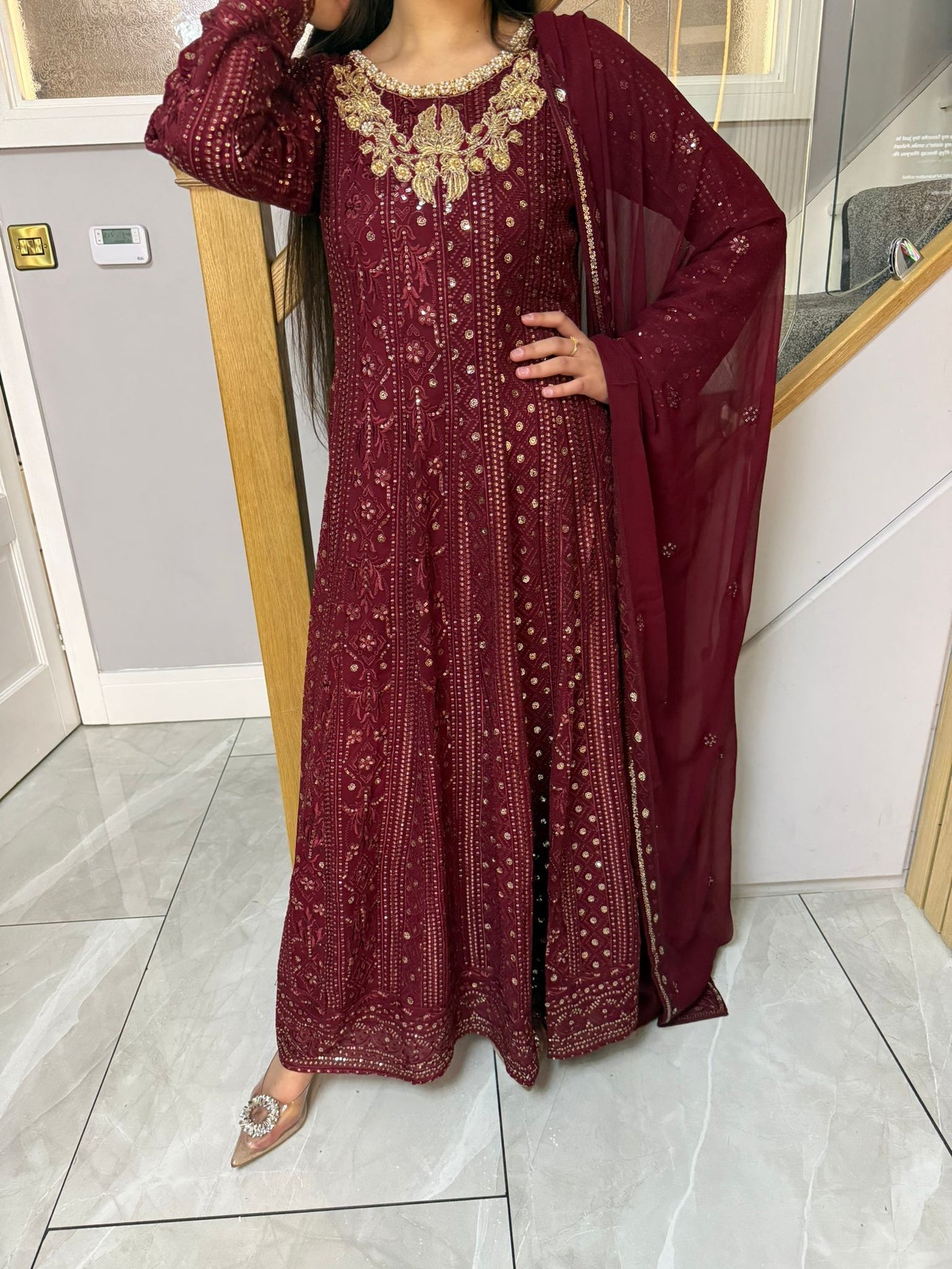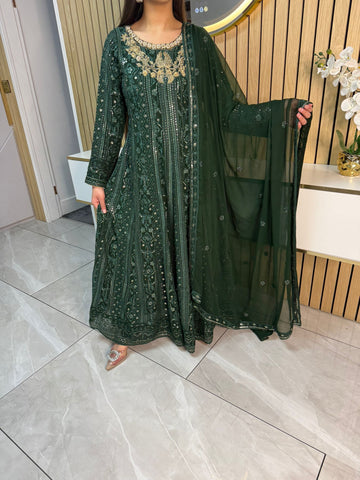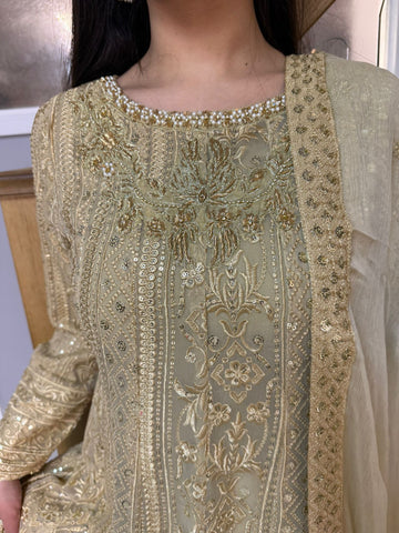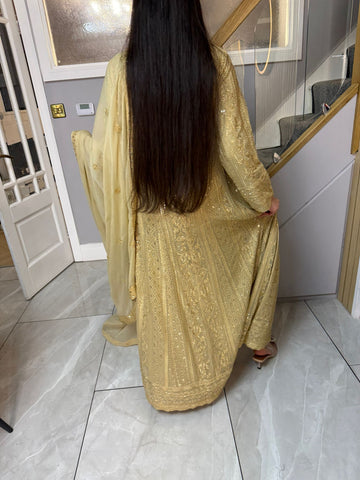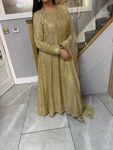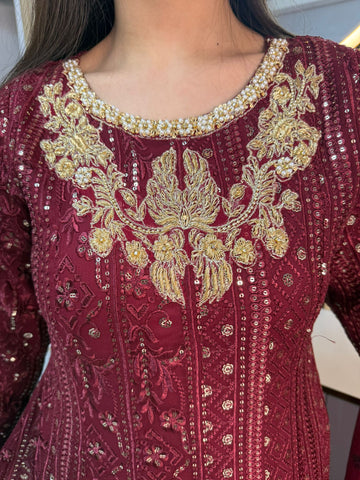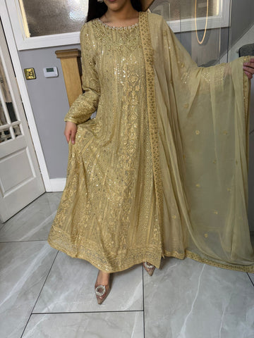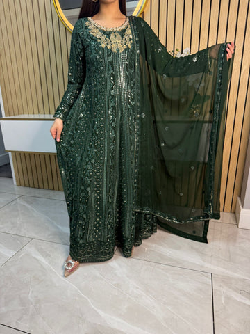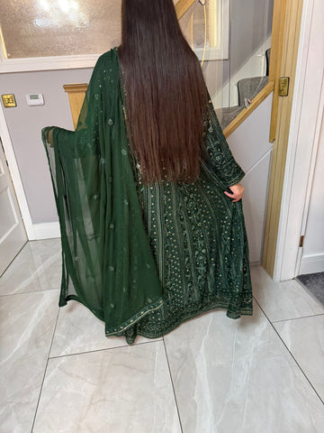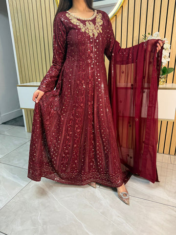 Fancy 3 piece maxi dress in chiffon material, embellished with sequins, gems and thread work . Accompanied with chiffon scarf.