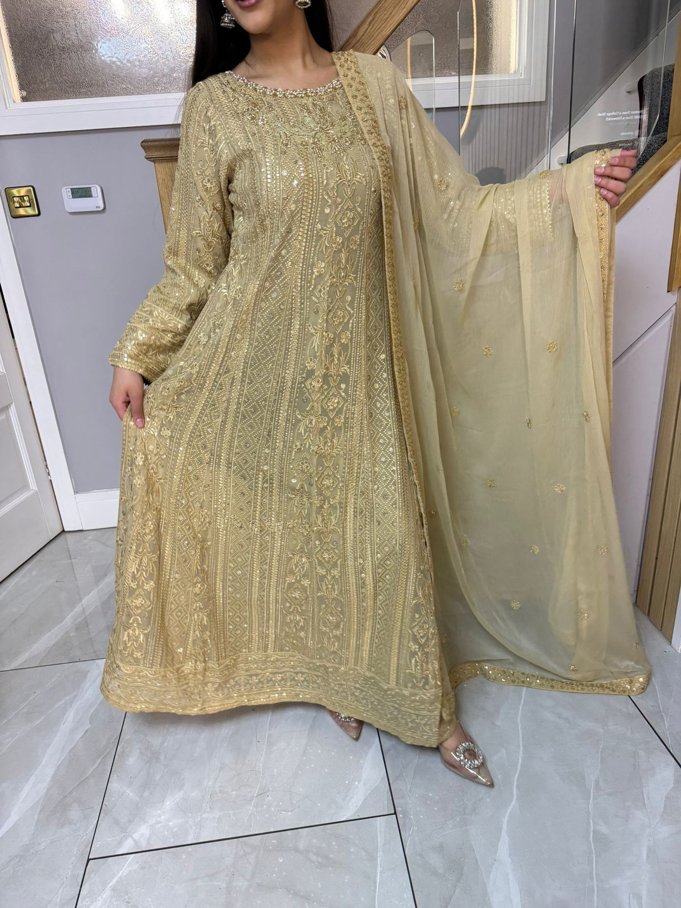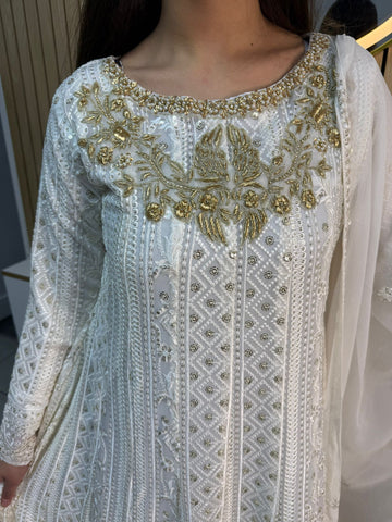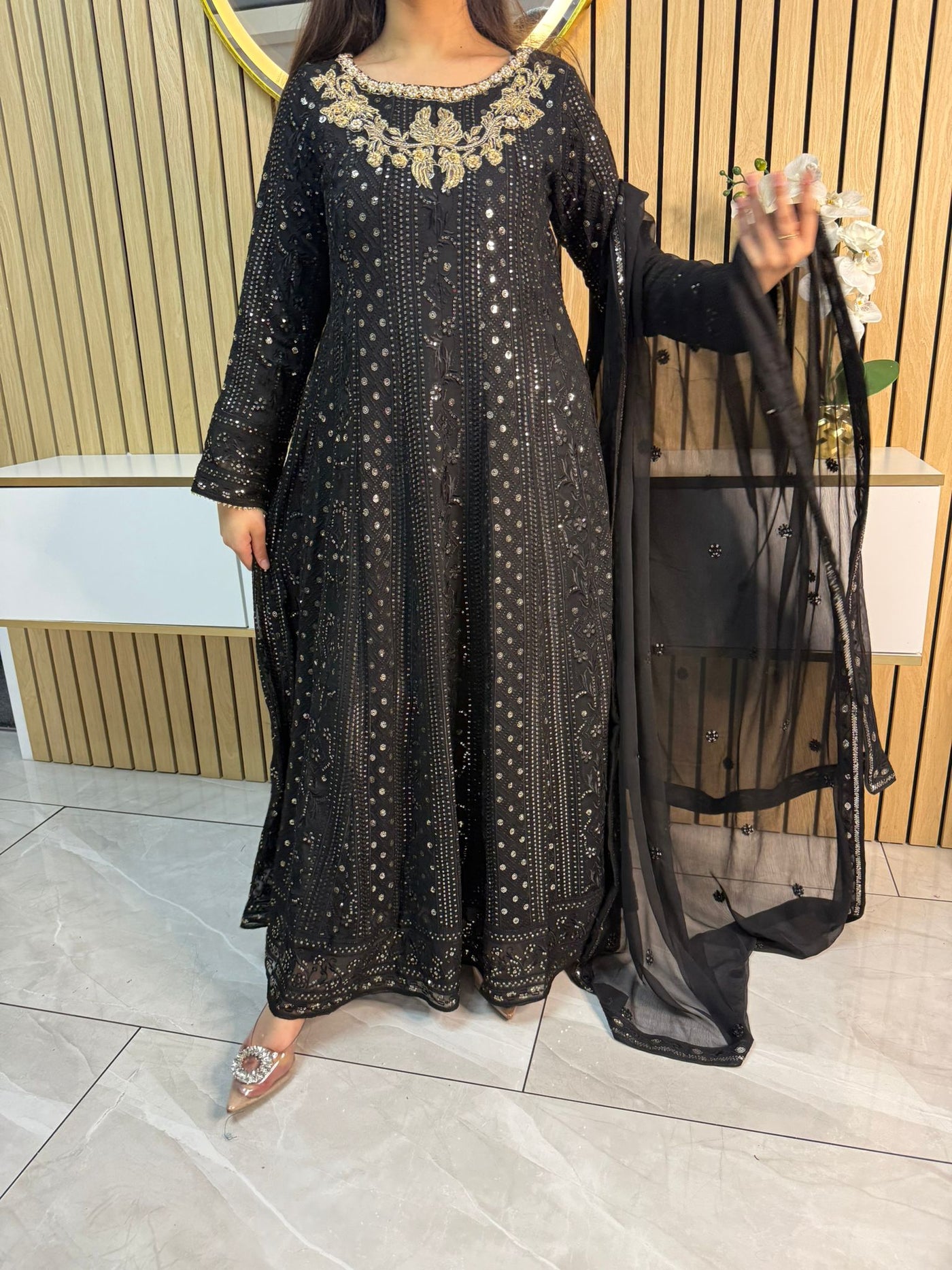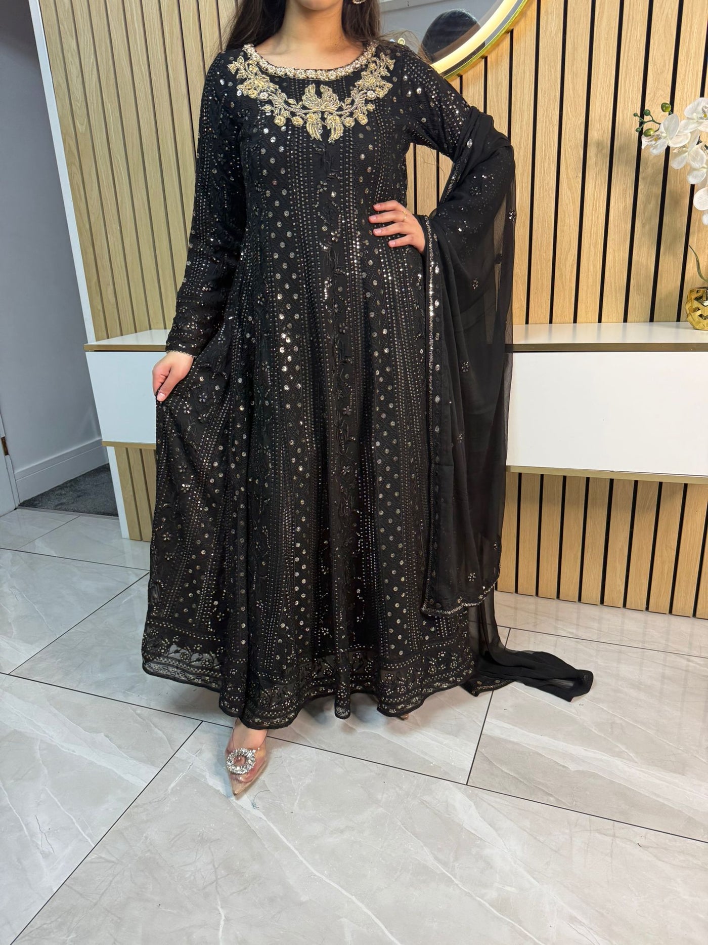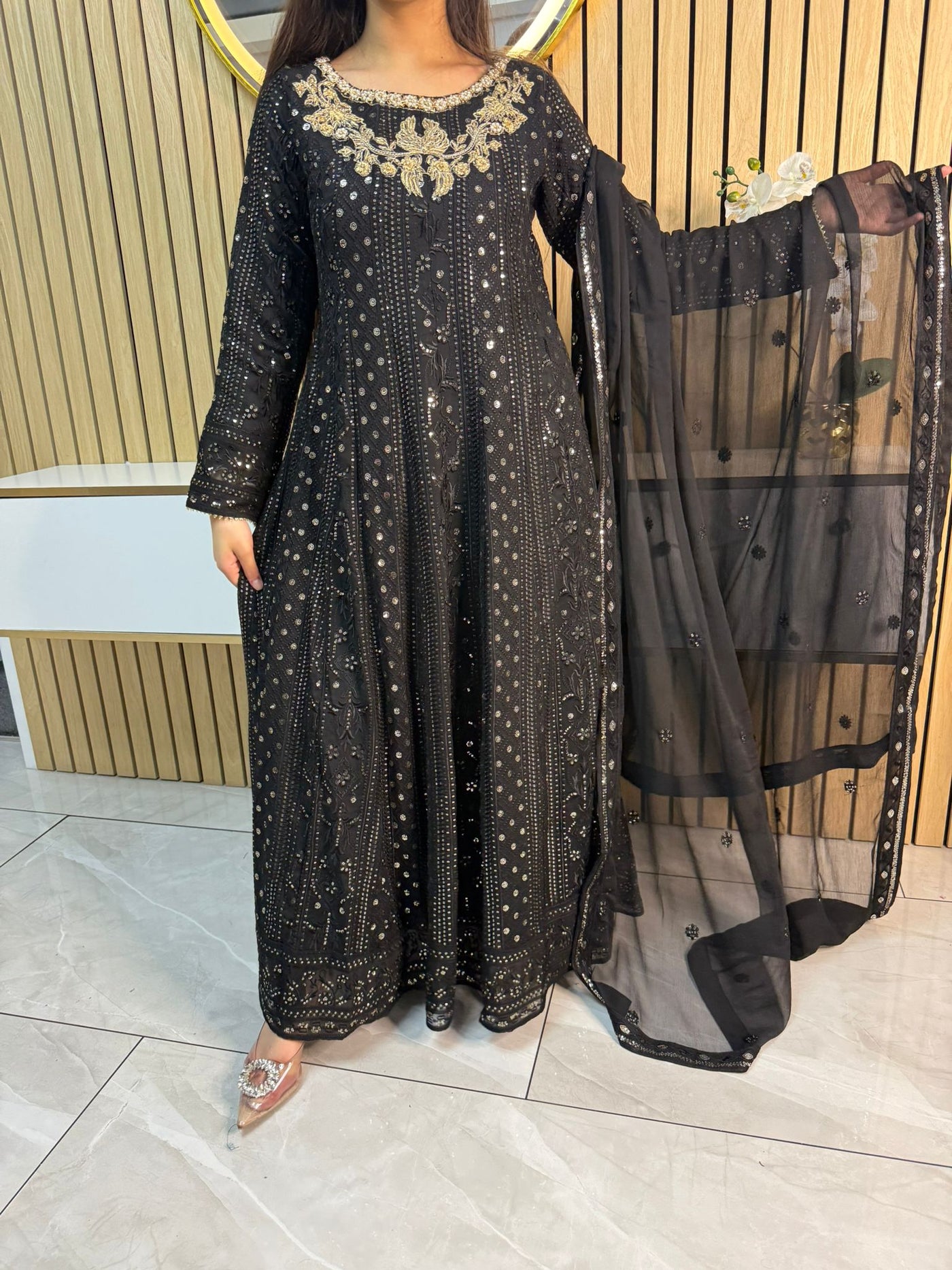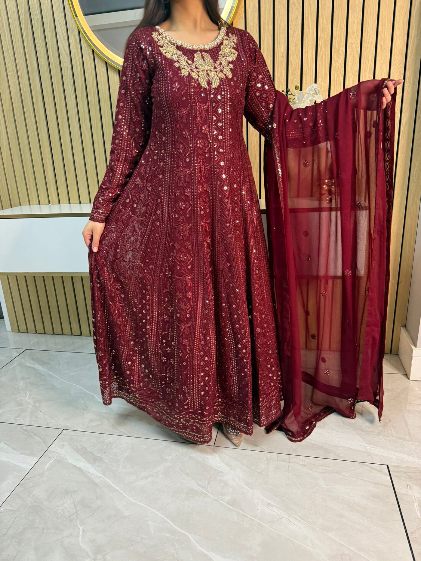 Fancy 3 piece maxi dress in chiffon material, embellished with sequins, gems and thread work . Accompanied with chiffon scarf.