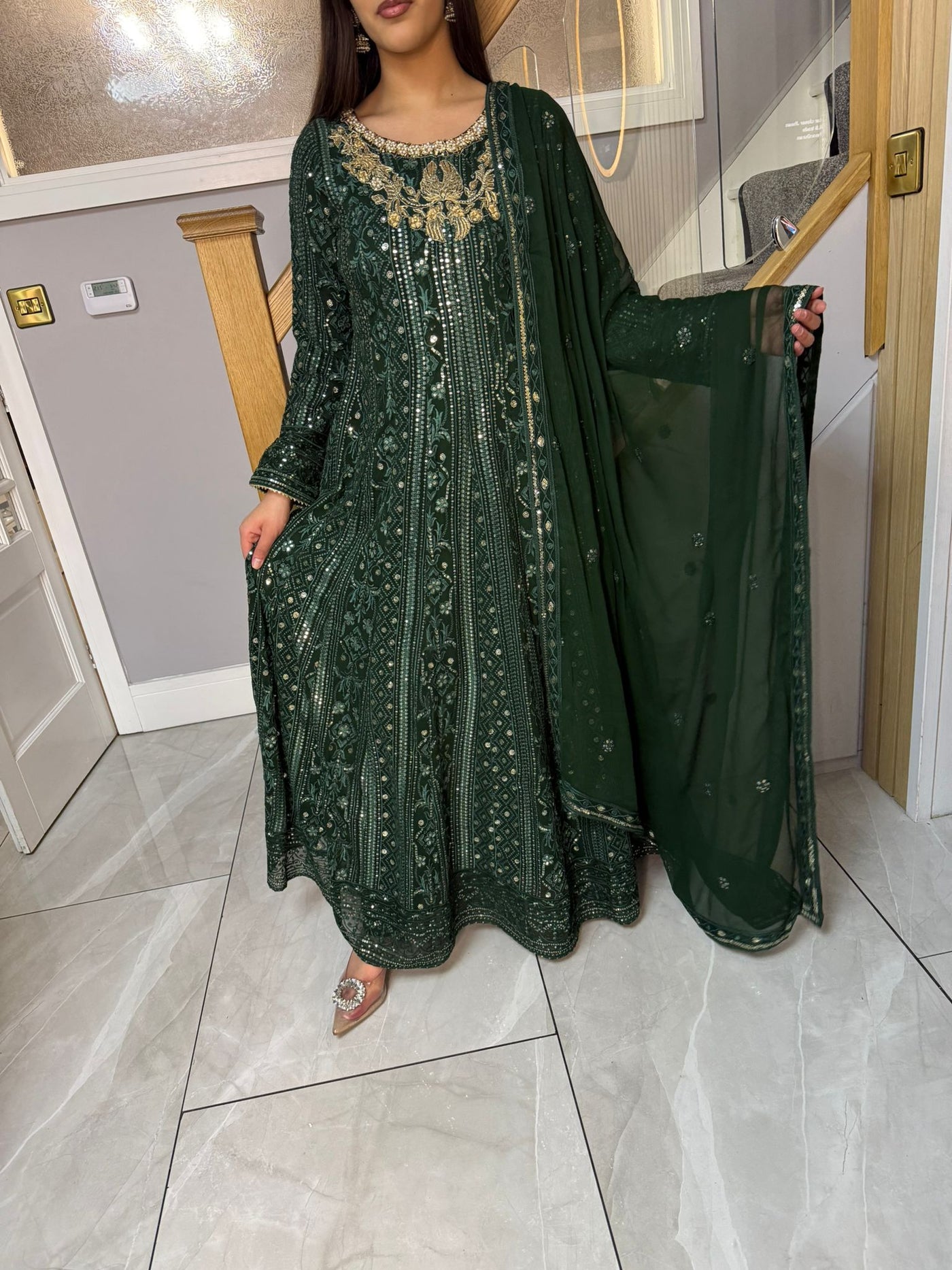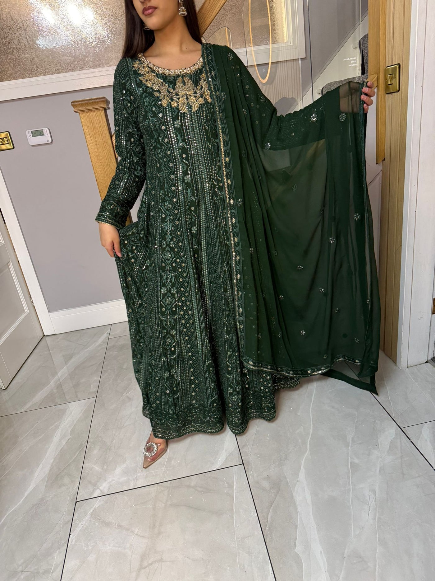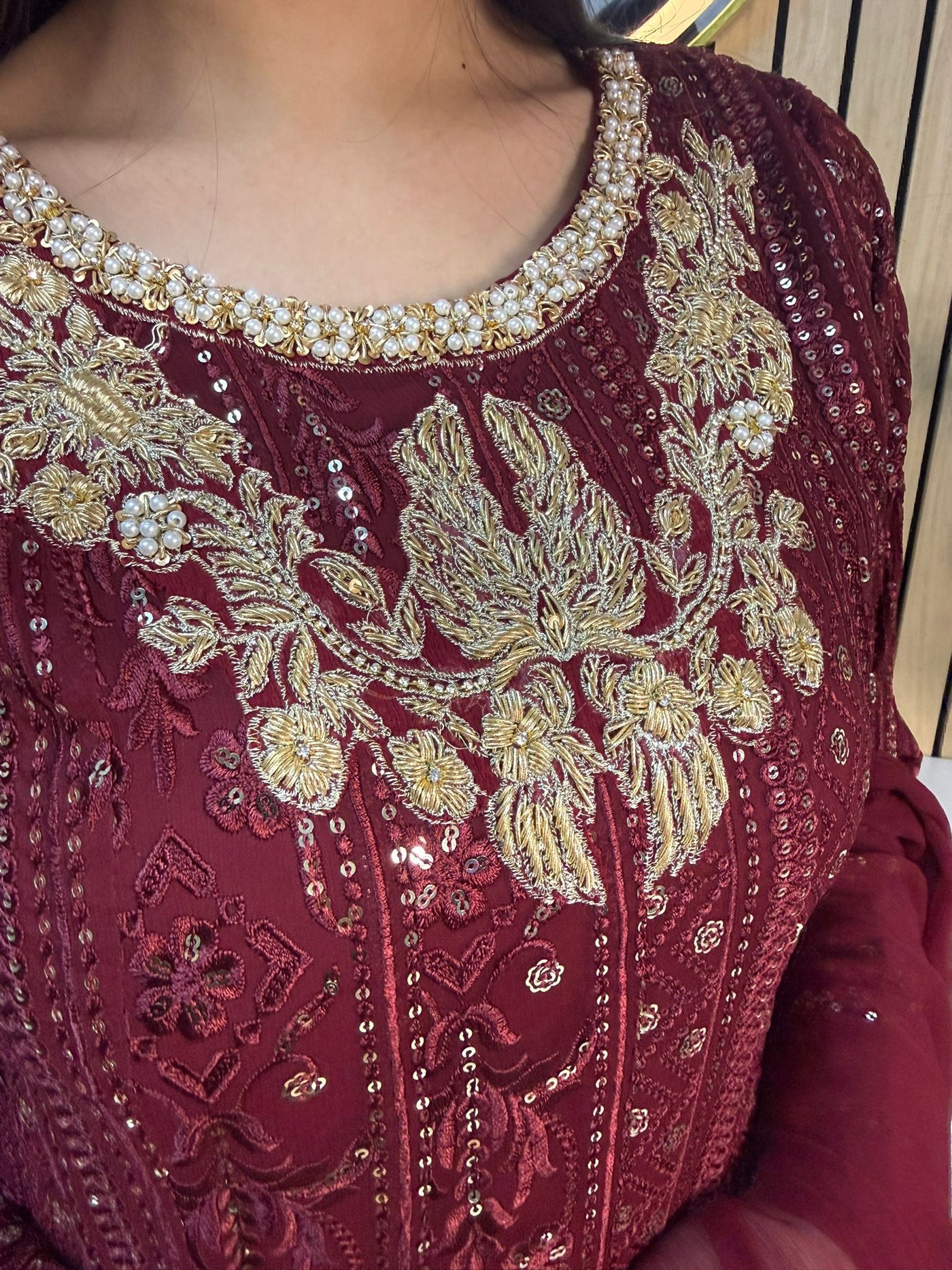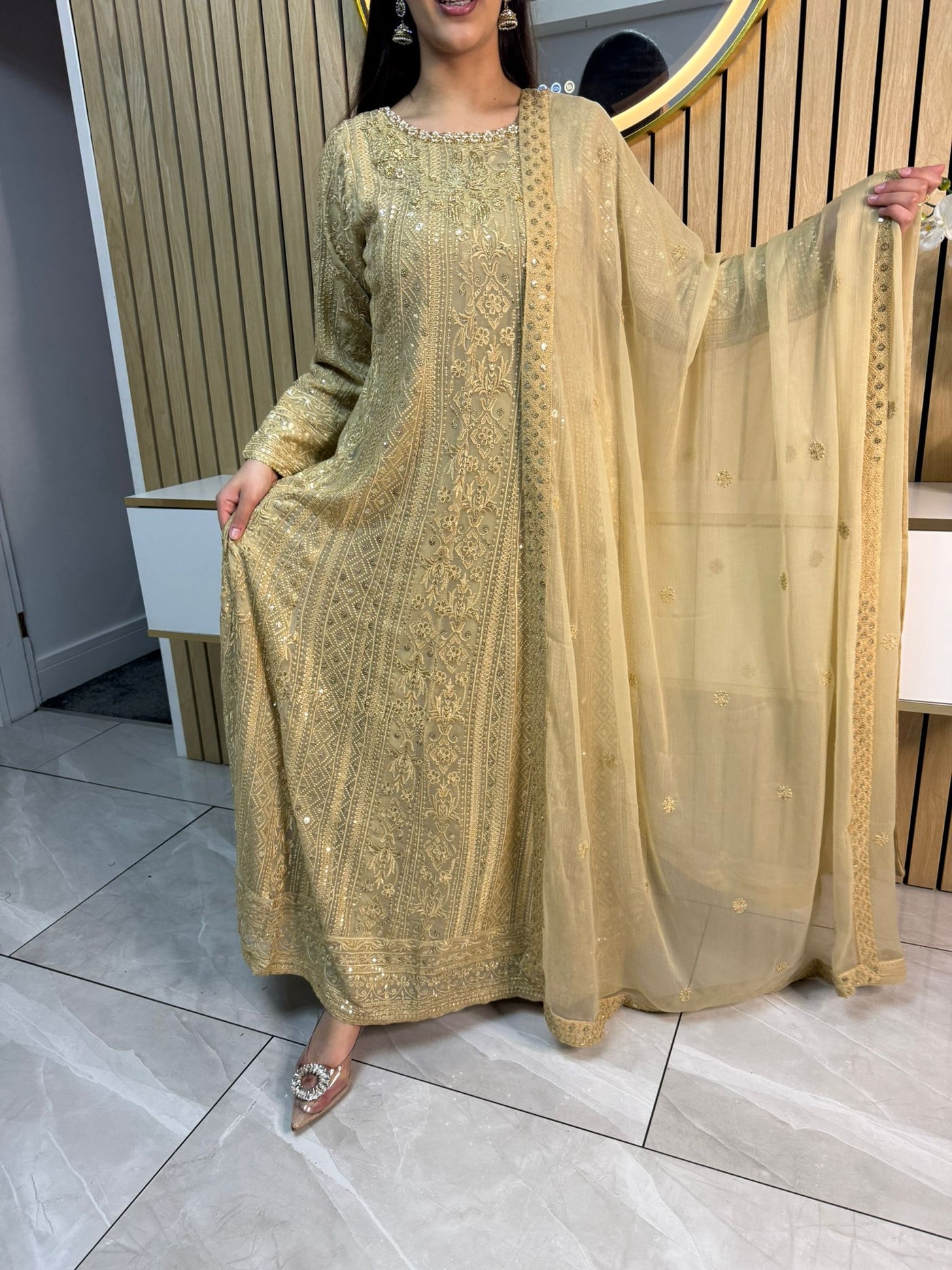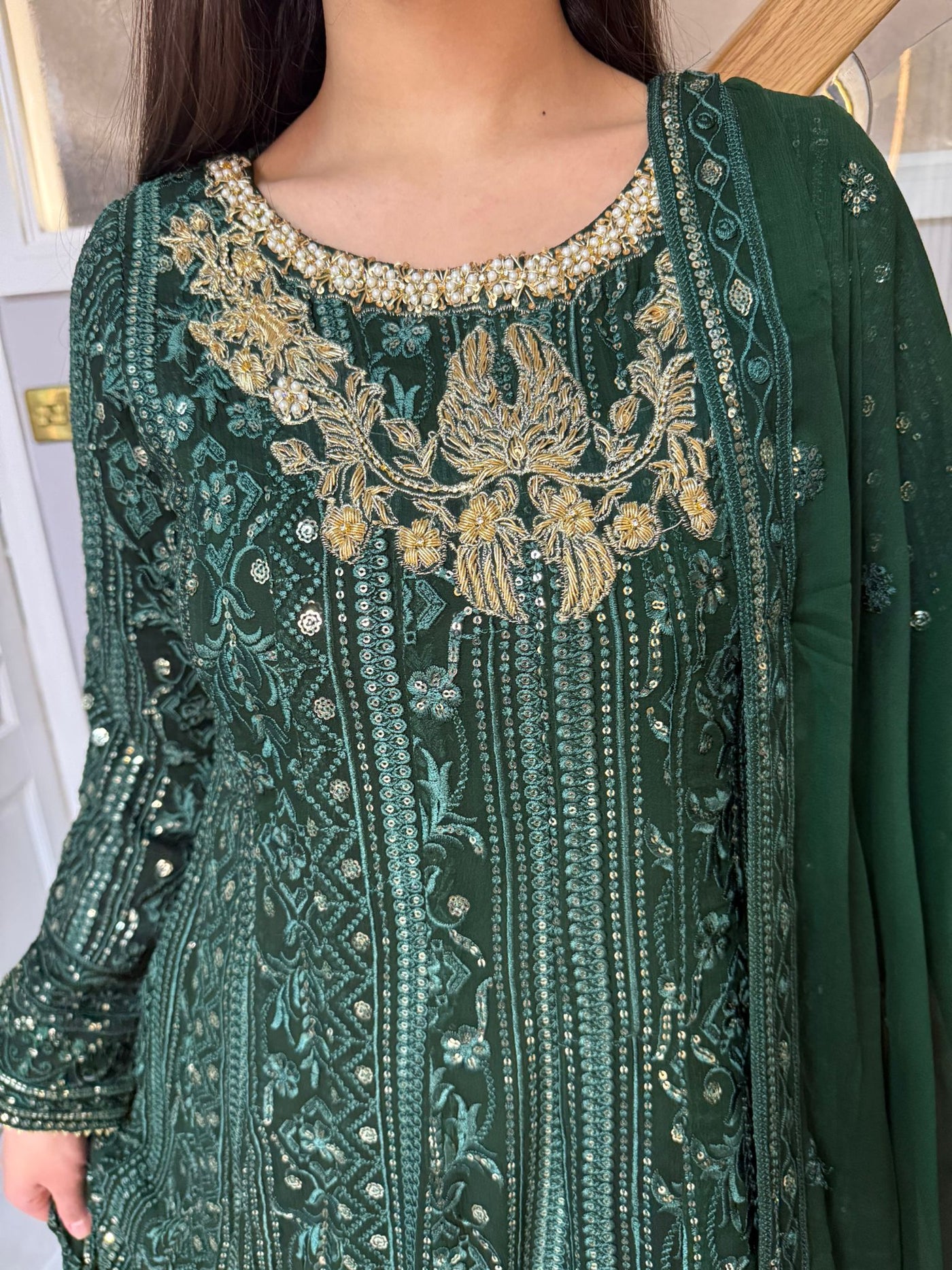 Fancy 3 piece maxi dress in chiffon material, embellished with sequins, gems and thread work . Accompanied with chiffon scarf.