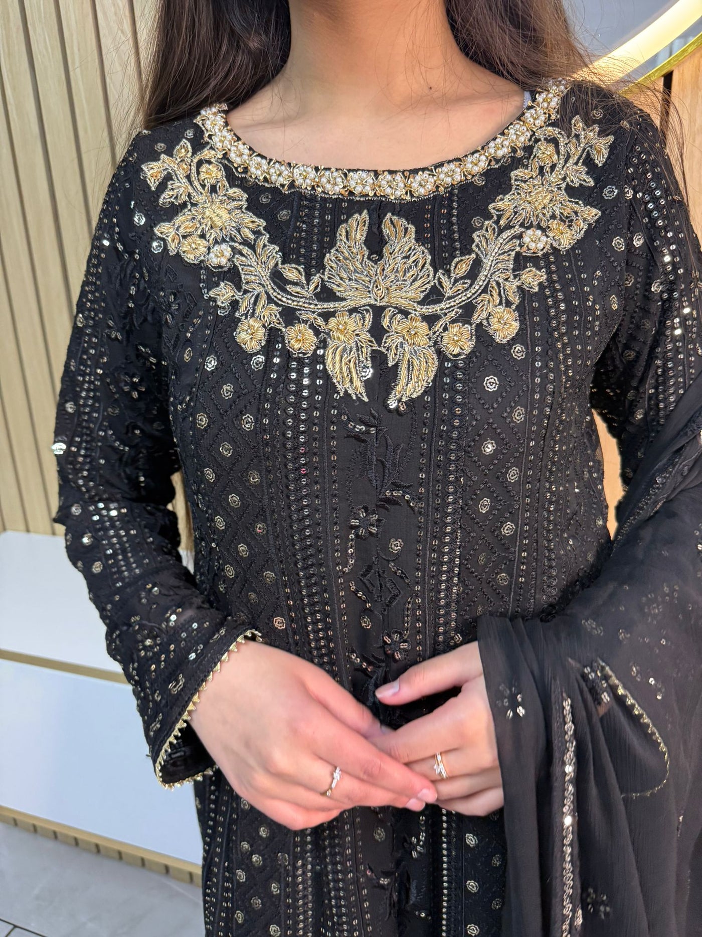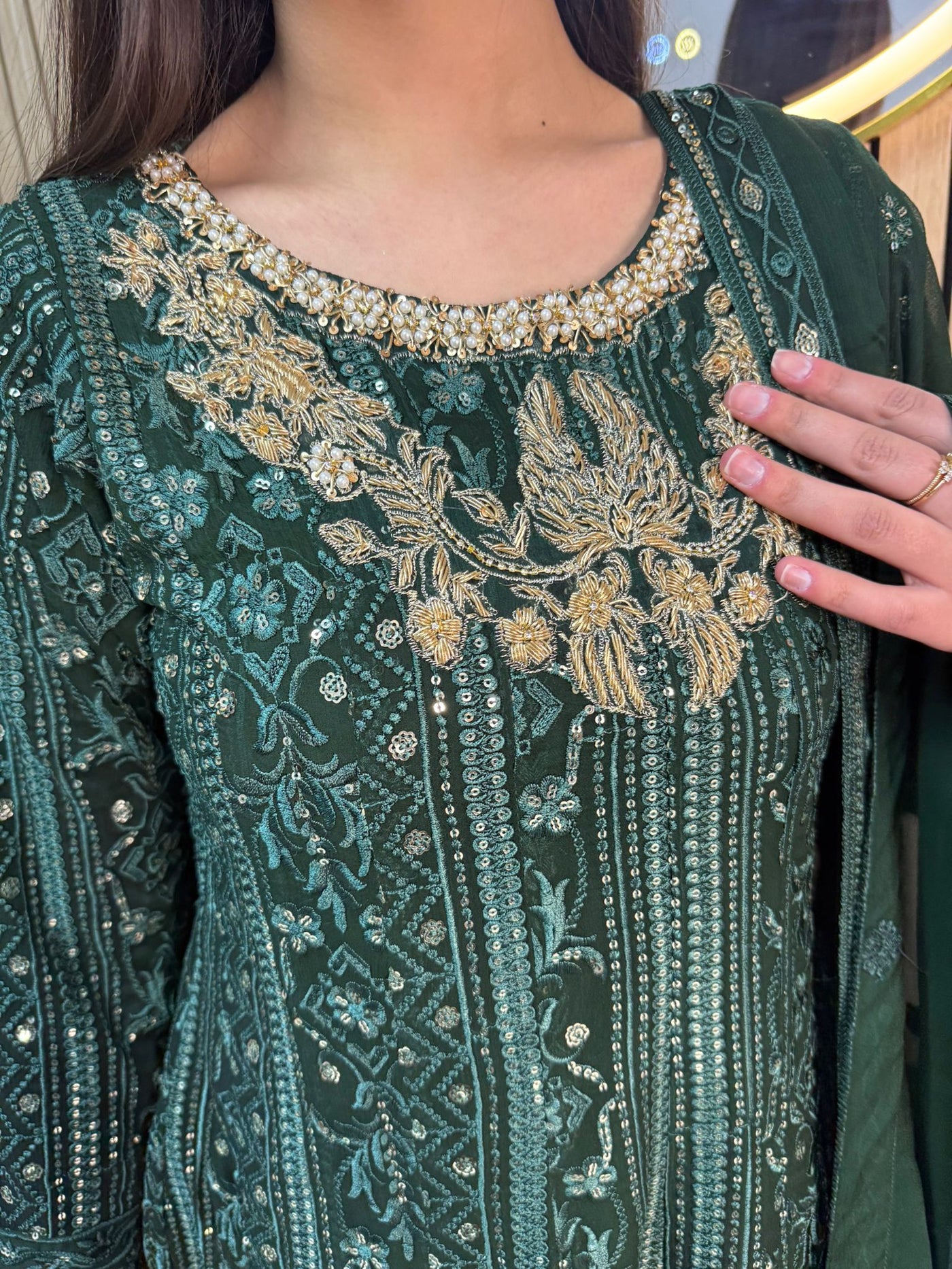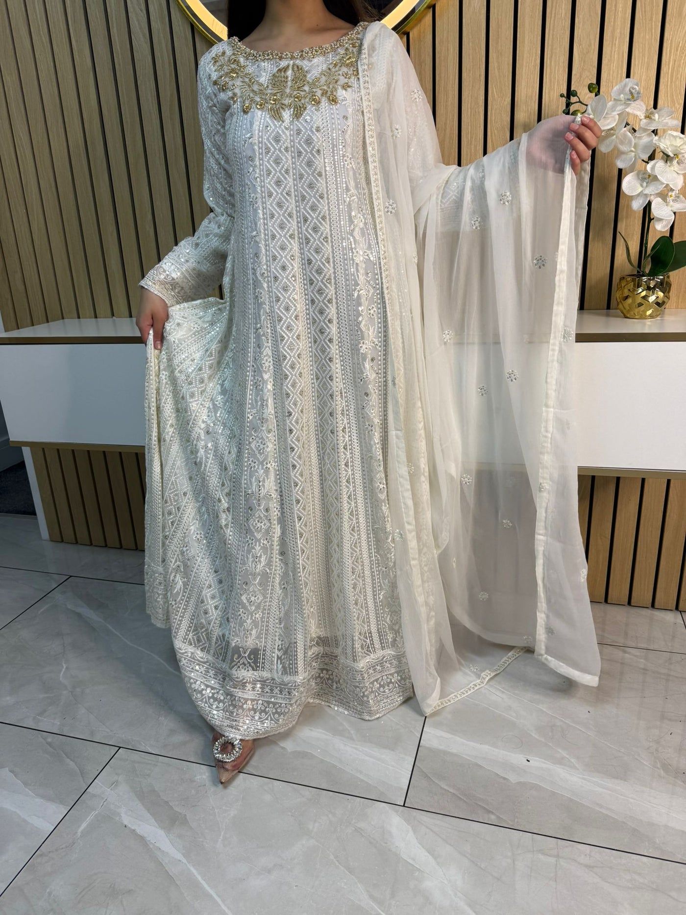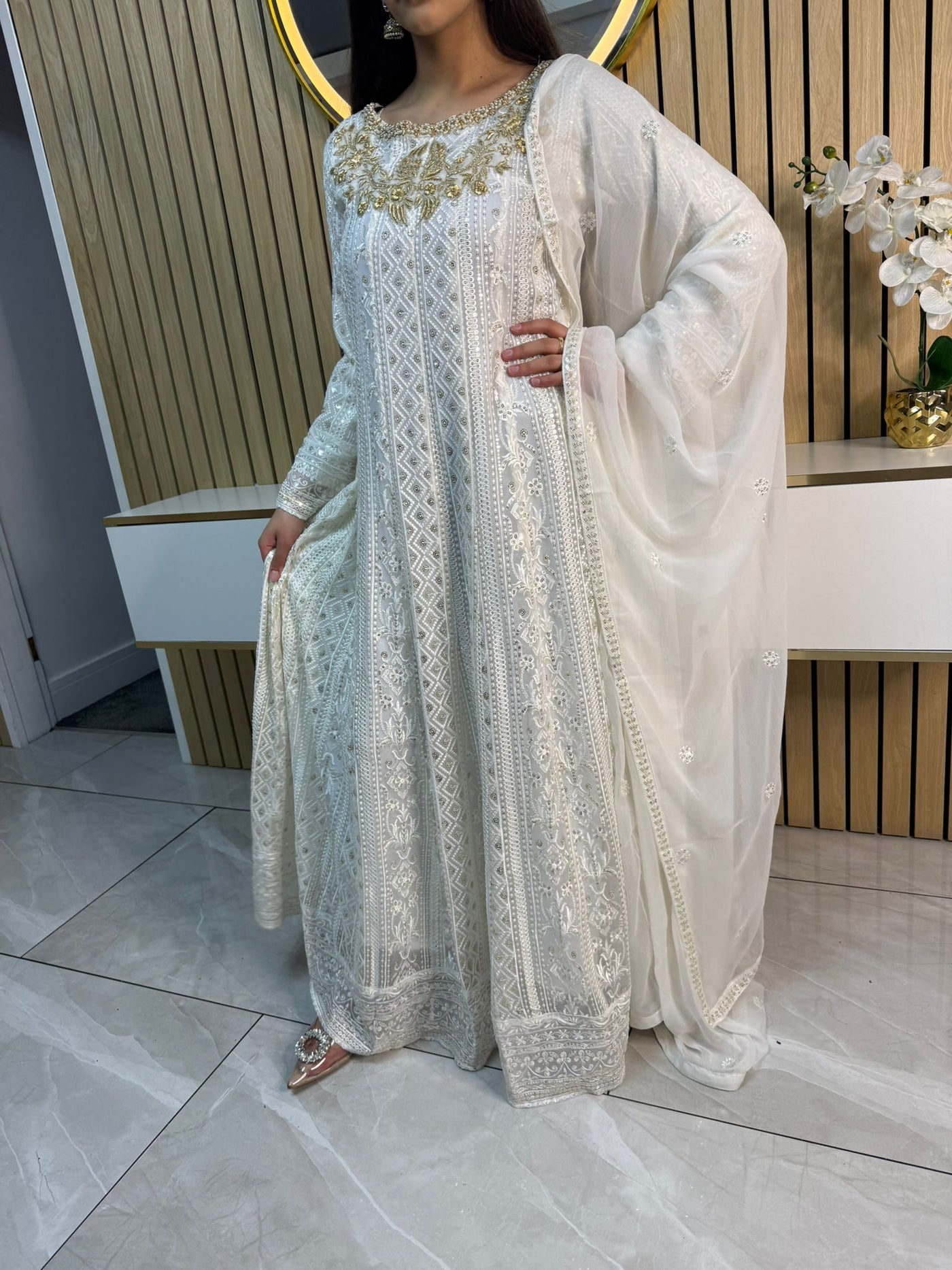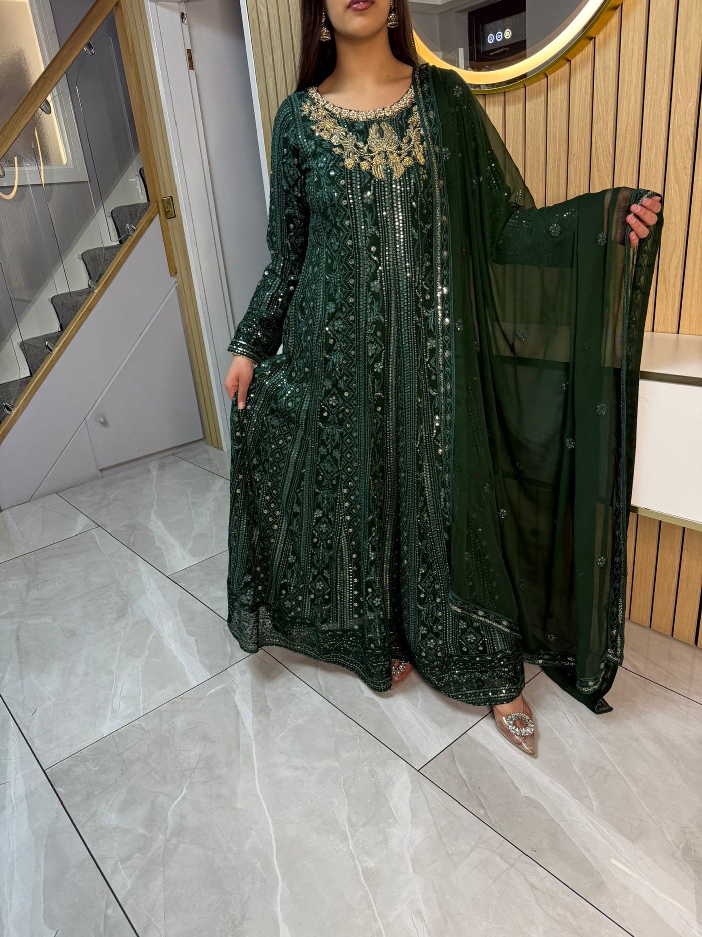 Fancy 3 piece maxi dress in chiffon material, embellished with sequins, gems and thread work . Accompanied with chiffon scarf.