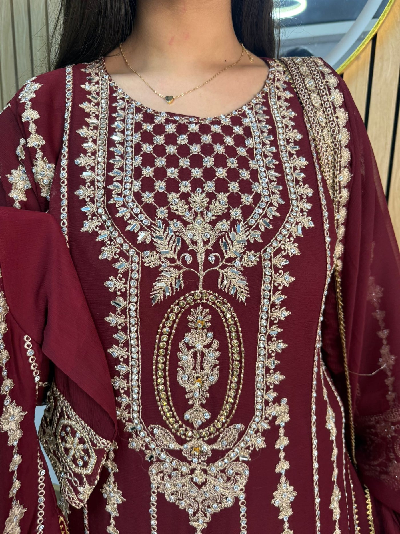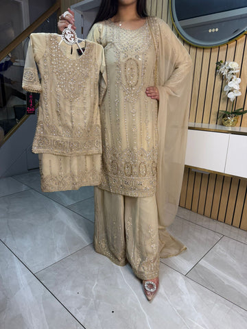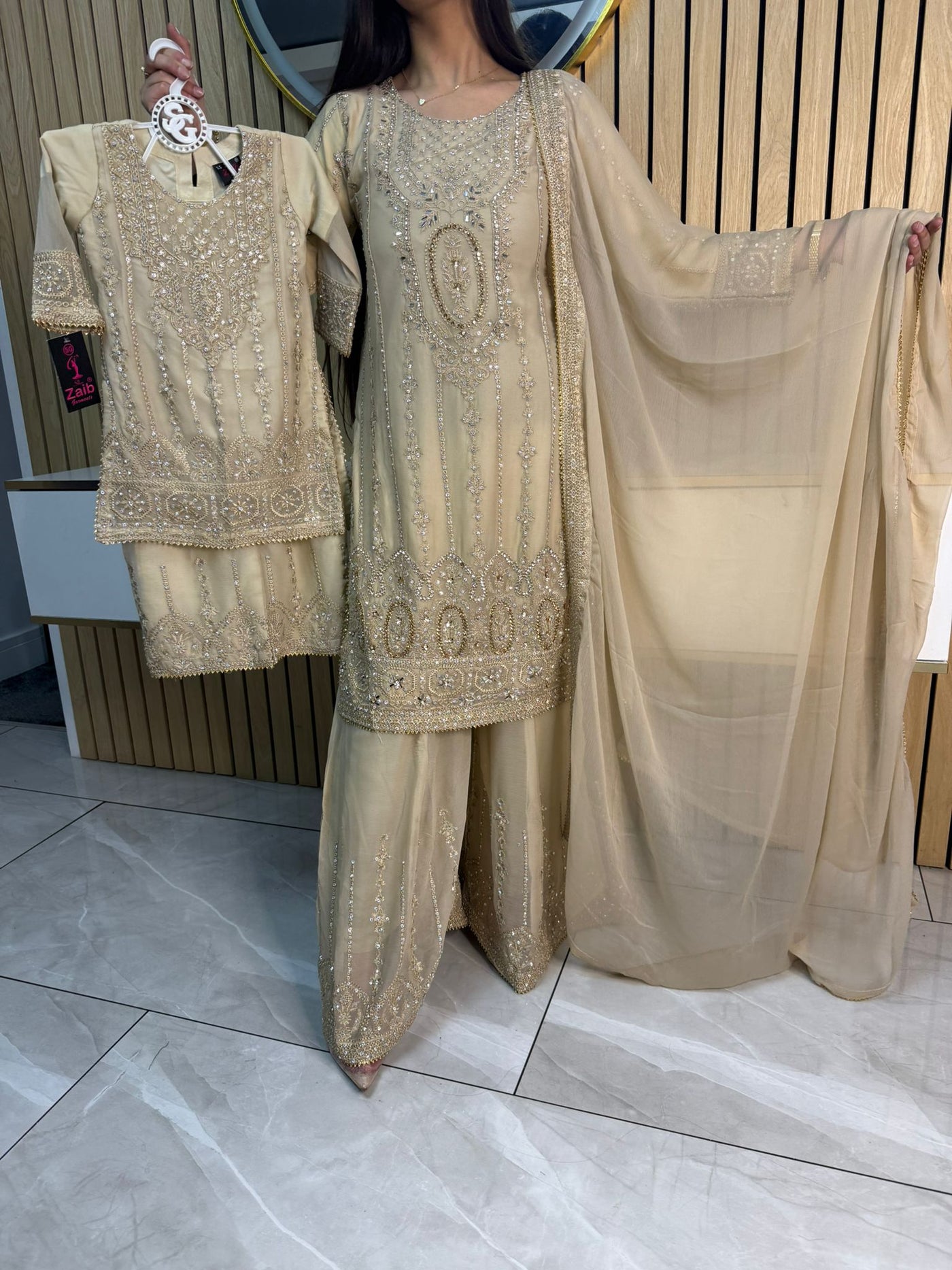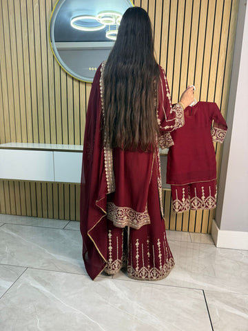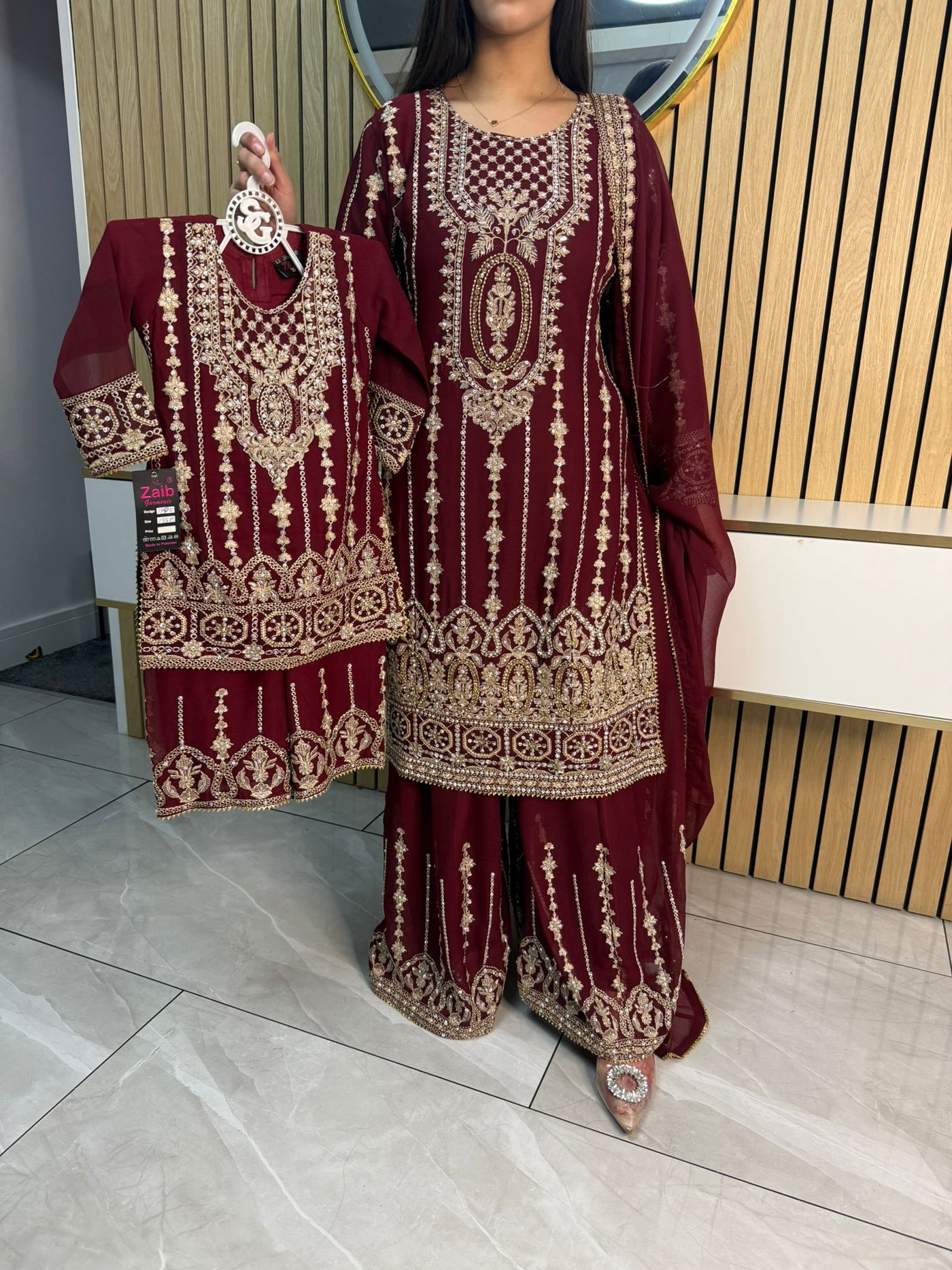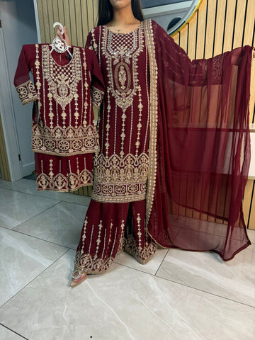Product description:Introducing our exquisite 3-piece matching chiffon suit for mothers and daughters! This stunning ensemble features a beautifully crafted top adorned with intricate details, perfectly complemented by matching palazzo trousers for a chic and comfortable fit. The outfit comes with a contrasting dupatta that adds a touch of elegance and flair, making it ideal for any special occasion or family gathering. Celebrate your bond in style with this fashionable and coordinated look that showcases both sophistication and love. Perfect for creating cherished memories together!