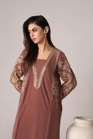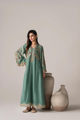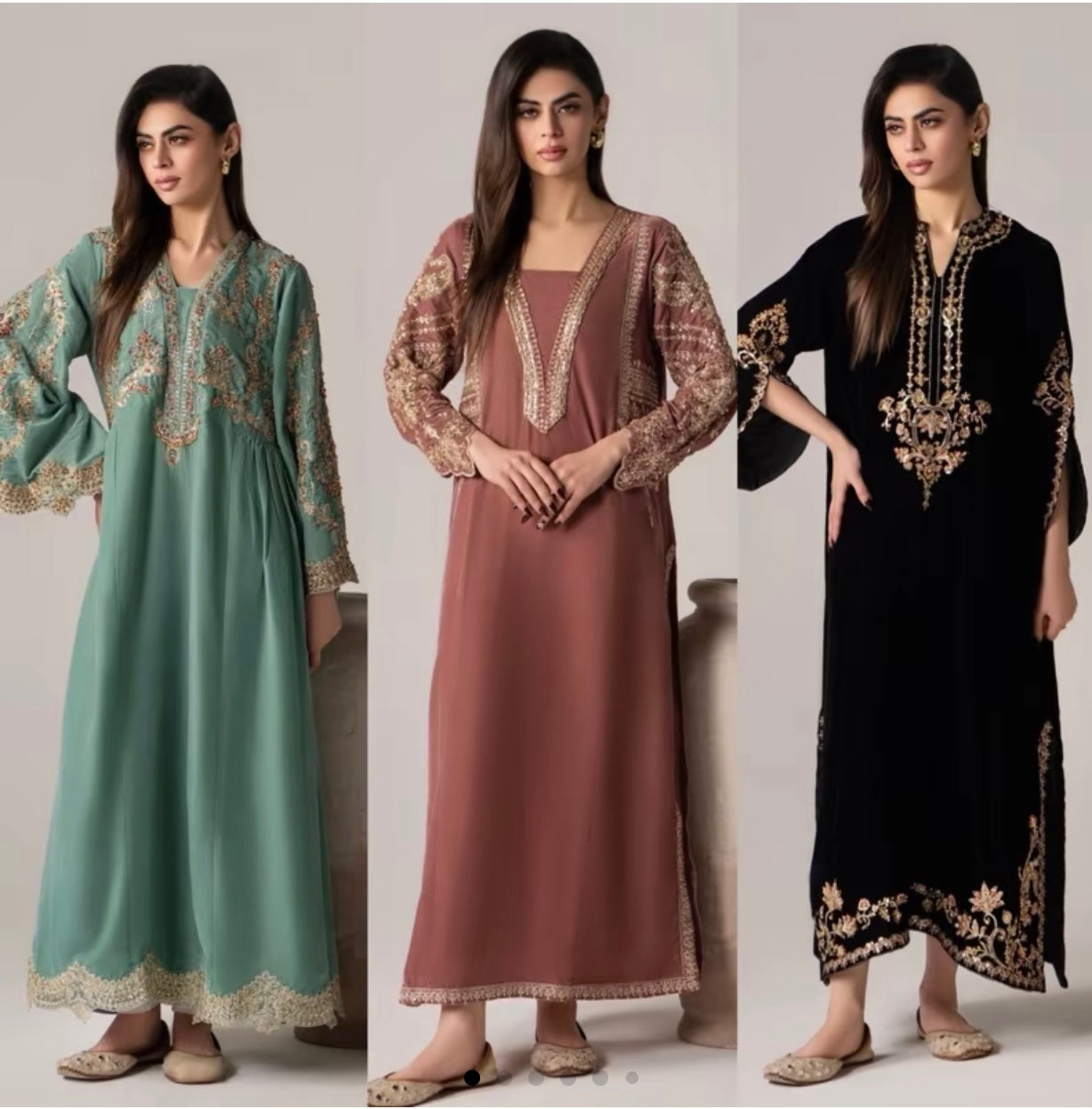 Product Description:This stunning 1 piece heavily embroidered velvet kaftan is a true statement piece. The kaftan features a long length that flows beautifully, making it perfect for both formal and festive occasions. The intricate embroidery adds a touch of glamour and artistry, showcasing exquisite craftsmanship. Paired with straight leg trousers, this ensemble offers a modern twist while ensuring comfort and elegance. Whether you're attending a special event or enjoying a night out, this kaftan set is sure to turn heads and make you feel fabulous.