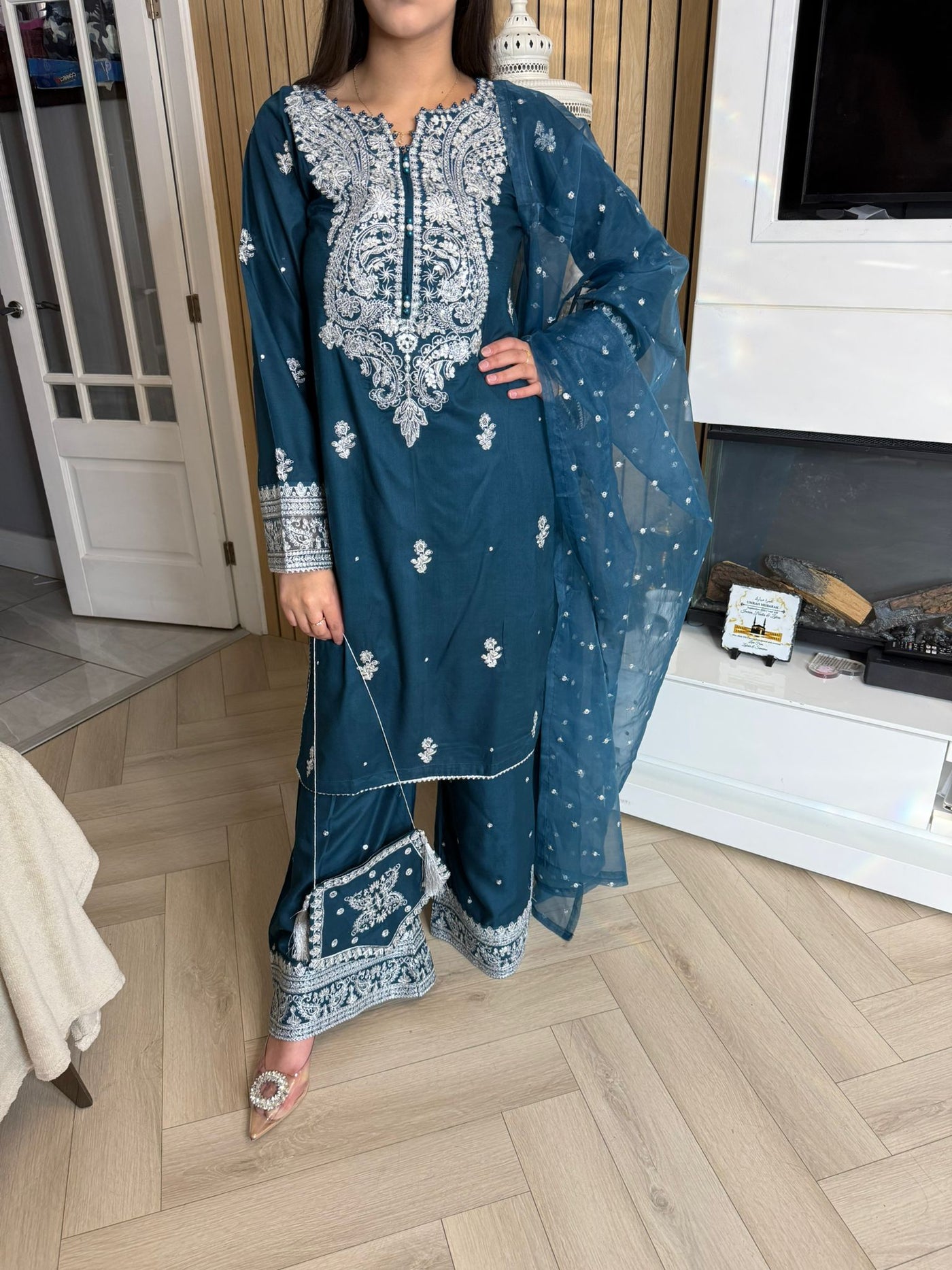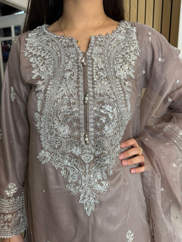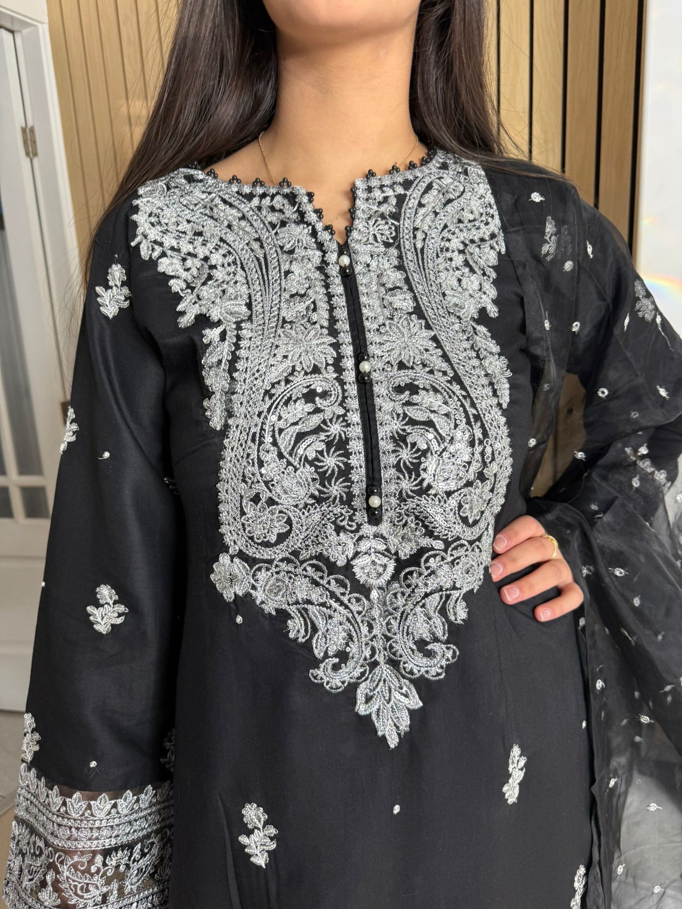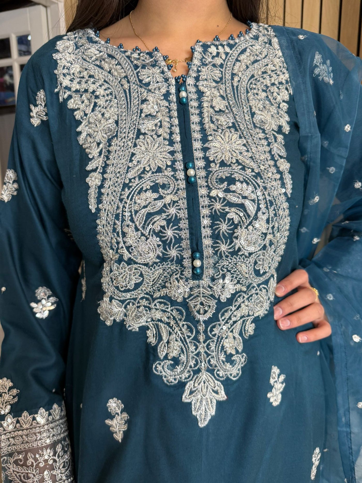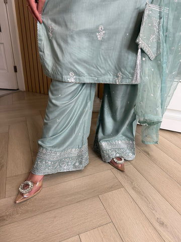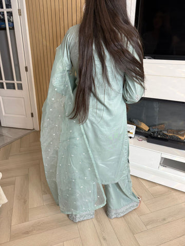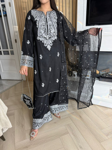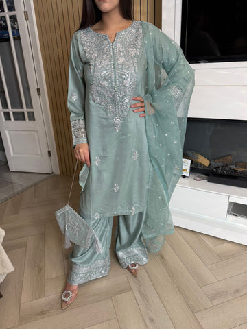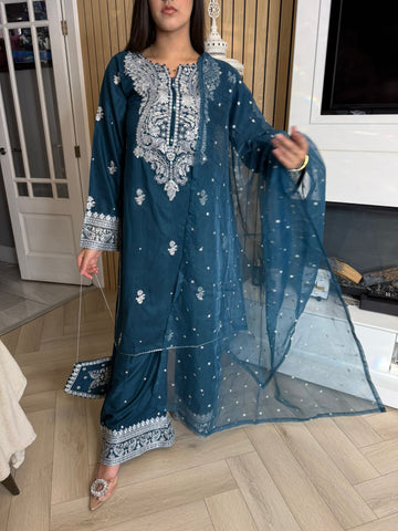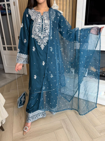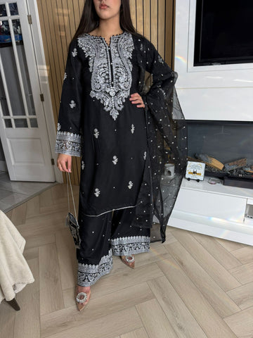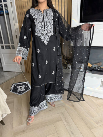 Description:Make a statement this Eid with our luxurious four-piece linen suit. This exquisite ensemble features a beautifully detailed kameez and sleeves, adorned with intricate thread and bead embroidery. Adding to the elegance is delicate tassel detailing along the neckline. The suit includes classic straight-leg trousers and a organza dupatta, completing the look with grace and sophistication. Also included is a matching potli bag, providing a perfect finishing touch. Available in four stunning colours: Blavk, Turqoise, mint and brown. This outfit is designed to make you feel both elegant and confident during your Eid celebrations.