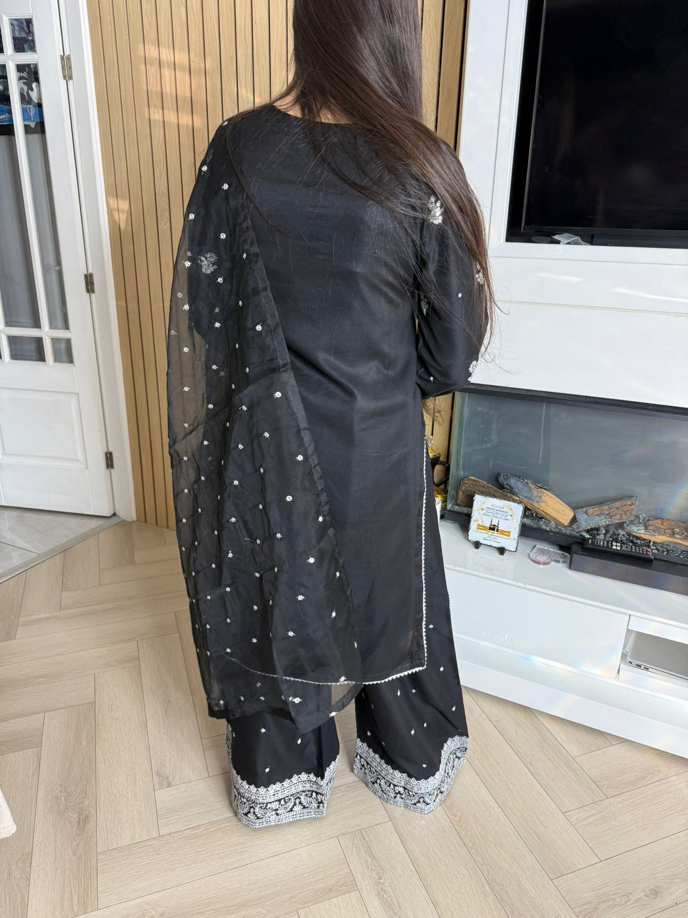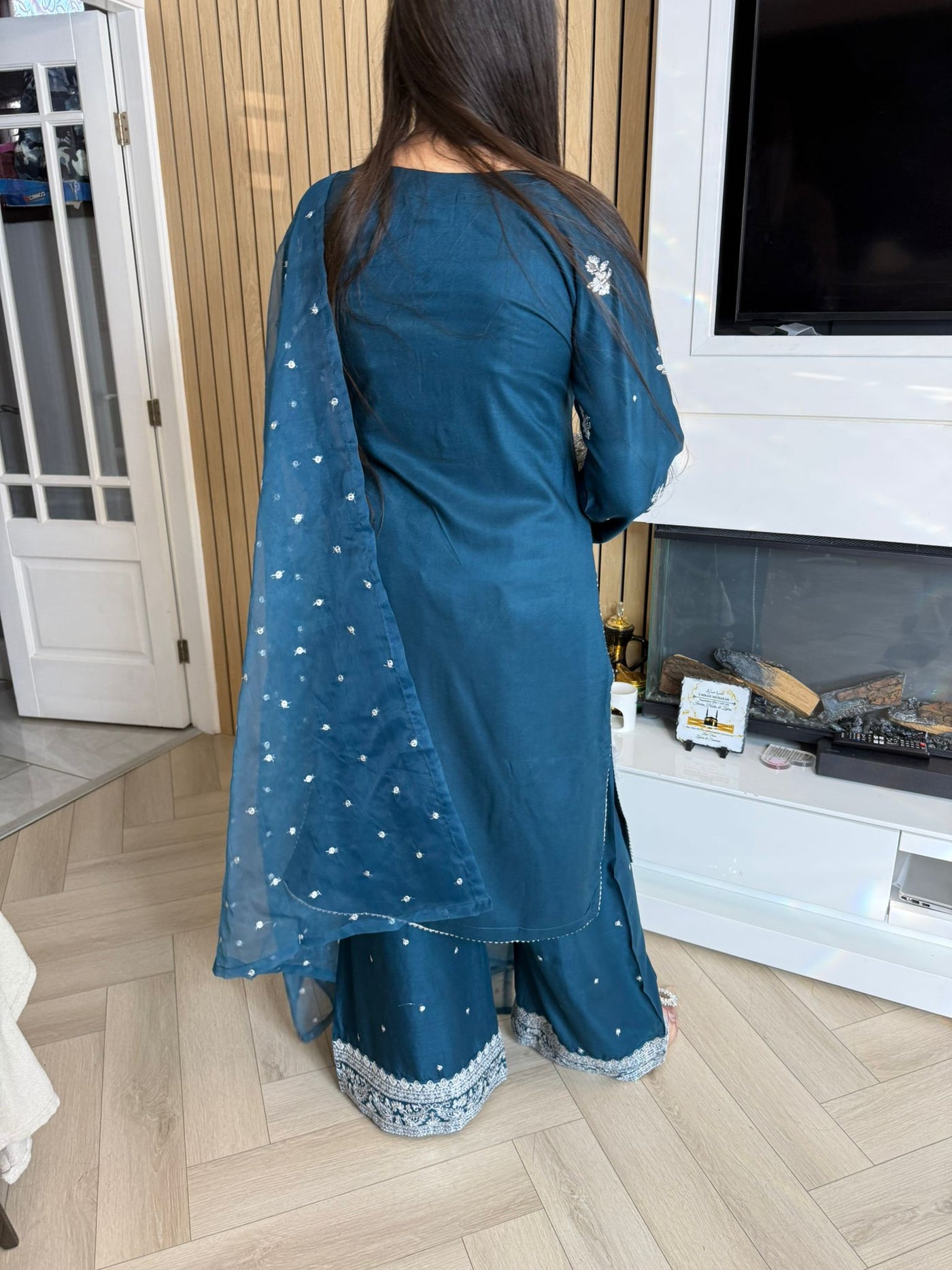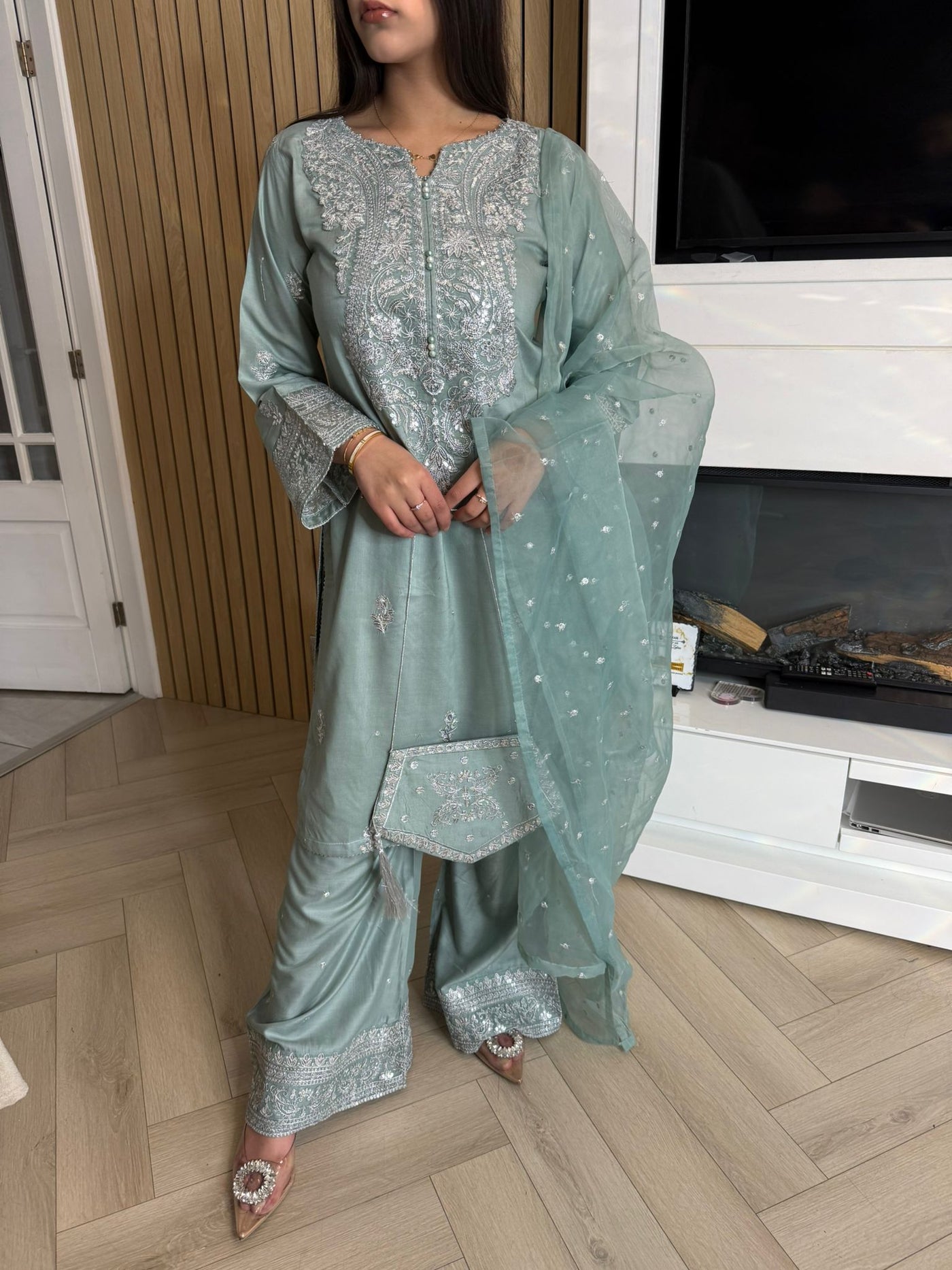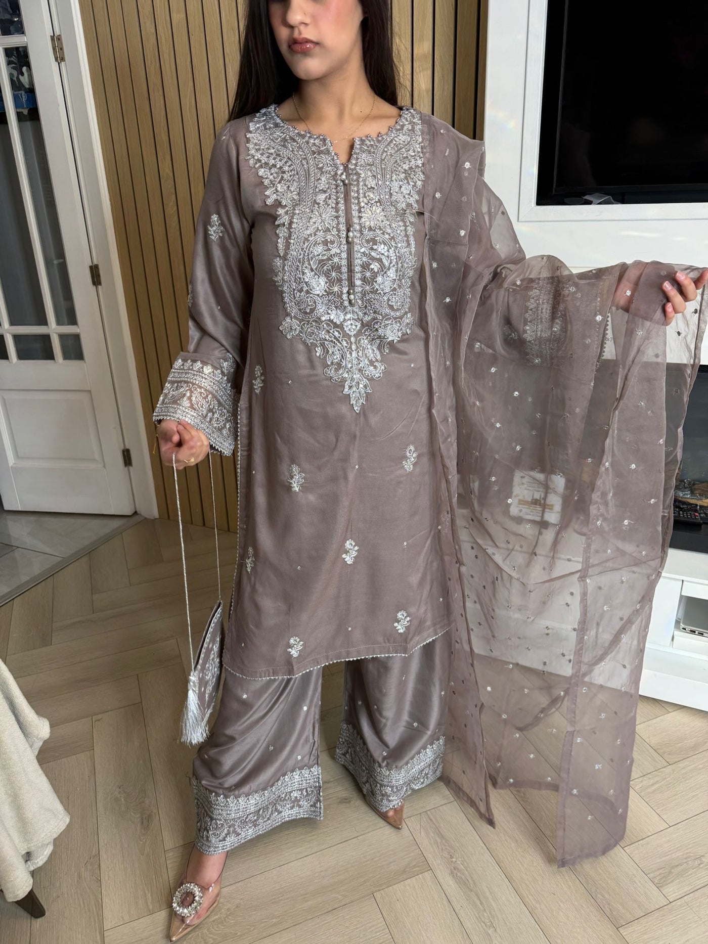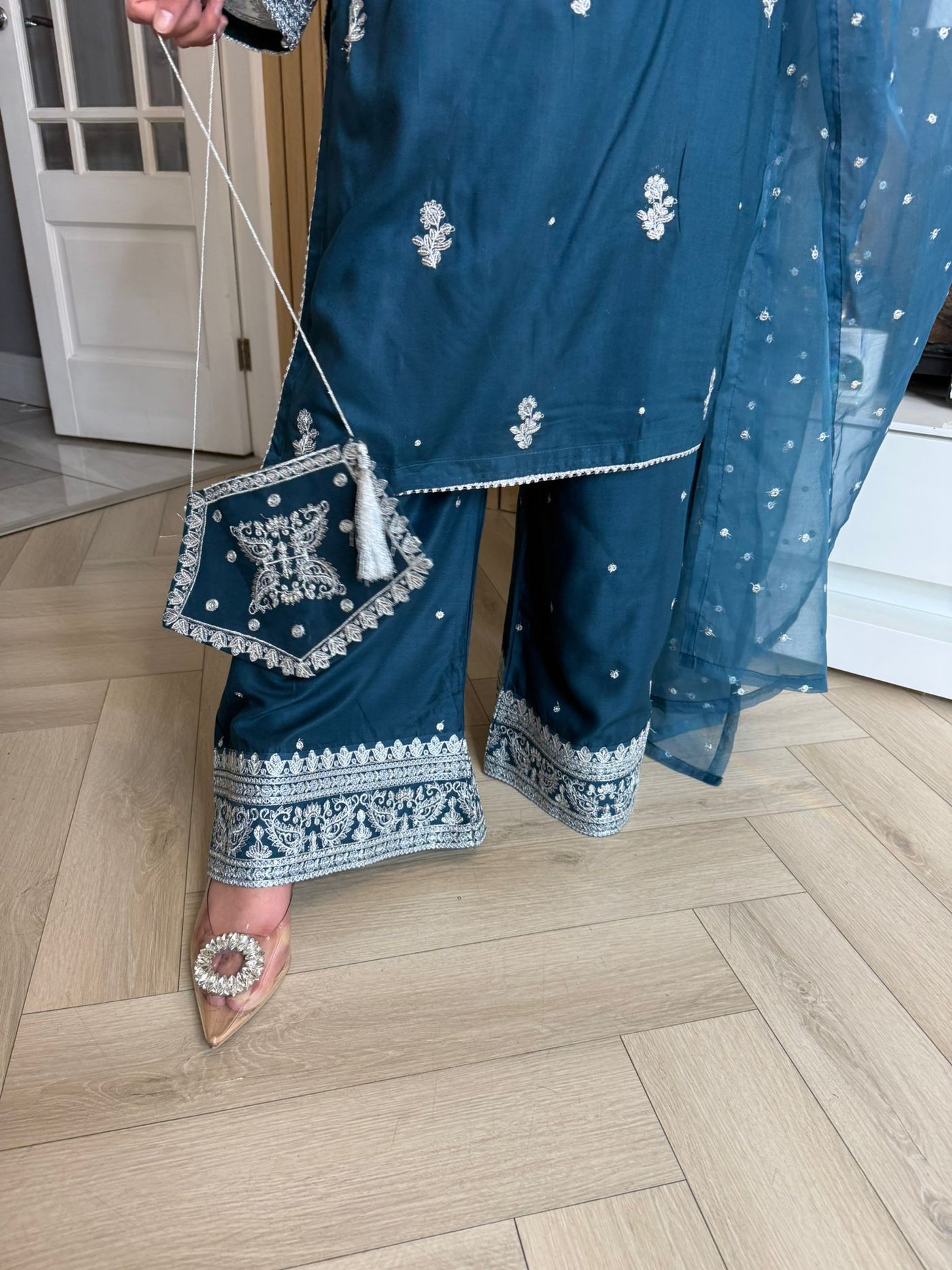 Description:Make a statement this Eid with our luxurious four-piece linen suit. This exquisite ensemble features a beautifully detailed kameez and sleeves, adorned with intricate thread and bead embroidery. Adding to the elegance is delicate tassel detailing along the neckline. The suit includes classic straight-leg trousers and a organza dupatta, completing the look with grace and sophistication. Also included is a matching potli bag, providing a perfect finishing touch. Available in four stunning colours: Blavk, Turqoise, mint and brown. This outfit is designed to make you feel both elegant and confident during your Eid celebrations.