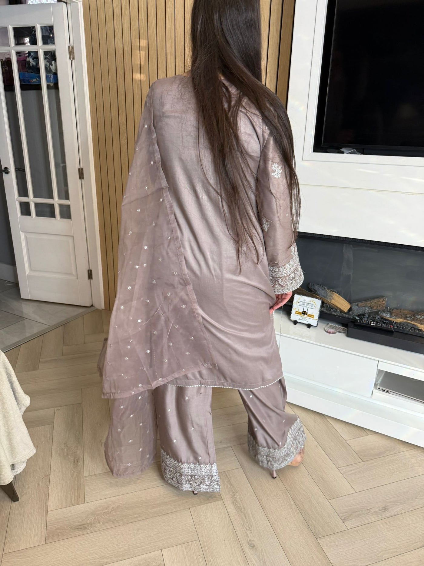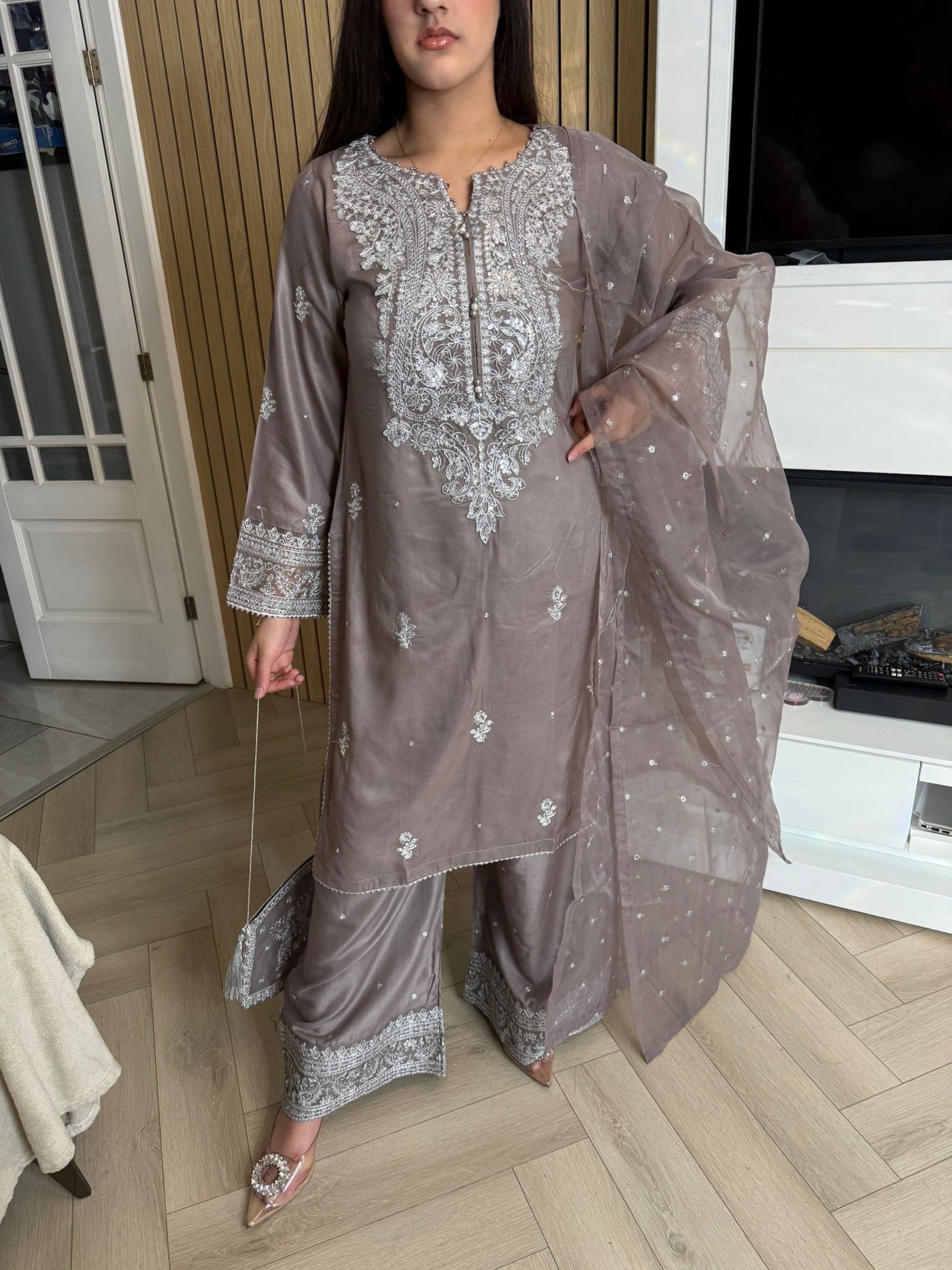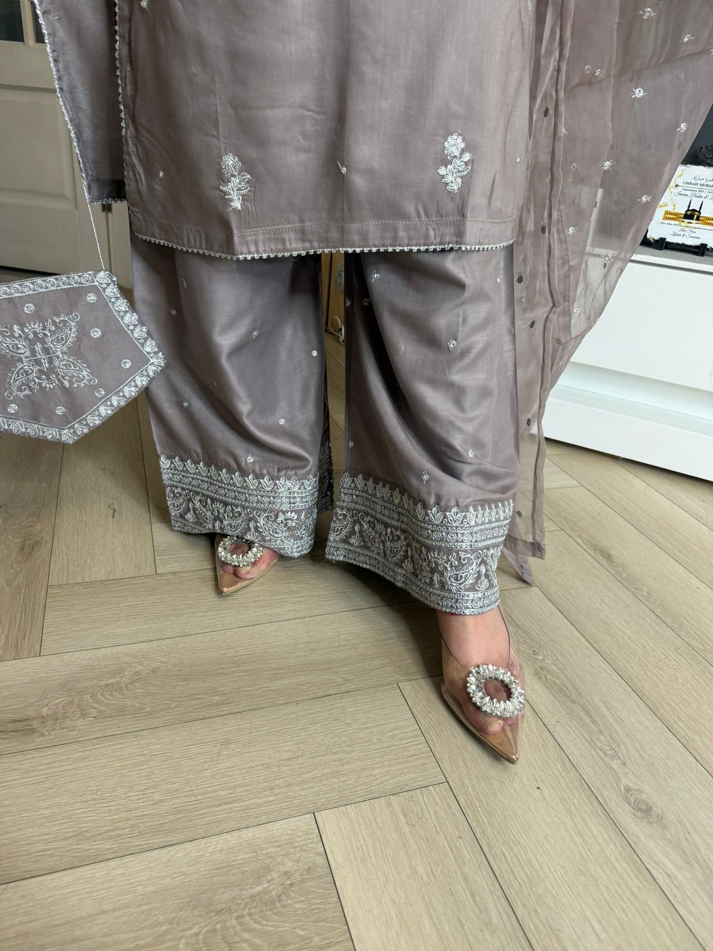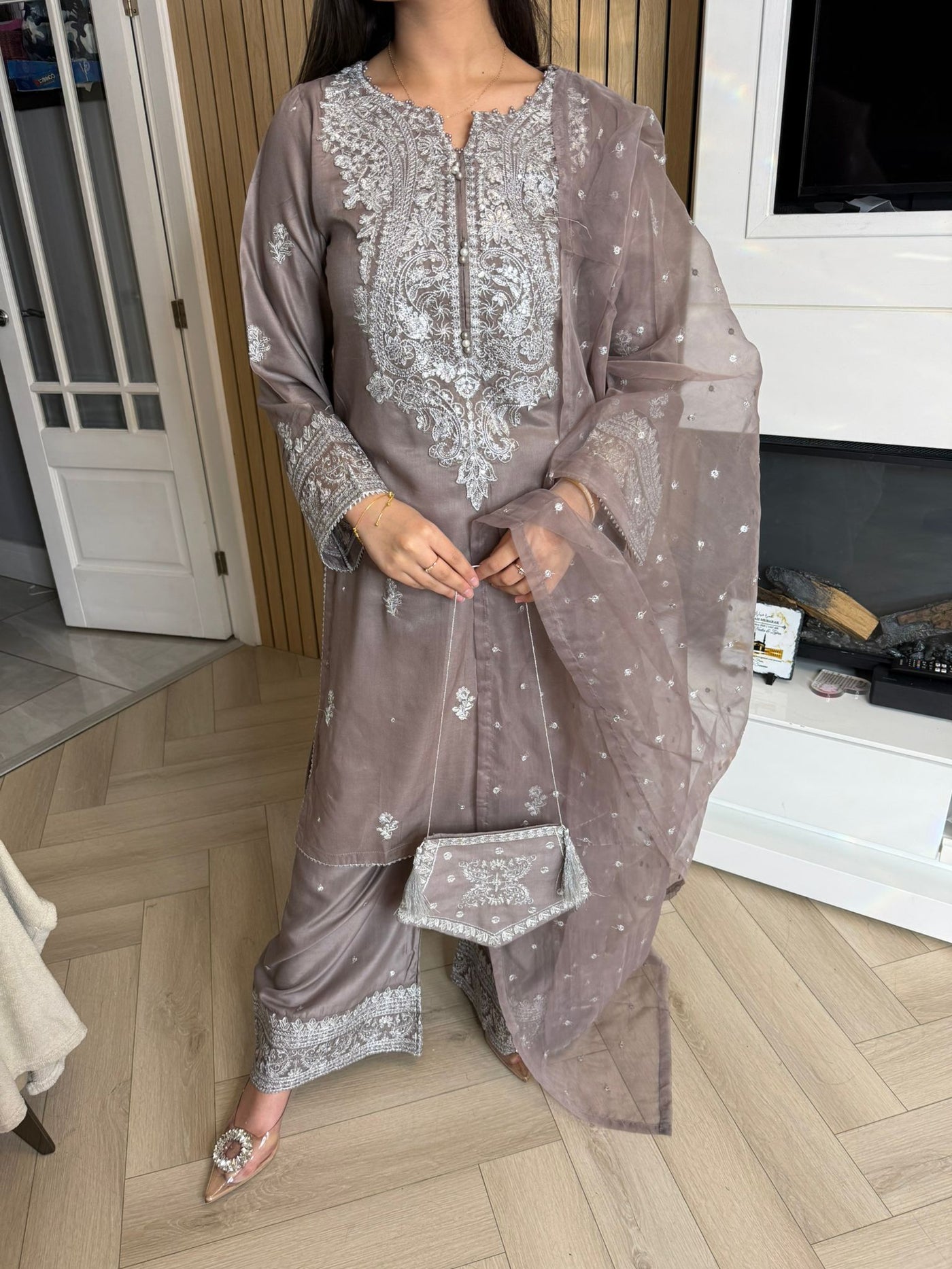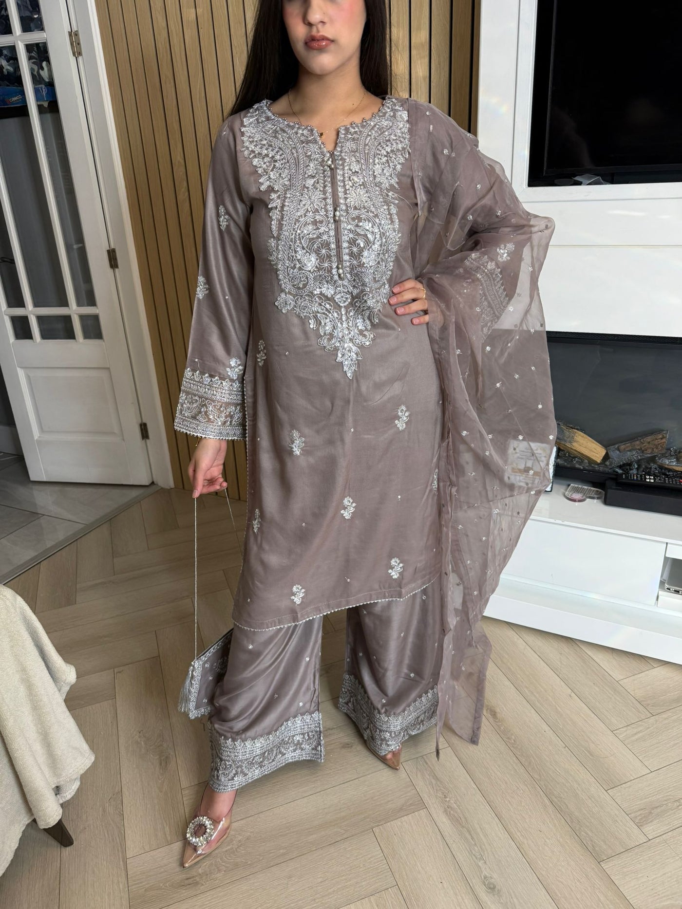 Description:Make a statement this Eid with our luxurious four-piece linen suit. This exquisite ensemble features a beautifully detailed kameez and sleeves, adorned with intricate thread and bead embroidery. Adding to the elegance is delicate tassel detailing along the neckline. The suit includes classic straight-leg trousers and a organza dupatta, completing the look with grace and sophistication. Also included is a matching potli bag, providing a perfect finishing touch. Available in four stunning colours: Blavk, Turqoise, mint and brown. This outfit is designed to make you feel both elegant and confident during your Eid celebrations.