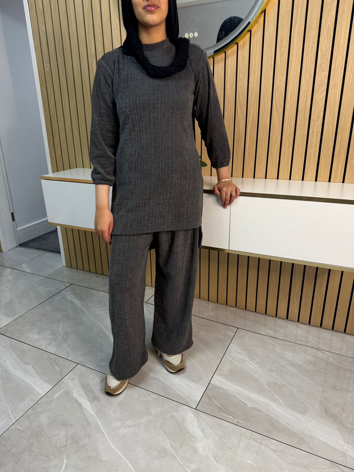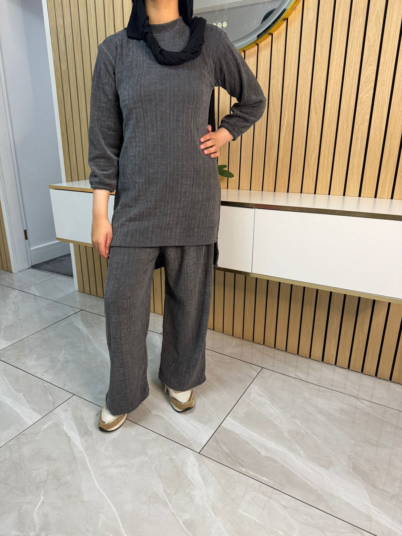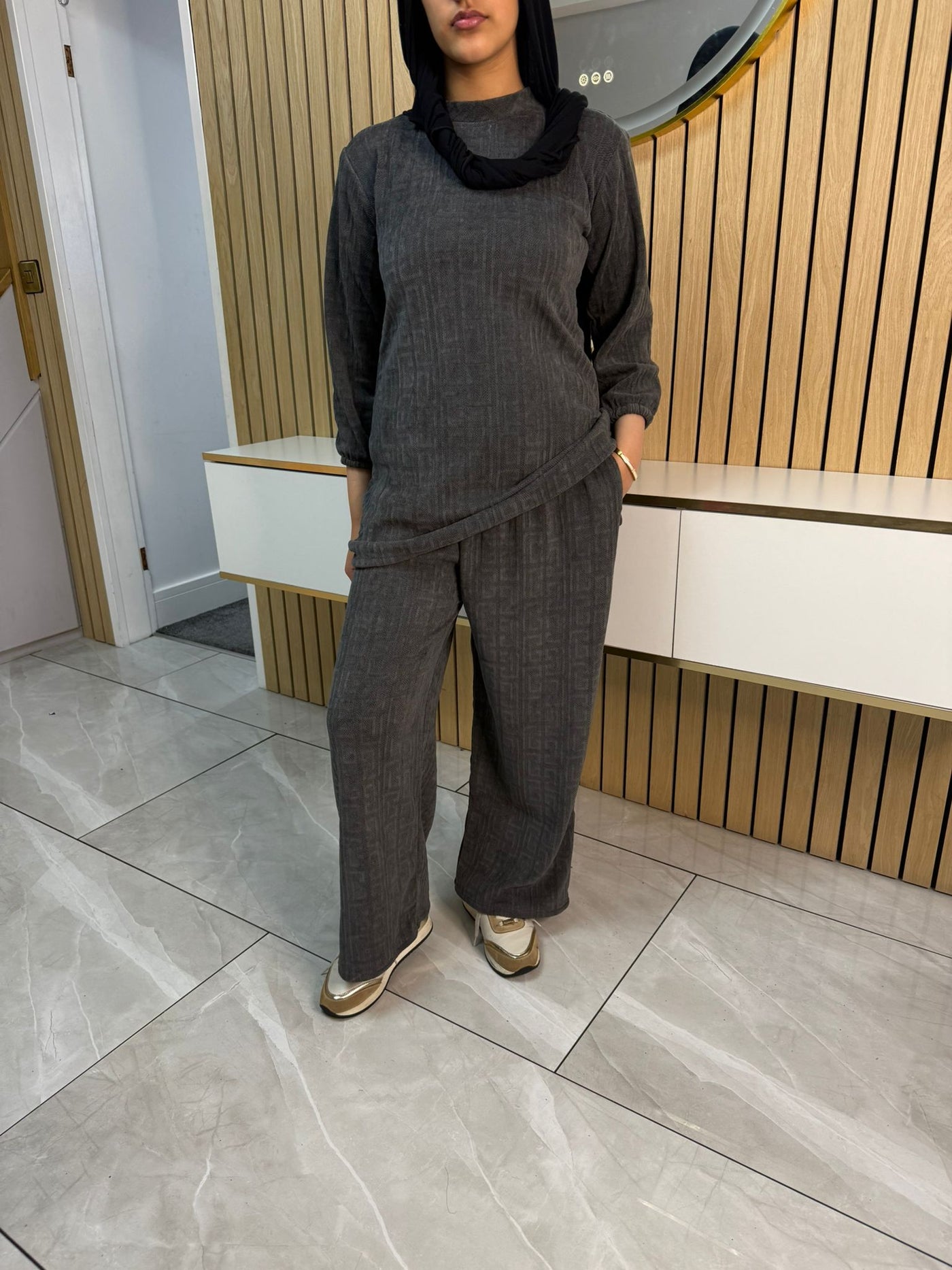Round Neck 2Pc Women Co-ord set With Pocket Palazo Trousers - Grey / Small