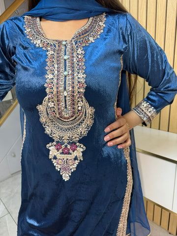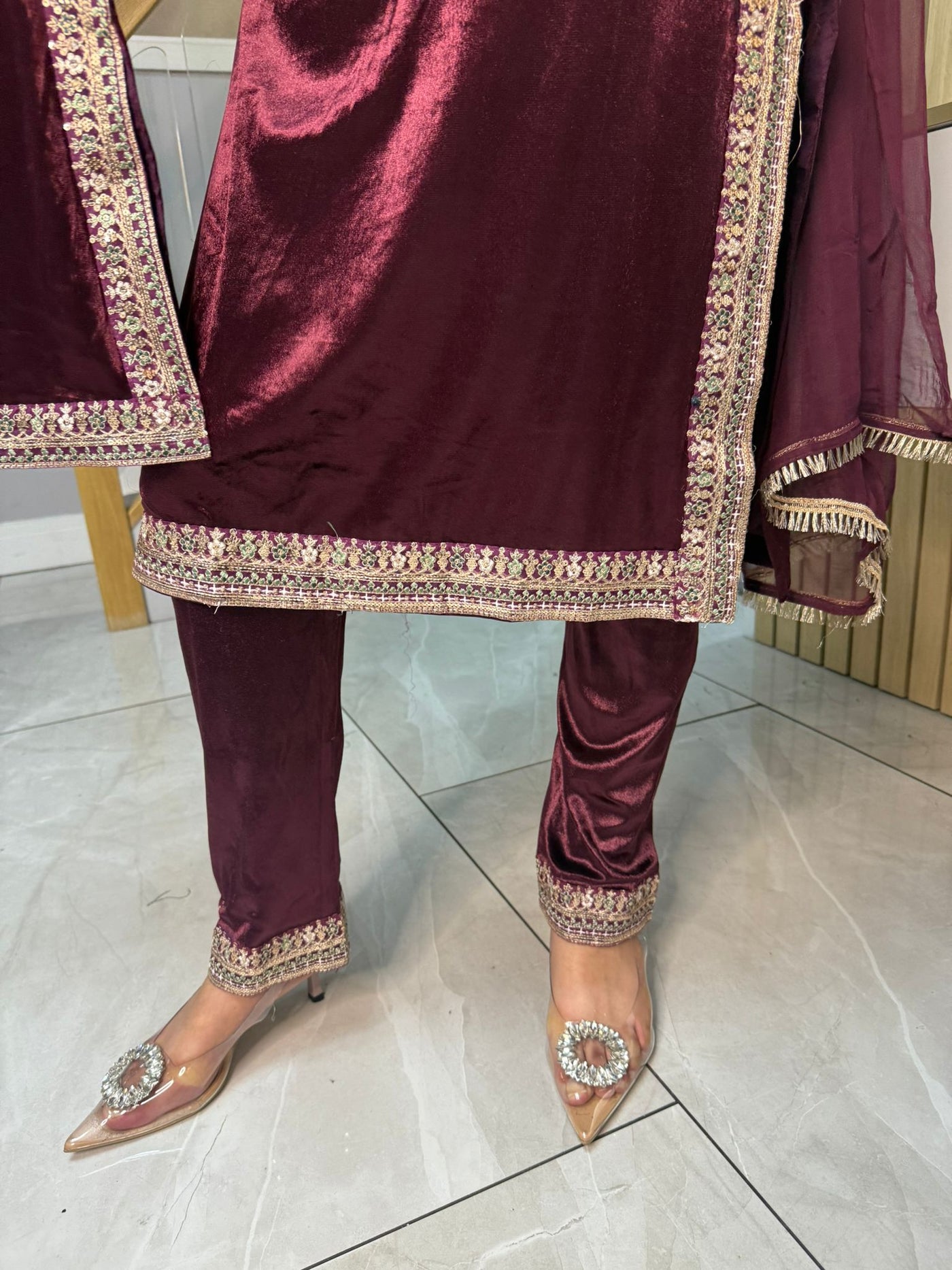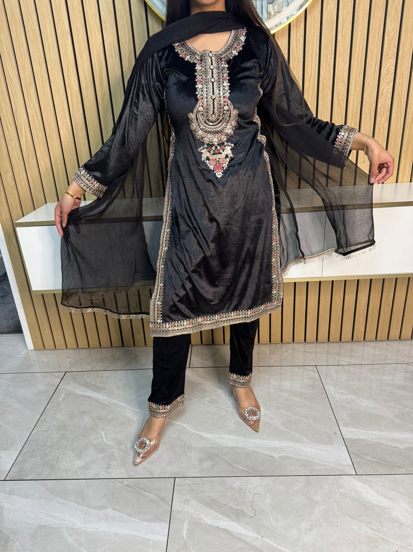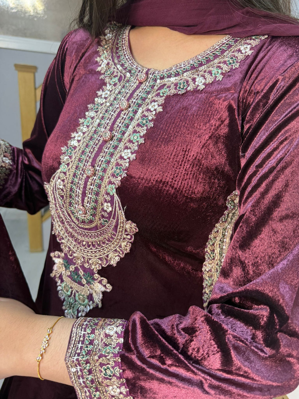 Product description:Introducing our exquisite 3-piece mother and daughter velvet collection, available in a spectrum of 4 stunning colors. This collection features a heavily embellished velvet kameez, adorned with intricate gold button detailing at the front, adding a touch of opulence and sophistication. The ensemble includes comfortable, plain trousers that perfectly complement the richness of the suit, and a flowing chiffon dupatta to complete the look. Ideal for special occasions, these matching outfits promise to make unforgettable memories, blending traditional elegance with contemporary style.